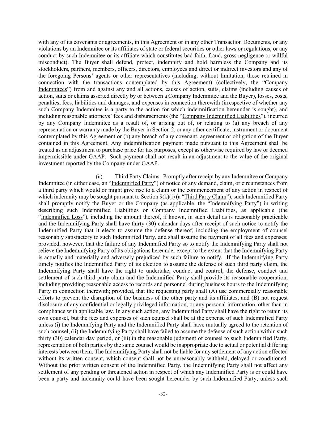 -32- with any of its covenants or agreements, in this Agreement or in any other Transaction Documents, or any violations by an Indemnitee or its affiliates of state or federal securities or other laws or regulations, or any conduct by such Indemnitee or its affiliate which constitutes bad faith, fraud, gross negligence or willful misconduct). The Buyer shall defend, protect, indemnify and hold harmless the Company and its stockholders, partners, members, officers, directors, employees and direct or indirect investors and any of the foregoing Persons’ agents or other representatives (including, without limitation, those retained in connection with the transactions contemplated by this Agreement) (collectively, the “Company Indemnitees”) from and against any and all actions, causes of action, suits, claims (including causes of action, suits or claims asserted directly by or between a Company Indemnitee and the Buyer), losses, costs, penalties, fees, liabilities and damages, and expenses in connection therewith (irrespective of whether any such Company Indemnitee is a party to the action for which indemnification hereunder is sought), and including reasonable attorneys’ fees and disbursements (the “Company Indemnified Liabilities”), incurred by any Company Indemnitee as a result of, or arising out of, or relating to (a) any breach of any representation or warranty made by the Buyer in Section 2, or any other certificate, instrument or document contemplated by this Agreement or (b) any breach of any covenant, agreement or obligation of the Buyer contained in this Agreement. Any indemnification payment made pursuant to this Agreement shall be treated as an adjustment to purchase price for tax purposes, except as otherwise required by law or deemed impermissible under GAAP. Such payment shall not result in an adjustment to the value of the original investment reported by the Company under GAAP. (ii) Third Party Claims. Promptly after receipt by any Indemnitee or Company Indemnitee (in either case, an “Indemnified Party”) of notice of any demand, claim, or circumstances from a third party which would or might give rise to a claim or the commencement of any action in respect of which indemnity may be sought pursuant to Section 9(k)(i) (a “Third Party Claim”), such Indemnified Party shall promptly notify the Buyer or the Company (as applicable, the “Indemnifying Party”) in writing describing such Indemnified Liabilities or Company Indemnified Liabilities, as applicable (the “Indemnified Loss”), including the amount thereof, if known, in such detail as is reasonably practicable and the Indemnifying Party shall have thirty (30) calendar days after receipt of such notice to notify the Indemnified Party that it elects to assume the defense thereof, including the employment of counsel reasonably satisfactory to such Indemnified Party, and shall assume the payment of all fees and expenses; provided, however, that the failure of any Indemnified Party so to notify the Indemnifying Party shall not relieve the Indemnifying Party of its obligations hereunder except to the extent that the Indemnifying Party is actually and materially and adversely prejudiced by such failure to notify. If the Indemnifying Party timely notifies the Indemnified Party of its election to assume the defense of such third party claim, the Indemnifying Party shall have the right to undertake, conduct and control, the defense, conduct and settlement of such third party claim and the Indemnified Party shall provide its reasonable cooperation, including providing reasonable access to records and personnel during business hours to the Indemnifying Party in connection therewith; provided, that the requesting party shall (A) use commercially reasonable efforts to prevent the disruption of the business of the other party and its affiliates, and (B) not request disclosure of any confidential or legally privileged information, or any personal information, other than in compliance with applicable law. In any such action, any Indemnified Party shall have the right to retain its own counsel, but the fees and expenses of such counsel shall be at the expense of such Indemnified Party unless (i) the Indemnifying Party and the Indemnified Party shall have mutually agreed to the retention of such counsel, (ii) the Indemnifying Party shall have failed to assume the defense of such action within such thirty (30) calendar day period, or (iii) in the reasonable judgment of counsel to such Indemnified Party, representation of both parties by the same counsel would be inappropriate due to actual or potential differing interests between them. The Indemnifying Party shall not be liable for any settlement of any action effected without its written consent, which consent shall not be unreasonably withheld, delayed or conditioned. Without the prior written consent of the Indemnified Party, the Indemnifying Party shall not affect any settlement of any pending or threatened action in respect of which any Indemnified Party is or could have been a party and indemnity could have been sought hereunder by such Indemnified Party, unless such