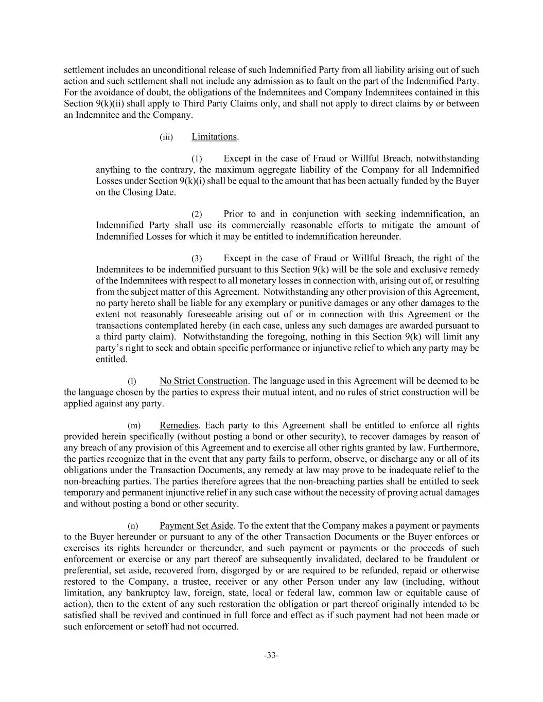 -33- settlement includes an unconditional release of such Indemnified Party from all liability arising out of such action and such settlement shall not include any admission as to fault on the part of the Indemnified Party. For the avoidance of doubt, the obligations of the Indemnitees and Company Indemnitees contained in this Section 9(k)(ii) shall apply to Third Party Claims only, and shall not apply to direct claims by or between an Indemnitee and the Company. (iii) Limitations. (1) Except in the case of Fraud or Willful Breach, notwithstanding anything to the contrary, the maximum aggregate liability of the Company for all Indemnified Losses under Section 9(k)(i) shall be equal to the amount that has been actually funded by the Buyer on the Closing Date. (2) Prior to and in conjunction with seeking indemnification, an Indemnified Party shall use its commercially reasonable efforts to mitigate the amount of Indemnified Losses for which it may be entitled to indemnification hereunder. (3) Except in the case of Fraud or Willful Breach, the right of the Indemnitees to be indemnified pursuant to this Section 9(k) will be the sole and exclusive remedy of the Indemnitees with respect to all monetary losses in connection with, arising out of, or resulting from the subject matter of this Agreement. Notwithstanding any other provision of this Agreement, no party hereto shall be liable for any exemplary or punitive damages or any other damages to the extent not reasonably foreseeable arising out of or in connection with this Agreement or the transactions contemplated hereby (in each case, unless any such damages are awarded pursuant to a third party claim). Notwithstanding the foregoing, nothing in this Section 9(k) will limit any party’s right to seek and obtain specific performance or injunctive relief to which any party may be entitled. (l) No Strict Construction. The language used in this Agreement will be deemed to be the language chosen by the parties to express their mutual intent, and no rules of strict construction will be applied against any party. (m) Remedies. Each party to this Agreement shall be entitled to enforce all rights provided herein specifically (without posting a bond or other security), to recover damages by reason of any breach of any provision of this Agreement and to exercise all other rights granted by law. Furthermore, the parties recognize that in the event that any party fails to perform, observe, or discharge any or all of its obligations under the Transaction Documents, any remedy at law may prove to be inadequate relief to the non-breaching parties. The parties therefore agrees that the non-breaching parties shall be entitled to seek temporary and permanent injunctive relief in any such case without the necessity of proving actual damages and without posting a bond or other security. (n) Payment Set Aside. To the extent that the Company makes a payment or payments to the Buyer hereunder or pursuant to any of the other Transaction Documents or the Buyer enforces or exercises its rights hereunder or thereunder, and such payment or payments or the proceeds of such enforcement or exercise or any part thereof are subsequently invalidated, declared to be fraudulent or preferential, set aside, recovered from, disgorged by or are required to be refunded, repaid or otherwise restored to the Company, a trustee, receiver or any other Person under any law (including, without limitation, any bankruptcy law, foreign, state, local or federal law, common law or equitable cause of action), then to the extent of any such restoration the obligation or part thereof originally intended to be satisfied shall be revived and continued in full force and effect as if such payment had not been made or such enforcement or setoff had not occurred.