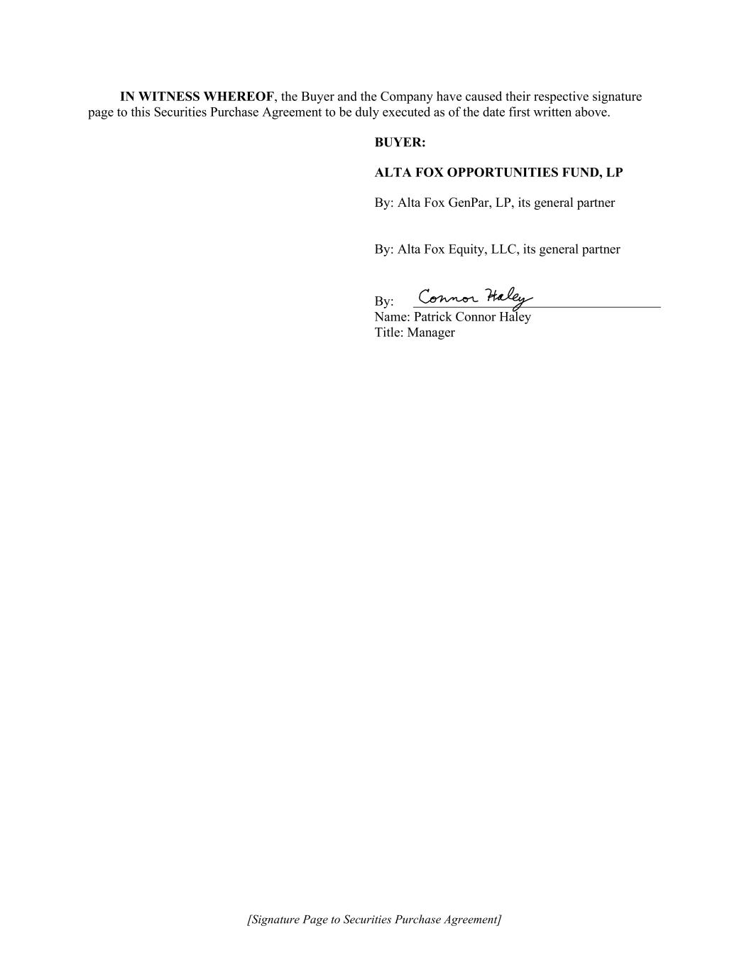 [Signature Page to Securities Purchase Agreement] IN WITNESS WHEREOF, the Buyer and the Company have caused their respective signature page to this Securities Purchase Agreement to be duly executed as of the date first written above. BUYER: ALTA FOX OPPORTUNITIES FUND, LP By: Alta Fox GenPar, LP, its general partner By: Alta Fox Equity, LLC, its general partner By: Name: Patrick Connor Haley Title: Manager