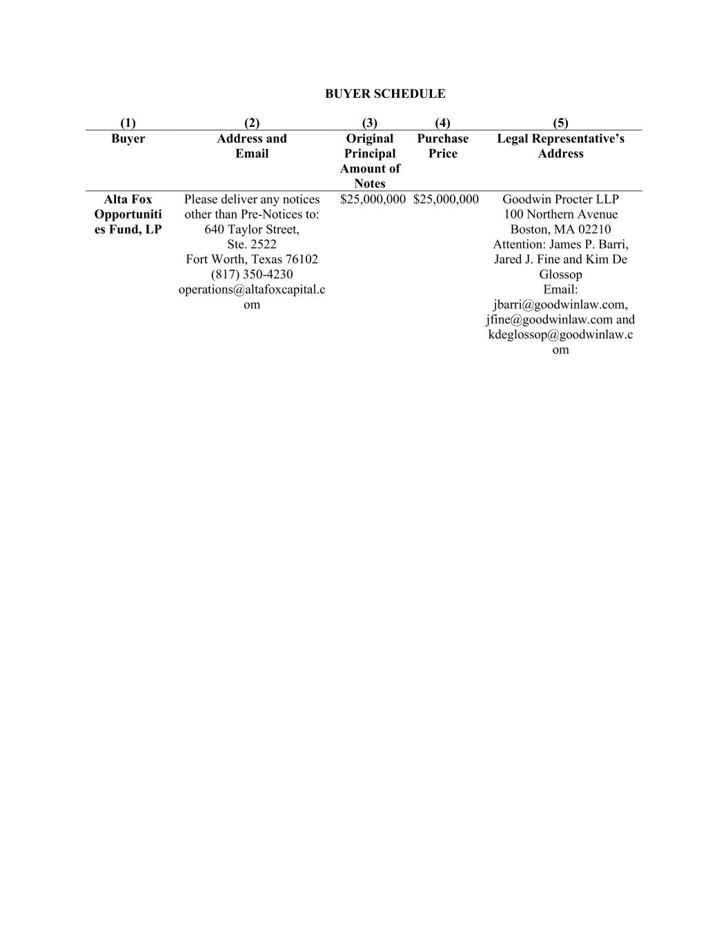 BUYER SCHEDULE (1) (2) (3) (4) (5) Buyer Address and Email Original Principal Amount of Notes Purchase Price Legal Representative’s Address Alta Fox Opportuniti es Fund, LP Please deliver any notices other than Pre-Notices to: 640 Taylor Street, Ste. 2522 Fort Worth, Texas 76102 (817) 350-4230 operations@altafoxcapital.c om $25,000,000 $25,000,000 Goodwin Procter LLP 100 Northern Avenue Boston, MA 02210 Attention: James P. Barri, Jared J. Fine and Kim De Glossop Email: jbarri@goodwinlaw.com, jfine@goodwinlaw.com and kdeglossop@goodwinlaw.c om