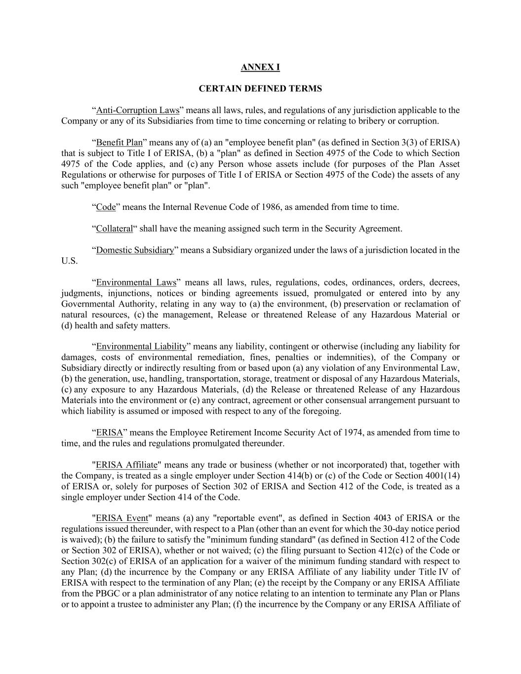 ANNEX I CERTAIN DEFINED TERMS “Anti-Corruption Laws” means all laws, rules, and regulations of any jurisdiction applicable to the Company or any of its Subsidiaries from time to time concerning or relating to bribery or corruption. “Benefit Plan” means any of (a) an "employee benefit plan" (as defined in Section 3(3) of ERISA) that is subject to Title I of ERISA, (b) a "plan" as defined in Section 4975 of the Code to which Section 4975 of the Code applies, and (c) any Person whose assets include (for purposes of the Plan Asset Regulations or otherwise for purposes of Title I of ERISA or Section 4975 of the Code) the assets of any such "employee benefit plan" or "plan". “Code” means the Internal Revenue Code of 1986, as amended from time to time. “Collateral“ shall have the meaning assigned such term in the Security Agreement. “Domestic Subsidiary” means a Subsidiary organized under the laws of a jurisdiction located in the U.S. “Environmental Laws” means all laws, rules, regulations, codes, ordinances, orders, decrees, judgments, injunctions, notices or binding agreements issued, promulgated or entered into by any Governmental Authority, relating in any way to (a) the environment, (b) preservation or reclamation of natural resources, (c) the management, Release or threatened Release of any Hazardous Material or (d) health and safety matters. “Environmental Liability” means any liability, contingent or otherwise (including any liability for damages, costs of environmental remediation, fines, penalties or indemnities), of the Company or Subsidiary directly or indirectly resulting from or based upon (a) any violation of any Environmental Law, (b) the generation, use, handling, transportation, storage, treatment or disposal of any Hazardous Materials, (c) any exposure to any Hazardous Materials, (d) the Release or threatened Release of any Hazardous Materials into the environment or (e) any contract, agreement or other consensual arrangement pursuant to which liability is assumed or imposed with respect to any of the foregoing. “ERISA” means the Employee Retirement Income Security Act of 1974, as amended from time to time, and the rules and regulations promulgated thereunder. "ERISA Affiliate" means any trade or business (whether or not incorporated) that, together with the Company, is treated as a single employer under Section 414(b) or (c) of the Code or Section 4001(14) of ERISA or, solely for purposes of Section 302 of ERISA and Section 412 of the Code, is treated as a single employer under Section 414 of the Code. "ERISA Event" means (a) any "reportable event", as defined in Section 4043 of ERISA or the regulations issued thereunder, with respect to a Plan (other than an event for which the 30-day notice period is waived); (b) the failure to satisfy the "minimum funding standard" (as defined in Section 412 of the Code or Section 302 of ERISA), whether or not waived; (c) the filing pursuant to Section 412(c) of the Code or Section 302(c) of ERISA of an application for a waiver of the minimum funding standard with respect to any Plan; (d) the incurrence by the Company or any ERISA Affiliate of any liability under Title IV of ERISA with respect to the termination of any Plan; (e) the receipt by the Company or any ERISA Affiliate from the PBGC or a plan administrator of any notice relating to an intention to terminate any Plan or Plans or to appoint a trustee to administer any Plan; (f) the incurrence by the Company or any ERISA Affiliate of