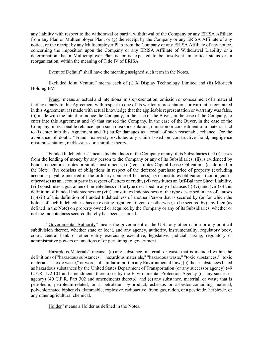 any liability with respect to the withdrawal or partial withdrawal of the Company or any ERISA Affiliate from any Plan or Multiemployer Plan; or (g) the receipt by the Company or any ERISA Affiliate of any notice, or the receipt by any Multiemployer Plan from the Company or any ERISA Affiliate of any notice, concerning the imposition upon the Company or any ERISA Affiliate of Withdrawal Liability or a determination that a Multiemployer Plan is, or is expected to be, insolvent, in critical status or in reorganization, within the meaning of Title IV of ERISA. “Event of Default” shall have the meaning assigned such term in the Notes. “Excluded Joint Venture” means each of (i) X Display Technology Limited and (ii) Miortech Holding BV. “Fraud” means an actual and intentional misrepresentation, omission or concealment of a material fact by a party to this Agreement with respect to one of its written representations or warranties contained in this Agreement, (a) made with actual knowledge that the applicable representation or warranty was false, (b) made with the intent to induce the Company, in the case of the Buyer, in the case of the Company, to enter into this Agreement and (c) that caused the Company, in the case of the Buyer, in the case of the Company, in reasonable reliance upon such misrepresentation, omission or concealment of a material fact to (i) enter into this Agreement and (ii) suffer damages as a result of such reasonable reliance. For the avoidance of doubt, “Fraud” expressly excludes any claim based on constructive fraud, negligence misrepresentation, recklessness or a similar theory. “Funded Indebtedness” means Indebtedness of the Company or any of its Subsidiaries that (i) arises from the lending of money by any person to the Company or any of its Subsidiaries, (ii) is evidenced by bonds, debentures, notes or similar instruments, (iii) constitutes Capital Lease Obligations (as defined in the Note), (iv) consists of obligations in respect of the deferred purchase price of property (excluding accounts payable incurred in the ordinary course of business), (v) constitutes obligations (contingent or otherwise) as an account party in respect of letters of credit, (vi) constitutes an Off-Balance Sheet Liability, (vii) constitutes a guarantee of Indebtedness of the type described in any of clauses (i)-(vi) and (viii) of this definition of Funded Indebtedness or (viii) constitutes Indebtedness of the type described in any of clauses (i)-(vii) of this definition of Funded Indebtedness of another Person that is secured by (or for which the holder of such Indebtedness has an existing right, contingent or otherwise, to be secured by) any Lien (as defined in the Note) on property owned or acquired by the Company or any of its Subsidiaries, whether or not the Indebtedness secured thereby has been assumed. “Governmental Authority” means the government of the U.S., any other nation or any political subdivision thereof, whether state or local, and any agency, authority, instrumentality, regulatory body, court, central bank or other entity exercising executive, legislative, judicial, taxing, regulatory or administrative powers or functions of or pertaining to government. “Hazardous Materials” means: (a) any substance, material, or waste that is included within the definitions of "hazardous substances," "hazardous materials," "hazardous waste," "toxic substances," "toxic materials," "toxic waste," or words of similar import in any Environmental Law; (b) those substances listed as hazardous substances by the United States Department of Transportation (or any successor agency) (49 C.F.R. 172.101 and amendments thereto) or by the Environmental Protection Agency (or any successor agency) (40 C.F.R. Part 302 and amendments thereto); and (c) any substance, material, or waste that is petroleum, petroleum-related, or a petroleum by-product, asbestos or asbestos-containing material, polychlorinated biphenyls, flammable, explosive, radioactive, freon gas, radon, or a pesticide, herbicide, or any other agricultural chemical. “Holder” means a Holder as defined in the Notes.