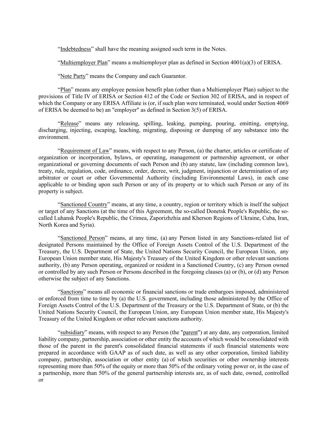 “Indebtedness” shall have the meaning assigned such term in the Notes. “Multiemployer Plan” means a multiemployer plan as defined in Section 4001(a)(3) of ERISA. “Note Party” means the Company and each Guarantor. “Plan” means any employee pension benefit plan (other than a Multiemployer Plan) subject to the provisions of Title IV of ERISA or Section 412 of the Code or Section 302 of ERISA, and in respect of which the Company or any ERISA Affiliate is (or, if such plan were terminated, would under Section 4069 of ERISA be deemed to be) an "employer" as defined in Section 3(5) of ERISA. “Release” means any releasing, spilling, leaking, pumping, pouring, emitting, emptying, discharging, injecting, escaping, leaching, migrating, disposing or dumping of any substance into the environment. “Requirement of Law” means, with respect to any Person, (a) the charter, articles or certificate of organization or incorporation, bylaws, or operating, management or partnership agreement, or other organizational or governing documents of such Person and (b) any statute, law (including common law), treaty, rule, regulation, code, ordinance, order, decree, writ, judgment, injunction or determination of any arbitrator or court or other Governmental Authority (including Environmental Laws), in each case applicable to or binding upon such Person or any of its property or to which such Person or any of its property is subject. “Sanctioned Country” means, at any time, a country, region or territory which is itself the subject or target of any Sanctions (at the time of this Agreement, the so-called Donetsk People's Republic, the so- called Luhansk People's Republic, the Crimea, Zaporizhzhia and Kherson Regions of Ukraine, Cuba, Iran, North Korea and Syria). “Sanctioned Person” means, at any time, (a) any Person listed in any Sanctions-related list of designated Persons maintained by the Office of Foreign Assets Control of the U.S. Department of the Treasury, the U.S. Department of State, the United Nations Security Council, the European Union, any European Union member state, His Majesty's Treasury of the United Kingdom or other relevant sanctions authority, (b) any Person operating, organized or resident in a Sanctioned Country, (c) any Person owned or controlled by any such Person or Persons described in the foregoing clauses (a) or (b), or (d) any Person otherwise the subject of any Sanctions. “Sanctions” means all economic or financial sanctions or trade embargoes imposed, administered or enforced from time to time by (a) the U.S. government, including those administered by the Office of Foreign Assets Control of the U.S. Department of the Treasury or the U.S. Department of State, or (b) the United Nations Security Council, the European Union, any European Union member state, His Majesty's Treasury of the United Kingdom or other relevant sanctions authority. “subsidiary” means, with respect to any Person (the "parent") at any date, any corporation, limited liability company, partnership, association or other entity the accounts of which would be consolidated with those of the parent in the parent's consolidated financial statements if such financial statements were prepared in accordance with GAAP as of such date, as well as any other corporation, limited liability company, partnership, association or other entity (a) of which securities or other ownership interests representing more than 50% of the equity or more than 50% of the ordinary voting power or, in the case of a partnership, more than 50% of the general partnership interests are, as of such date, owned, controlled or