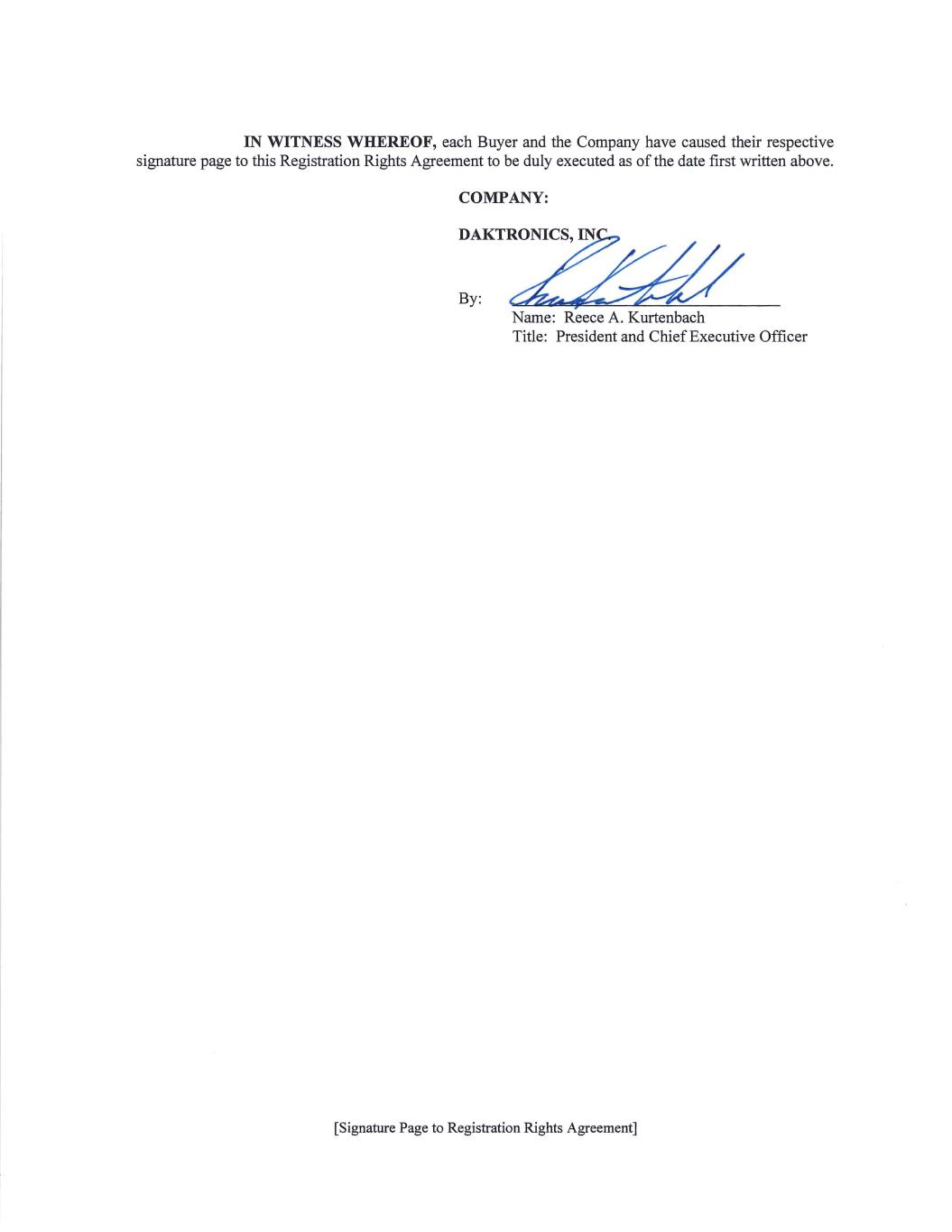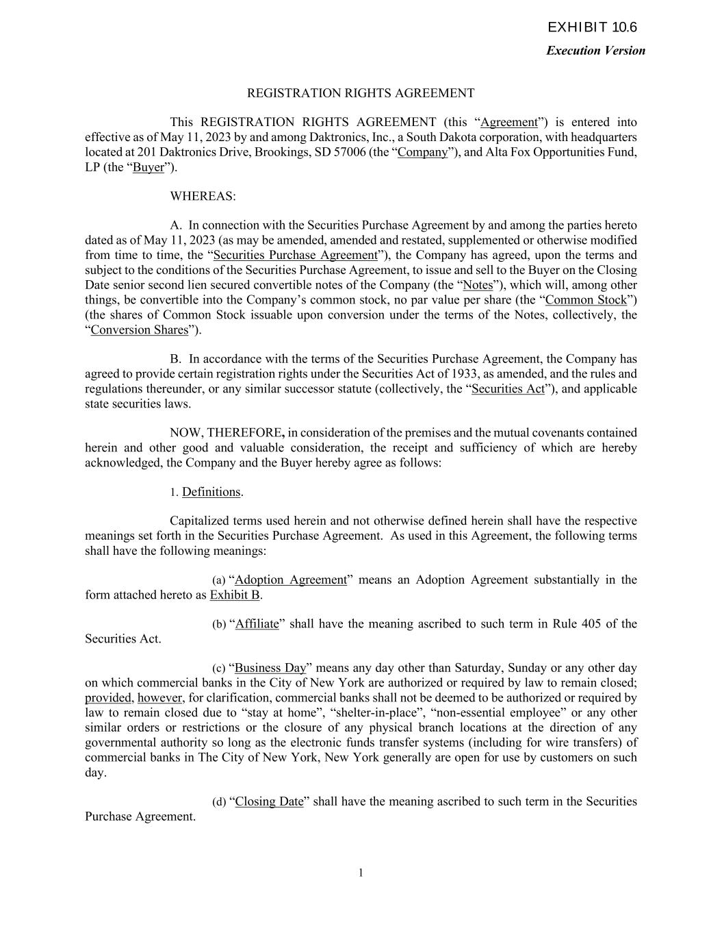 Execution Version REGISTRATION RIGHTS AGREEMENT This REGISTRATION RIGHTS AGREEMENT (this “Agreement”) is entered into effective as of May 11, 2023 by and among Daktronics, Inc., a South Dakota corporation, with headquarters located at 201 Daktronics Drive, Brookings, SD 57006 (the “Company”), and Alta Fox Opportunities Fund, LP (the “Buyer”). WHEREAS: A. In connection with the Securities Purchase Agreement by and among the parties hereto dated as of May 11, 2023 (as may be amended, amended and restated, supplemented or otherwise modified from time to time, the “Securities Purchase Agreement”), the Company has agreed, upon the terms and subject to the conditions of the Securities Purchase Agreement, to issue and sell to the Buyer on the Closing Date senior second lien secured convertible notes of the Company (the “Notes”), which will, among other things, be convertible into the Company’s common stock, no par value per share (the “Common Stock”) (the shares of Common Stock issuable upon conversion under the terms of the Notes, collectively, the “Conversion Shares”). B. In accordance with the terms of the Securities Purchase Agreement, the Company has agreed to provide certain registration rights under the Securities Act of 1933, as amended, and the rules and regulations thereunder, or any similar successor statute (collectively, the “Securities Act”), and applicable state securities laws. NOW, THEREFORE, in consideration of the premises and the mutual covenants contained herein and other good and valuable consideration, the receipt and sufficiency of which are hereby acknowledged, the Company and the Buyer hereby agree as follows: 1. Definitions. Capitalized terms used herein and not otherwise defined herein shall have the respective meanings set forth in the Securities Purchase Agreement. As used in this Agreement, the following terms shall have the following meanings: (a) “Adoption Agreement” means an Adoption Agreement substantially in the form attached hereto as Exhibit B. (b) “Affiliate” shall have the meaning ascribed to such term in Rule 405 of the Securities Act. (c) “Business Day” means any day other than Saturday, Sunday or any other day on which commercial banks in the City of New York are authorized or required by law to remain closed; provided, however, for clarification, commercial banks shall not be deemed to be authorized or required by law to remain closed due to “stay at home”, “shelter-in-place”, “non-essential employee” or any other similar orders or restrictions or the closure of any physical branch locations at the direction of any governmental authority so long as the electronic funds transfer systems (including for wire transfers) of commercial banks in The City of New York, New York generally are open for use by customers on such day. (d) “Closing Date” shall have the meaning ascribed to such term in the Securities Purchase Agreement. 1 EXHIBIT 10.6