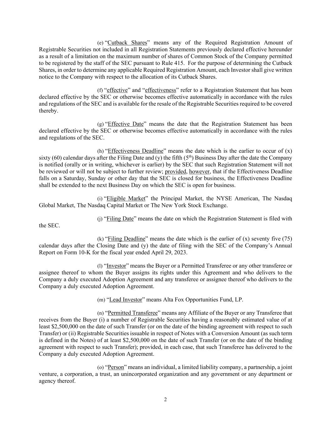 2 (e) “Cutback Shares” means any of the Required Registration Amount of Registrable Securities not included in all Registration Statements previously declared effective hereunder as a result of a limitation on the maximum number of shares of Common Stock of the Company permitted to be registered by the staff of the SEC pursuant to Rule 415. For the purpose of determining the Cutback Shares, in order to determine any applicable Required Registration Amount, each Investor shall give written notice to the Company with respect to the allocation of its Cutback Shares. (f) “effective” and “effectiveness” refer to a Registration Statement that has been declared effective by the SEC or otherwise becomes effective automatically in accordance with the rules and regulations of the SEC and is available for the resale of the Registrable Securities required to be covered thereby. (g) “Effective Date” means the date that the Registration Statement has been declared effective by the SEC or otherwise becomes effective automatically in accordance with the rules and regulations of the SEC. (h) “Effectiveness Deadline” means the date which is the earlier to occur of (x) sixty (60) calendar days after the Filing Date and (y) the fifth (5th) Business Day after the date the Company is notified (orally or in writing, whichever is earlier) by the SEC that such Registration Statement will not be reviewed or will not be subject to further review; provided, however, that if the Effectiveness Deadline falls on a Saturday, Sunday or other day that the SEC is closed for business, the Effectiveness Deadline shall be extended to the next Business Day on which the SEC is open for business. (i) “Eligible Market” the Principal Market, the NYSE American, The Nasdaq Global Market, The Nasdaq Capital Market or The New York Stock Exchange. (j) “Filing Date” means the date on which the Registration Statement is filed with the SEC. (k) “Filing Deadline” means the date which is the earlier of (x) seventy five (75) calendar days after the Closing Date and (y) the date of filing with the SEC of the Company’s Annual Report on Form 10-K for the fiscal year ended April 29, 2023. (l) “Investor” means the Buyer or a Permitted Transferee or any other transferee or assignee thereof to whom the Buyer assigns its rights under this Agreement and who delivers to the Company a duly executed Adoption Agreement and any transferee or assignee thereof who delivers to the Company a duly executed Adoption Agreement. (m) “Lead Investor” means Alta Fox Opportunities Fund, LP. (n) “Permitted Transferee” means any Affiliate of the Buyer or any Transferee that receives from the Buyer (i) a number of Registrable Securities having a reasonably estimated value of at least $2,500,000 on the date of such Transfer (or on the date of the binding agreement with respect to such Transfer) or (ii) Registrable Securities issuable in respect of Notes with a Conversion Amount (as such term is defined in the Notes) of at least $2,500,000 on the date of such Transfer (or on the date of the binding agreement with respect to such Transfer); provided, in each case, that such Transferee has delivered to the Company a duly executed Adoption Agreement. (o) “Person” means an individual, a limited liability company, a partnership, a joint venture, a corporation, a trust, an unincorporated organization and any government or any department or agency thereof.