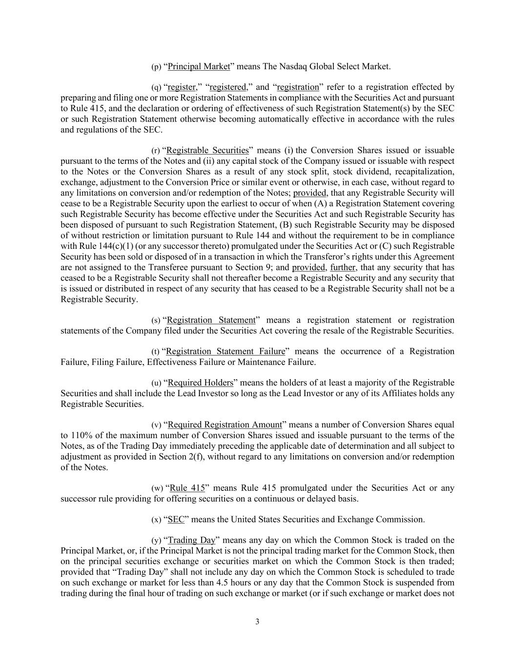 3 (p) “Principal Market” means The Nasdaq Global Select Market. (q) “register,” “registered,” and “registration” refer to a registration effected by preparing and filing one or more Registration Statements in compliance with the Securities Act and pursuant to Rule 415, and the declaration or ordering of effectiveness of such Registration Statement(s) by the SEC or such Registration Statement otherwise becoming automatically effective in accordance with the rules and regulations of the SEC. (r) “Registrable Securities” means (i) the Conversion Shares issued or issuable pursuant to the terms of the Notes and (ii) any capital stock of the Company issued or issuable with respect to the Notes or the Conversion Shares as a result of any stock split, stock dividend, recapitalization, exchange, adjustment to the Conversion Price or similar event or otherwise, in each case, without regard to any limitations on conversion and/or redemption of the Notes; provided, that any Registrable Security will cease to be a Registrable Security upon the earliest to occur of when (A) a Registration Statement covering such Registrable Security has become effective under the Securities Act and such Registrable Security has been disposed of pursuant to such Registration Statement, (B) such Registrable Security may be disposed of without restriction or limitation pursuant to Rule 144 and without the requirement to be in compliance with Rule 144(c)(1) (or any successor thereto) promulgated under the Securities Act or (C) such Registrable Security has been sold or disposed of in a transaction in which the Transferor’s rights under this Agreement are not assigned to the Transferee pursuant to Section 9; and provided, further, that any security that has ceased to be a Registrable Security shall not thereafter become a Registrable Security and any security that is issued or distributed in respect of any security that has ceased to be a Registrable Security shall not be a Registrable Security. (s) “Registration Statement” means a registration statement or registration statements of the Company filed under the Securities Act covering the resale of the Registrable Securities. (t) “Registration Statement Failure” means the occurrence of a Registration Failure, Filing Failure, Effectiveness Failure or Maintenance Failure. (u) “Required Holders” means the holders of at least a majority of the Registrable Securities and shall include the Lead Investor so long as the Lead Investor or any of its Affiliates holds any Registrable Securities. (v) “Required Registration Amount” means a number of Conversion Shares equal to 110% of the maximum number of Conversion Shares issued and issuable pursuant to the terms of the Notes, as of the Trading Day immediately preceding the applicable date of determination and all subject to adjustment as provided in Section 2(f), without regard to any limitations on conversion and/or redemption of the Notes. (w) “Rule 415” means Rule 415 promulgated under the Securities Act or any successor rule providing for offering securities on a continuous or delayed basis. (x) “SEC” means the United States Securities and Exchange Commission. (y) “Trading Day” means any day on which the Common Stock is traded on the Principal Market, or, if the Principal Market is not the principal trading market for the Common Stock, then on the principal securities exchange or securities market on which the Common Stock is then traded; provided that “Trading Day” shall not include any day on which the Common Stock is scheduled to trade on such exchange or market for less than 4.5 hours or any day that the Common Stock is suspended from trading during the final hour of trading on such exchange or market (or if such exchange or market does not