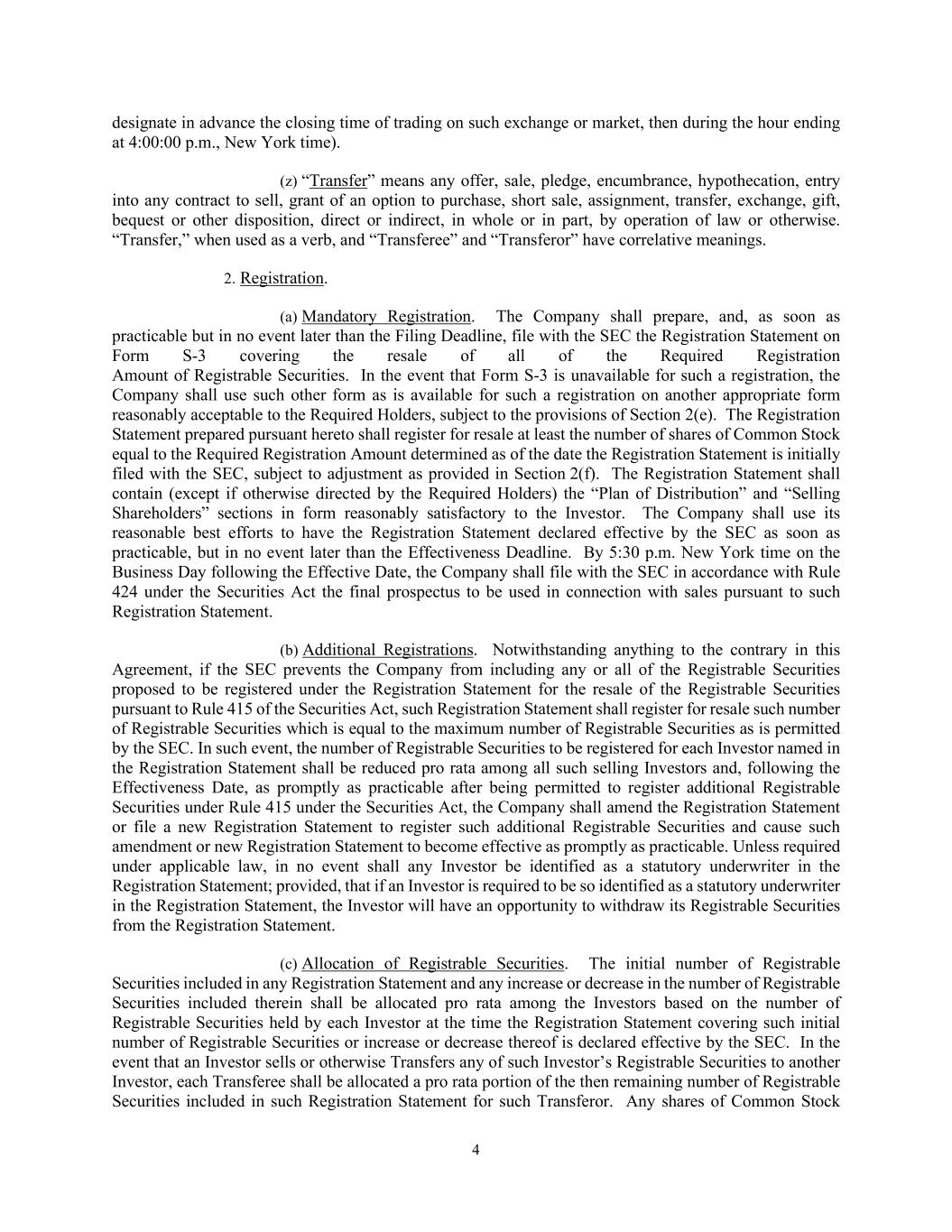 4 designate in advance the closing time of trading on such exchange or market, then during the hour ending at 4:00:00 p.m., New York time). (z) “Transfer” means any offer, sale, pledge, encumbrance, hypothecation, entry into any contract to sell, grant of an option to purchase, short sale, assignment, transfer, exchange, gift, bequest or other disposition, direct or indirect, in whole or in part, by operation of law or otherwise. “Transfer,” when used as a verb, and “Transferee” and “Transferor” have correlative meanings. 2. Registration. (a) Mandatory Registration. The Company shall prepare, and, as soon as practicable but in no event later than the Filing Deadline, file with the SEC the Registration Statement on Form S-3 covering the resale of all of the Required Registration Amount of Registrable Securities. In the event that Form S-3 is unavailable for such a registration, the Company shall use such other form as is available for such a registration on another appropriate form reasonably acceptable to the Required Holders, subject to the provisions of Section 2(e). The Registration Statement prepared pursuant hereto shall register for resale at least the number of shares of Common Stock equal to the Required Registration Amount determined as of the date the Registration Statement is initially filed with the SEC, subject to adjustment as provided in Section 2(f). The Registration Statement shall contain (except if otherwise directed by the Required Holders) the “Plan of Distribution” and “Selling Shareholders” sections in form reasonably satisfactory to the Investor. The Company shall use its reasonable best efforts to have the Registration Statement declared effective by the SEC as soon as practicable, but in no event later than the Effectiveness Deadline. By 5:30 p.m. New York time on the Business Day following the Effective Date, the Company shall file with the SEC in accordance with Rule 424 under the Securities Act the final prospectus to be used in connection with sales pursuant to such Registration Statement. (b) Additional Registrations. Notwithstanding anything to the contrary in this Agreement, if the SEC prevents the Company from including any or all of the Registrable Securities proposed to be registered under the Registration Statement for the resale of the Registrable Securities pursuant to Rule 415 of the Securities Act, such Registration Statement shall register for resale such number of Registrable Securities which is equal to the maximum number of Registrable Securities as is permitted by the SEC. In such event, the number of Registrable Securities to be registered for each Investor named in the Registration Statement shall be reduced pro rata among all such selling Investors and, following the Effectiveness Date, as promptly as practicable after being permitted to register additional Registrable Securities under Rule 415 under the Securities Act, the Company shall amend the Registration Statement or file a new Registration Statement to register such additional Registrable Securities and cause such amendment or new Registration Statement to become effective as promptly as practicable. Unless required under applicable law, in no event shall any Investor be identified as a statutory underwriter in the Registration Statement; provided, that if an Investor is required to be so identified as a statutory underwriter in the Registration Statement, the Investor will have an opportunity to withdraw its Registrable Securities from the Registration Statement. (c) Allocation of Registrable Securities. The initial number of Registrable Securities included in any Registration Statement and any increase or decrease in the number of Registrable Securities included therein shall be allocated pro rata among the Investors based on the number of Registrable Securities held by each Investor at the time the Registration Statement covering such initial number of Registrable Securities or increase or decrease thereof is declared effective by the SEC. In the event that an Investor sells or otherwise Transfers any of such Investor’s Registrable Securities to another Investor, each Transferee shall be allocated a pro rata portion of the then remaining number of Registrable Securities included in such Registration Statement for such Transferor. Any shares of Common Stock