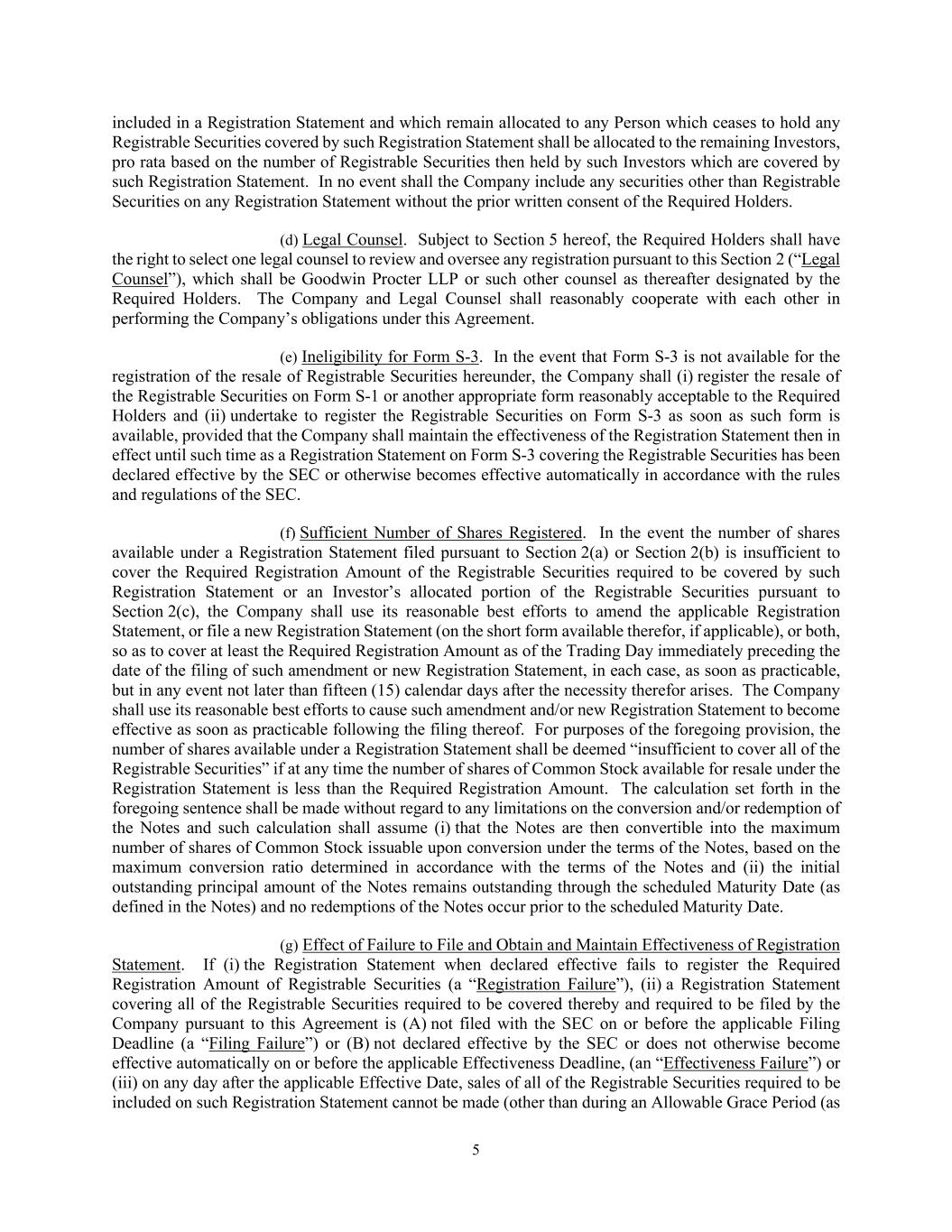 5 included in a Registration Statement and which remain allocated to any Person which ceases to hold any Registrable Securities covered by such Registration Statement shall be allocated to the remaining Investors, pro rata based on the number of Registrable Securities then held by such Investors which are covered by such Registration Statement. In no event shall the Company include any securities other than Registrable Securities on any Registration Statement without the prior written consent of the Required Holders. (d) Legal Counsel. Subject to Section 5 hereof, the Required Holders shall have the right to select one legal counsel to review and oversee any registration pursuant to this Section 2 (“Legal Counsel”), which shall be Goodwin Procter LLP or such other counsel as thereafter designated by the Required Holders. The Company and Legal Counsel shall reasonably cooperate with each other in performing the Company’s obligations under this Agreement. (e) Ineligibility for Form S-3. In the event that Form S-3 is not available for the registration of the resale of Registrable Securities hereunder, the Company shall (i) register the resale of the Registrable Securities on Form S-1 or another appropriate form reasonably acceptable to the Required Holders and (ii) undertake to register the Registrable Securities on Form S-3 as soon as such form is available, provided that the Company shall maintain the effectiveness of the Registration Statement then in effect until such time as a Registration Statement on Form S-3 covering the Registrable Securities has been declared effective by the SEC or otherwise becomes effective automatically in accordance with the rules and regulations of the SEC. (f) Sufficient Number of Shares Registered. In the event the number of shares available under a Registration Statement filed pursuant to Section 2(a) or Section 2(b) is insufficient to cover the Required Registration Amount of the Registrable Securities required to be covered by such Registration Statement or an Investor’s allocated portion of the Registrable Securities pursuant to Section 2(c), the Company shall use its reasonable best efforts to amend the applicable Registration Statement, or file a new Registration Statement (on the short form available therefor, if applicable), or both, so as to cover at least the Required Registration Amount as of the Trading Day immediately preceding the date of the filing of such amendment or new Registration Statement, in each case, as soon as practicable, but in any event not later than fifteen (15) calendar days after the necessity therefor arises. The Company shall use its reasonable best efforts to cause such amendment and/or new Registration Statement to become effective as soon as practicable following the filing thereof. For purposes of the foregoing provision, the number of shares available under a Registration Statement shall be deemed “insufficient to cover all of the Registrable Securities” if at any time the number of shares of Common Stock available for resale under the Registration Statement is less than the Required Registration Amount. The calculation set forth in the foregoing sentence shall be made without regard to any limitations on the conversion and/or redemption of the Notes and such calculation shall assume (i) that the Notes are then convertible into the maximum number of shares of Common Stock issuable upon conversion under the terms of the Notes, based on the maximum conversion ratio determined in accordance with the terms of the Notes and (ii) the initial outstanding principal amount of the Notes remains outstanding through the scheduled Maturity Date (as defined in the Notes) and no redemptions of the Notes occur prior to the scheduled Maturity Date. (g) Effect of Failure to File and Obtain and Maintain Effectiveness of Registration Statement. If (i) the Registration Statement when declared effective fails to register the Required Registration Amount of Registrable Securities (a “Registration Failure”), (ii) a Registration Statement covering all of the Registrable Securities required to be covered thereby and required to be filed by the Company pursuant to this Agreement is (A) not filed with the SEC on or before the applicable Filing Deadline (a “Filing Failure”) or (B) not declared effective by the SEC or does not otherwise become effective automatically on or before the applicable Effectiveness Deadline, (an “Effectiveness Failure”) or (iii) on any day after the applicable Effective Date, sales of all of the Registrable Securities required to be included on such Registration Statement cannot be made (other than during an Allowable Grace Period (as