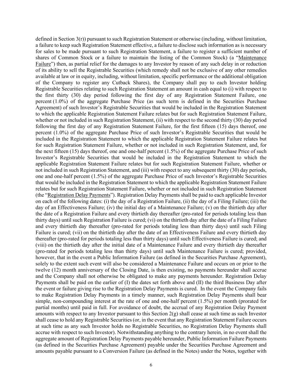 6 defined in Section 3(r)) pursuant to such Registration Statement or otherwise (including, without limitation, a failure to keep such Registration Statement effective, a failure to disclose such information as is necessary for sales to be made pursuant to such Registration Statement, a failure to register a sufficient number of shares of Common Stock or a failure to maintain the listing of the Common Stock) (a “Maintenance Failure”) then, as partial relief for the damages to any Investor by reason of any such delay in or reduction of its ability to sell the Registrable Securities (which remedy shall not be exclusive of any other remedies available at law or in equity, including, without limitation, specific performance or the additional obligation of the Company to register any Cutback Shares), the Company shall pay to each Investor holding Registrable Securities relating to such Registration Statement an amount in cash equal to (i) with respect to the first thirty (30) day period following the first day of any Registration Statement Failure, one percent (1.0%) of the aggregate Purchase Price (as such term is defined in the Securities Purchase Agreement) of such Investor’s Registrable Securities that would be included in the Registration Statement to which the applicable Registration Statement Failure relates but for such Registration Statement Failure, whether or not included in such Registration Statement, (ii) with respect to the second thirty (30) day period following the first day of any Registration Statement Failure, for the first fifteen (15) days thereof, one percent (1.0%) of the aggregate Purchase Price of such Investor’s Registrable Securities that would be included in the Registration Statement to which the applicable Registration Statement Failure relates but for such Registration Statement Failure, whether or not included in such Registration Statement, and, for the next fifteen (15) days thereof, one and one-half percent (1.5%) of the aggregate Purchase Price of such Investor’s Registrable Securities that would be included in the Registration Statement to which the applicable Registration Statement Failure relates but for such Registration Statement Failure, whether or not included in such Registration Statement, and (iii) with respect to any subsequent thirty (30) day periods, one and one-half percent (1.5%) of the aggregate Purchase Price of such Investor’s Registrable Securities that would be included in the Registration Statement to which the applicable Registration Statement Failure relates but for such Registration Statement Failure, whether or not included in such Registration Statement (the “Registration Delay Payments”). Registration Delay Payments shall be paid to each applicable Investor on each of the following dates: (i) the day of a Registration Failure, (ii) the day of a Filing Failure; (iii) the day of an Effectiveness Failure; (iv) the initial day of a Maintenance Failure; (v) on the thirtieth day after the date of a Registration Failure and every thirtieth day thereafter (pro-rated for periods totaling less than thirty days) until such Registration Failure is cured; (vi) on the thirtieth day after the date of a Filing Failure and every thirtieth day thereafter (pro-rated for periods totaling less than thirty days) until such Filing Failure is cured; (vii) on the thirtieth day after the date of an Effectiveness Failure and every thirtieth day thereafter (pro-rated for periods totaling less than thirty days) until such Effectiveness Failure is cured; and (viii) on the thirtieth day after the initial date of a Maintenance Failure and every thirtieth day thereafter (pro-rated for periods totaling less than thirty days) until such Maintenance Failure is cured; provided, however, that in the event a Public Information Failure (as defined in the Securities Purchase Agreement), solely to the extent such event will also be considered a Maintenance Failure and occurs on or prior to the twelve (12) month anniversary of the Closing Date, is then existing, no payments hereunder shall accrue and the Company shall not otherwise be obligated to make any payments hereunder. Registration Delay Payments shall be paid on the earlier of (I) the dates set forth above and (II) the third Business Day after the event or failure giving rise to the Registration Delay Payments is cured. In the event the Company fails to make Registration Delay Payments in a timely manner, such Registration Delay Payments shall bear simple, non-compounding interest at the rate of one and one-half percent (1.5%) per month (prorated for partial months) until paid in full. For avoidance of doubt, the accrual of any Registration Delay Payment amounts with respect to any Investor pursuant to this Section 2(g) shall cease at such time as such Investor shall cease to hold any Registrable Securities (or, in the event that any Registration Statement Failure occurs at such time as any such Investor holds no Registrable Securities, no Registration Delay Payments shall accrue with respect to such Investor). Notwithstanding anything to the contrary herein, in no event shall the aggregate amount of Registration Delay Payments payable hereunder, Public Information Failure Payments (as defined in the Securities Purchase Agreement) payable under the Securities Purchase Agreement and amounts payable pursuant to a Conversion Failure (as defined in the Notes) under the Notes, together with