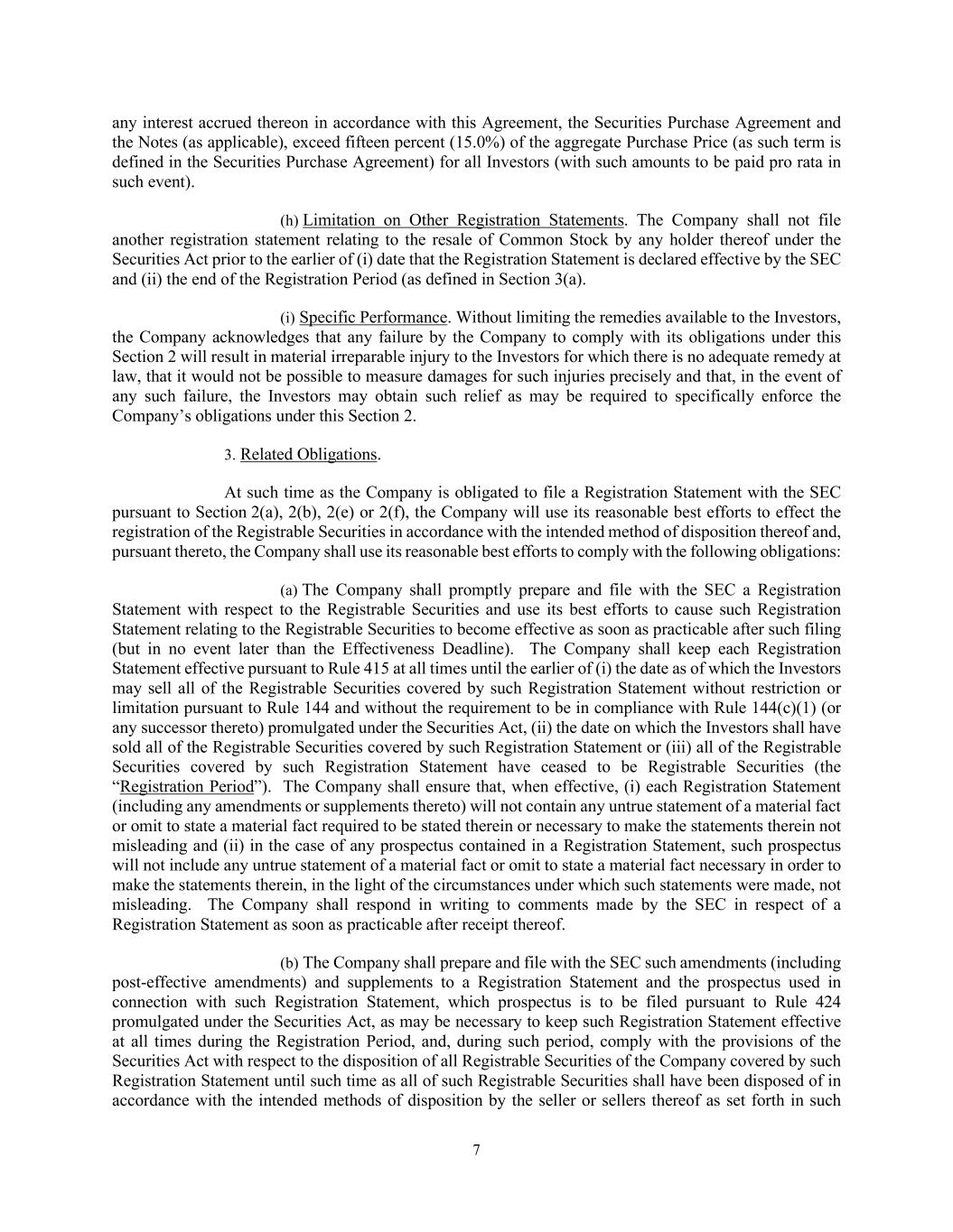 7 any interest accrued thereon in accordance with this Agreement, the Securities Purchase Agreement and the Notes (as applicable), exceed fifteen percent (15.0%) of the aggregate Purchase Price (as such term is defined in the Securities Purchase Agreement) for all Investors (with such amounts to be paid pro rata in such event). (h) Limitation on Other Registration Statements. The Company shall not file another registration statement relating to the resale of Common Stock by any holder thereof under the Securities Act prior to the earlier of (i) date that the Registration Statement is declared effective by the SEC and (ii) the end of the Registration Period (as defined in Section 3(a). (i) Specific Performance. Without limiting the remedies available to the Investors, the Company acknowledges that any failure by the Company to comply with its obligations under this Section 2 will result in material irreparable injury to the Investors for which there is no adequate remedy at law, that it would not be possible to measure damages for such injuries precisely and that, in the event of any such failure, the Investors may obtain such relief as may be required to specifically enforce the Company’s obligations under this Section 2. 3. Related Obligations. At such time as the Company is obligated to file a Registration Statement with the SEC pursuant to Section 2(a), 2(b), 2(e) or 2(f), the Company will use its reasonable best efforts to effect the registration of the Registrable Securities in accordance with the intended method of disposition thereof and, pursuant thereto, the Company shall use its reasonable best efforts to comply with the following obligations: (a) The Company shall promptly prepare and file with the SEC a Registration Statement with respect to the Registrable Securities and use its best efforts to cause such Registration Statement relating to the Registrable Securities to become effective as soon as practicable after such filing (but in no event later than the Effectiveness Deadline). The Company shall keep each Registration Statement effective pursuant to Rule 415 at all times until the earlier of (i) the date as of which the Investors may sell all of the Registrable Securities covered by such Registration Statement without restriction or limitation pursuant to Rule 144 and without the requirement to be in compliance with Rule 144(c)(1) (or any successor thereto) promulgated under the Securities Act, (ii) the date on which the Investors shall have sold all of the Registrable Securities covered by such Registration Statement or (iii) all of the Registrable Securities covered by such Registration Statement have ceased to be Registrable Securities (the “Registration Period”). The Company shall ensure that, when effective, (i) each Registration Statement (including any amendments or supplements thereto) will not contain any untrue statement of a material fact or omit to state a material fact required to be stated therein or necessary to make the statements therein not misleading and (ii) in the case of any prospectus contained in a Registration Statement, such prospectus will not include any untrue statement of a material fact or omit to state a material fact necessary in order to make the statements therein, in the light of the circumstances under which such statements were made, not misleading. The Company shall respond in writing to comments made by the SEC in respect of a Registration Statement as soon as practicable after receipt thereof. (b) The Company shall prepare and file with the SEC such amendments (including post-effective amendments) and supplements to a Registration Statement and the prospectus used in connection with such Registration Statement, which prospectus is to be filed pursuant to Rule 424 promulgated under the Securities Act, as may be necessary to keep such Registration Statement effective at all times during the Registration Period, and, during such period, comply with the provisions of the Securities Act with respect to the disposition of all Registrable Securities of the Company covered by such Registration Statement until such time as all of such Registrable Securities shall have been disposed of in accordance with the intended methods of disposition by the seller or sellers thereof as set forth in such