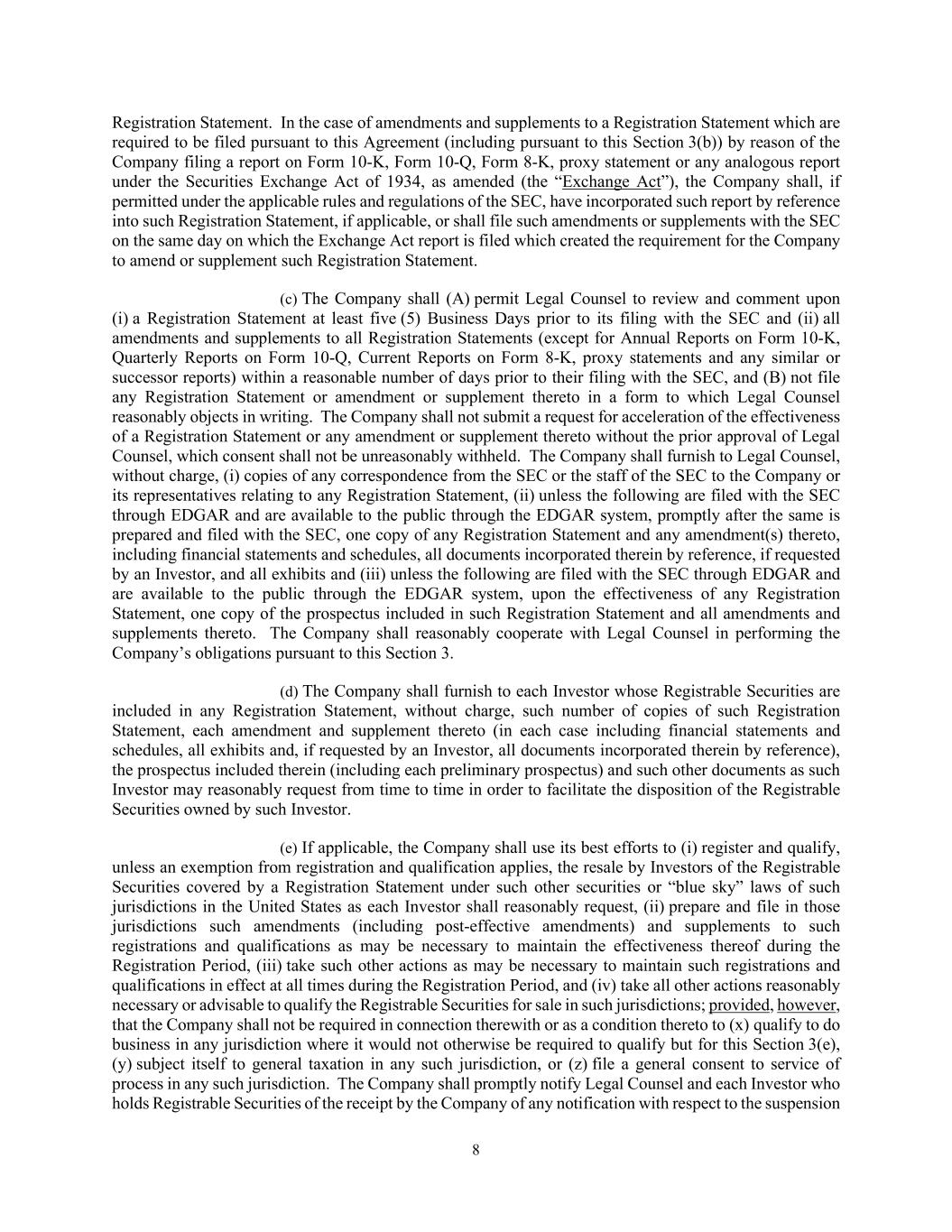 8 Registration Statement. In the case of amendments and supplements to a Registration Statement which are required to be filed pursuant to this Agreement (including pursuant to this Section 3(b)) by reason of the Company filing a report on Form 10-K, Form 10-Q, Form 8-K, proxy statement or any analogous report under the Securities Exchange Act of 1934, as amended (the “Exchange Act”), the Company shall, if permitted under the applicable rules and regulations of the SEC, have incorporated such report by reference into such Registration Statement, if applicable, or shall file such amendments or supplements with the SEC on the same day on which the Exchange Act report is filed which created the requirement for the Company to amend or supplement such Registration Statement. (c) The Company shall (A) permit Legal Counsel to review and comment upon (i) a Registration Statement at least five (5) Business Days prior to its filing with the SEC and (ii) all amendments and supplements to all Registration Statements (except for Annual Reports on Form 10-K, Quarterly Reports on Form 10-Q, Current Reports on Form 8-K, proxy statements and any similar or successor reports) within a reasonable number of days prior to their filing with the SEC, and (B) not file any Registration Statement or amendment or supplement thereto in a form to which Legal Counsel reasonably objects in writing. The Company shall not submit a request for acceleration of the effectiveness of a Registration Statement or any amendment or supplement thereto without the prior approval of Legal Counsel, which consent shall not be unreasonably withheld. The Company shall furnish to Legal Counsel, without charge, (i) copies of any correspondence from the SEC or the staff of the SEC to the Company or its representatives relating to any Registration Statement, (ii) unless the following are filed with the SEC through EDGAR and are available to the public through the EDGAR system, promptly after the same is prepared and filed with the SEC, one copy of any Registration Statement and any amendment(s) thereto, including financial statements and schedules, all documents incorporated therein by reference, if requested by an Investor, and all exhibits and (iii) unless the following are filed with the SEC through EDGAR and are available to the public through the EDGAR system, upon the effectiveness of any Registration Statement, one copy of the prospectus included in such Registration Statement and all amendments and supplements thereto. The Company shall reasonably cooperate with Legal Counsel in performing the Company’s obligations pursuant to this Section 3. (d) The Company shall furnish to each Investor whose Registrable Securities are included in any Registration Statement, without charge, such number of copies of such Registration Statement, each amendment and supplement thereto (in each case including financial statements and schedules, all exhibits and, if requested by an Investor, all documents incorporated therein by reference), the prospectus included therein (including each preliminary prospectus) and such other documents as such Investor may reasonably request from time to time in order to facilitate the disposition of the Registrable Securities owned by such Investor. (e) If applicable, the Company shall use its best efforts to (i) register and qualify, unless an exemption from registration and qualification applies, the resale by Investors of the Registrable Securities covered by a Registration Statement under such other securities or “blue sky” laws of such jurisdictions in the United States as each Investor shall reasonably request, (ii) prepare and file in those jurisdictions such amendments (including post-effective amendments) and supplements to such registrations and qualifications as may be necessary to maintain the effectiveness thereof during the Registration Period, (iii) take such other actions as may be necessary to maintain such registrations and qualifications in effect at all times during the Registration Period, and (iv) take all other actions reasonably necessary or advisable to qualify the Registrable Securities for sale in such jurisdictions; provided, however, that the Company shall not be required in connection therewith or as a condition thereto to (x) qualify to do business in any jurisdiction where it would not otherwise be required to qualify but for this Section 3(e), (y) subject itself to general taxation in any such jurisdiction, or (z) file a general consent to service of process in any such jurisdiction. The Company shall promptly notify Legal Counsel and each Investor who holds Registrable Securities of the receipt by the Company of any notification with respect to the suspension
