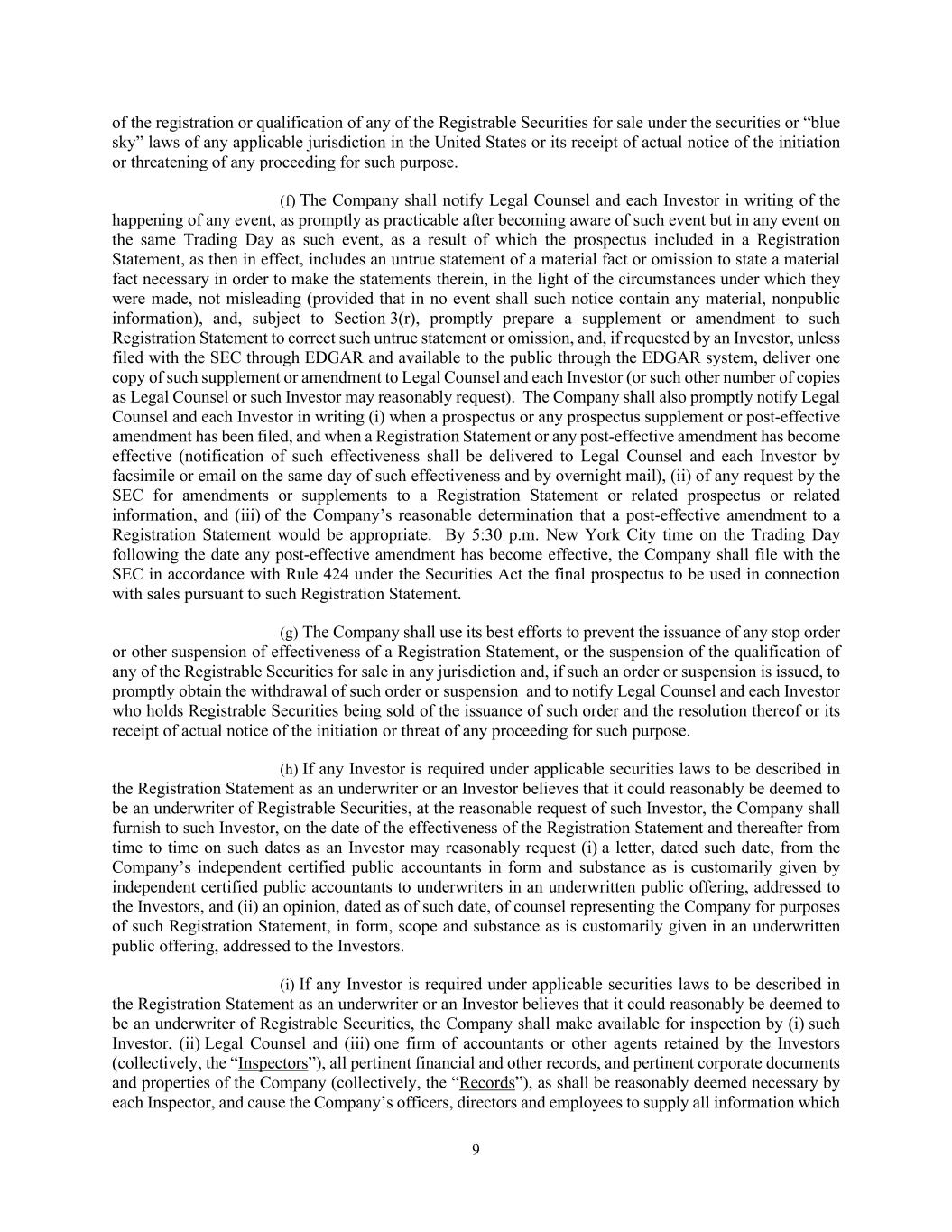 9 of the registration or qualification of any of the Registrable Securities for sale under the securities or “blue sky” laws of any applicable jurisdiction in the United States or its receipt of actual notice of the initiation or threatening of any proceeding for such purpose. (f) The Company shall notify Legal Counsel and each Investor in writing of the happening of any event, as promptly as practicable after becoming aware of such event but in any event on the same Trading Day as such event, as a result of which the prospectus included in a Registration Statement, as then in effect, includes an untrue statement of a material fact or omission to state a material fact necessary in order to make the statements therein, in the light of the circumstances under which they were made, not misleading (provided that in no event shall such notice contain any material, nonpublic information), and, subject to Section 3(r), promptly prepare a supplement or amendment to such Registration Statement to correct such untrue statement or omission, and, if requested by an Investor, unless filed with the SEC through EDGAR and available to the public through the EDGAR system, deliver one copy of such supplement or amendment to Legal Counsel and each Investor (or such other number of copies as Legal Counsel or such Investor may reasonably request). The Company shall also promptly notify Legal Counsel and each Investor in writing (i) when a prospectus or any prospectus supplement or post-effective amendment has been filed, and when a Registration Statement or any post-effective amendment has become effective (notification of such effectiveness shall be delivered to Legal Counsel and each Investor by facsimile or email on the same day of such effectiveness and by overnight mail), (ii) of any request by the SEC for amendments or supplements to a Registration Statement or related prospectus or related information, and (iii) of the Company’s reasonable determination that a post-effective amendment to a Registration Statement would be appropriate. By 5:30 p.m. New York City time on the Trading Day following the date any post-effective amendment has become effective, the Company shall file with the SEC in accordance with Rule 424 under the Securities Act the final prospectus to be used in connection with sales pursuant to such Registration Statement. (g) The Company shall use its best efforts to prevent the issuance of any stop order or other suspension of effectiveness of a Registration Statement, or the suspension of the qualification of any of the Registrable Securities for sale in any jurisdiction and, if such an order or suspension is issued, to promptly obtain the withdrawal of such order or suspension and to notify Legal Counsel and each Investor who holds Registrable Securities being sold of the issuance of such order and the resolution thereof or its receipt of actual notice of the initiation or threat of any proceeding for such purpose. (h) If any Investor is required under applicable securities laws to be described in the Registration Statement as an underwriter or an Investor believes that it could reasonably be deemed to be an underwriter of Registrable Securities, at the reasonable request of such Investor, the Company shall furnish to such Investor, on the date of the effectiveness of the Registration Statement and thereafter from time to time on such dates as an Investor may reasonably request (i) a letter, dated such date, from the Company’s independent certified public accountants in form and substance as is customarily given by independent certified public accountants to underwriters in an underwritten public offering, addressed to the Investors, and (ii) an opinion, dated as of such date, of counsel representing the Company for purposes of such Registration Statement, in form, scope and substance as is customarily given in an underwritten public offering, addressed to the Investors. (i) If any Investor is required under applicable securities laws to be described in the Registration Statement as an underwriter or an Investor believes that it could reasonably be deemed to be an underwriter of Registrable Securities, the Company shall make available for inspection by (i) such Investor, (ii) Legal Counsel and (iii) one firm of accountants or other agents retained by the Investors (collectively, the “Inspectors”), all pertinent financial and other records, and pertinent corporate documents and properties of the Company (collectively, the “Records”), as shall be reasonably deemed necessary by each Inspector, and cause the Company’s officers, directors and employees to supply all information which