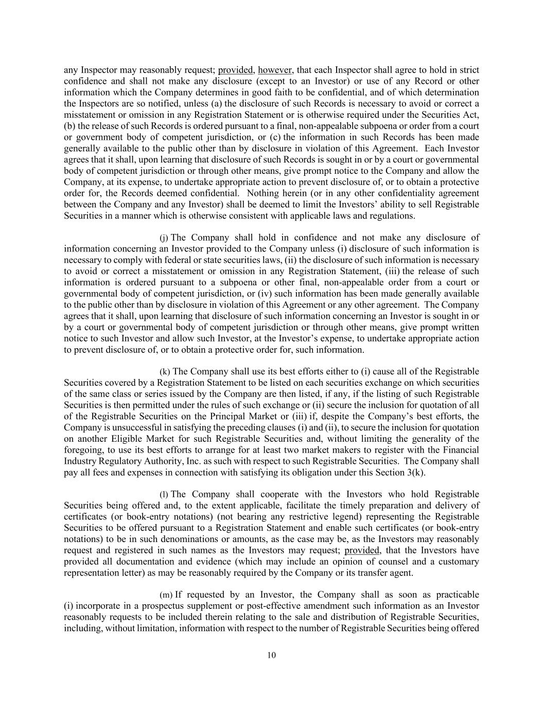 10 any Inspector may reasonably request; provided, however, that each Inspector shall agree to hold in strict confidence and shall not make any disclosure (except to an Investor) or use of any Record or other information which the Company determines in good faith to be confidential, and of which determination the Inspectors are so notified, unless (a) the disclosure of such Records is necessary to avoid or correct a misstatement or omission in any Registration Statement or is otherwise required under the Securities Act, (b) the release of such Records is ordered pursuant to a final, non-appealable subpoena or order from a court or government body of competent jurisdiction, or (c) the information in such Records has been made generally available to the public other than by disclosure in violation of this Agreement. Each Investor agrees that it shall, upon learning that disclosure of such Records is sought in or by a court or governmental body of competent jurisdiction or through other means, give prompt notice to the Company and allow the Company, at its expense, to undertake appropriate action to prevent disclosure of, or to obtain a protective order for, the Records deemed confidential. Nothing herein (or in any other confidentiality agreement between the Company and any Investor) shall be deemed to limit the Investors’ ability to sell Registrable Securities in a manner which is otherwise consistent with applicable laws and regulations. (j) The Company shall hold in confidence and not make any disclosure of information concerning an Investor provided to the Company unless (i) disclosure of such information is necessary to comply with federal or state securities laws, (ii) the disclosure of such information is necessary to avoid or correct a misstatement or omission in any Registration Statement, (iii) the release of such information is ordered pursuant to a subpoena or other final, non-appealable order from a court or governmental body of competent jurisdiction, or (iv) such information has been made generally available to the public other than by disclosure in violation of this Agreement or any other agreement. The Company agrees that it shall, upon learning that disclosure of such information concerning an Investor is sought in or by a court or governmental body of competent jurisdiction or through other means, give prompt written notice to such Investor and allow such Investor, at the Investor’s expense, to undertake appropriate action to prevent disclosure of, or to obtain a protective order for, such information. (k) The Company shall use its best efforts either to (i) cause all of the Registrable Securities covered by a Registration Statement to be listed on each securities exchange on which securities of the same class or series issued by the Company are then listed, if any, if the listing of such Registrable Securities is then permitted under the rules of such exchange or (ii) secure the inclusion for quotation of all of the Registrable Securities on the Principal Market or (iii) if, despite the Company’s best efforts, the Company is unsuccessful in satisfying the preceding clauses (i) and (ii), to secure the inclusion for quotation on another Eligible Market for such Registrable Securities and, without limiting the generality of the foregoing, to use its best efforts to arrange for at least two market makers to register with the Financial Industry Regulatory Authority, Inc. as such with respect to such Registrable Securities. The Company shall pay all fees and expenses in connection with satisfying its obligation under this Section 3(k). (l) The Company shall cooperate with the Investors who hold Registrable Securities being offered and, to the extent applicable, facilitate the timely preparation and delivery of certificates (or book-entry notations) (not bearing any restrictive legend) representing the Registrable Securities to be offered pursuant to a Registration Statement and enable such certificates (or book-entry notations) to be in such denominations or amounts, as the case may be, as the Investors may reasonably request and registered in such names as the Investors may request; provided, that the Investors have provided all documentation and evidence (which may include an opinion of counsel and a customary representation letter) as may be reasonably required by the Company or its transfer agent. (m) If requested by an Investor, the Company shall as soon as practicable (i) incorporate in a prospectus supplement or post-effective amendment such information as an Investor reasonably requests to be included therein relating to the sale and distribution of Registrable Securities, including, without limitation, information with respect to the number of Registrable Securities being offered