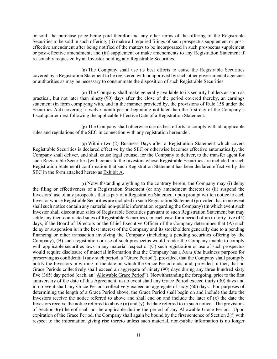 11 or sold, the purchase price being paid therefor and any other terms of the offering of the Registrable Securities to be sold in such offering; (ii) make all required filings of such prospectus supplement or post- effective amendment after being notified of the matters to be incorporated in such prospectus supplement or post-effective amendment; and (iii) supplement or make amendments to any Registration Statement if reasonably requested by an Investor holding any Registrable Securities. (n) The Company shall use its best efforts to cause the Registrable Securities covered by a Registration Statement to be registered with or approved by such other governmental agencies or authorities as may be necessary to consummate the disposition of such Registrable Securities. (o) The Company shall make generally available to its security holders as soon as practical, but not later than ninety (90) days after the close of the period covered thereby, an earnings statement (in form complying with, and in the manner provided by, the provisions of Rule 158 under the Securities Act) covering a twelve-month period beginning not later than the first day of the Company’s fiscal quarter next following the applicable Effective Date of a Registration Statement. (p) The Company shall otherwise use its best efforts to comply with all applicable rules and regulations of the SEC in connection with any registration hereunder. (q) Within two (2) Business Days after a Registration Statement which covers Registrable Securities is declared effective by the SEC or otherwise becomes effective automatically, the Company shall deliver, and shall cause legal counsel for the Company to deliver, to the transfer agent for such Registrable Securities (with copies to the Investors whose Registrable Securities are included in such Registration Statement) confirmation that such Registration Statement has been declared effective by the SEC in the form attached hereto as Exhibit A. (r) Notwithstanding anything to the contrary herein, the Company may (i) delay the filing or effectiveness of a Registration Statement (or any amendment thereto) or (ii) suspend the Investors’ use of any prospectus that is part of a Registration Statement upon prompt written notice to each Investor whose Registrable Securities are included in such Registration Statement (provided that in no event shall such notice contain any material non-public information regarding the Company) (in which event such Investor shall discontinue sales of Registrable Securities pursuant to such Registration Statement but may settle any then-contracted sales of Registrable Securities), in each case for a period of up to forty five (45) days, if the Board of Directors or the Chief Executive Officer of the Company determines that (A) such delay or suspension is in the best interest of the Company and its stockholders generally due to a pending financing or other transaction involving the Company (including a pending securities offering by the Company), (B) such registration or use of such prospectus would render the Company unable to comply with applicable securities laws in any material respect or (C) such registration or use of such prospectus would require disclosure of material information that the Company has a bona fide business purpose for preserving as confidential (any such period, a “Grace Period”); provided, that the Company shall promptly notify the Investors in writing of the date on which the Grace Period ends; and, provided further, that no Grace Periods collectively shall exceed an aggregate of ninety (90) days during any three hundred sixty five (365) day period (each, an “Allowable Grace Period”). Notwithstanding the foregoing, prior to the first anniversary of the date of this Agreement, in no event shall any Grace Period exceed thirty (30) days and in no event shall any Grace Periods collectively exceed an aggregate of sixty (60) days. For purposes of determining the length of a Grace Period above, the Grace Period shall begin on and include the date the Investors receive the notice referred to above and shall end on and include the later of (x) the date the Investors receive the notice referred to above (ii) and (y) the date referred to in such notice. The provisions of Section 3(g) hereof shall not be applicable during the period of any Allowable Grace Period. Upon expiration of the Grace Period, the Company shall again be bound by the first sentence of Section 3(f) with respect to the information giving rise thereto unless such material, non-public information is no longer