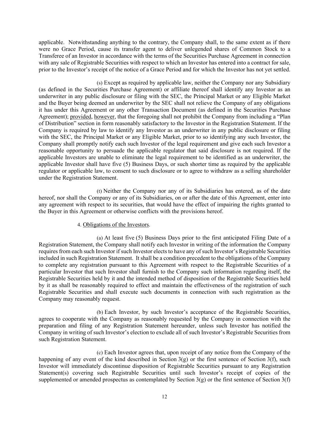 12 applicable. Notwithstanding anything to the contrary, the Company shall, to the same extent as if there were no Grace Period, cause its transfer agent to deliver unlegended shares of Common Stock to a Transferee of an Investor in accordance with the terms of the Securities Purchase Agreement in connection with any sale of Registrable Securities with respect to which an Investor has entered into a contract for sale, prior to the Investor’s receipt of the notice of a Grace Period and for which the Investor has not yet settled. (s) Except as required by applicable law, neither the Company nor any Subsidiary (as defined in the Securities Purchase Agreement) or affiliate thereof shall identify any Investor as an underwriter in any public disclosure or filing with the SEC, the Principal Market or any Eligible Market and the Buyer being deemed an underwriter by the SEC shall not relieve the Company of any obligations it has under this Agreement or any other Transaction Document (as defined in the Securities Purchase Agreement); provided, however, that the foregoing shall not prohibit the Company from including a “Plan of Distribution” section in form reasonably satisfactory to the Investor in the Registration Statement. If the Company is required by law to identify any Investor as an underwriter in any public disclosure or filing with the SEC, the Principal Market or any Eligible Market, prior to so identifying any such Investor, the Company shall promptly notify each such Investor of the legal requirement and give each such Investor a reasonable opportunity to persuade the applicable regulator that said disclosure is not required. If the applicable Investors are unable to eliminate the legal requirement to be identified as an underwriter, the applicable Investor shall have five (5) Business Days, or such shorter time as required by the applicable regulator or applicable law, to consent to such disclosure or to agree to withdraw as a selling shareholder under the Registration Statement. (t) Neither the Company nor any of its Subsidiaries has entered, as of the date hereof, nor shall the Company or any of its Subsidiaries, on or after the date of this Agreement, enter into any agreement with respect to its securities, that would have the effect of impairing the rights granted to the Buyer in this Agreement or otherwise conflicts with the provisions hereof. 4. Obligations of the Investors. (a) At least five (5) Business Days prior to the first anticipated Filing Date of a Registration Statement, the Company shall notify each Investor in writing of the information the Company requires from each such Investor if such Investor elects to have any of such Investor’s Registrable Securities included in such Registration Statement. It shall be a condition precedent to the obligations of the Company to complete any registration pursuant to this Agreement with respect to the Registrable Securities of a particular Investor that such Investor shall furnish to the Company such information regarding itself, the Registrable Securities held by it and the intended method of disposition of the Registrable Securities held by it as shall be reasonably required to effect and maintain the effectiveness of the registration of such Registrable Securities and shall execute such documents in connection with such registration as the Company may reasonably request. (b) Each Investor, by such Investor’s acceptance of the Registrable Securities, agrees to cooperate with the Company as reasonably requested by the Company in connection with the preparation and filing of any Registration Statement hereunder, unless such Investor has notified the Company in writing of such Investor’s election to exclude all of such Investor’s Registrable Securities from such Registration Statement. (c) Each Investor agrees that, upon receipt of any notice from the Company of the happening of any event of the kind described in Section 3(g) or the first sentence of Section 3(f), such Investor will immediately discontinue disposition of Registrable Securities pursuant to any Registration Statement(s) covering such Registrable Securities until such Investor’s receipt of copies of the supplemented or amended prospectus as contemplated by Section 3(g) or the first sentence of Section 3(f)