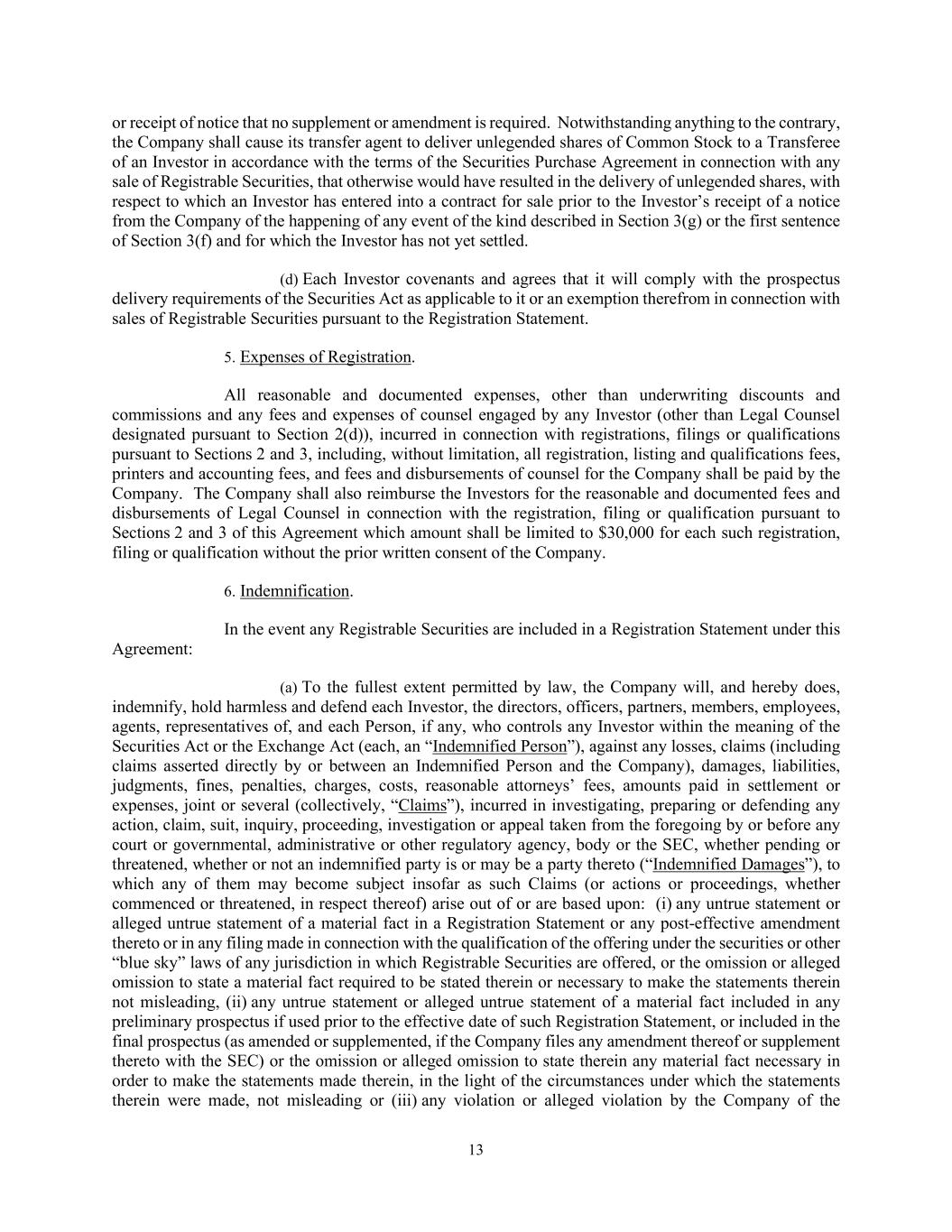 13 or receipt of notice that no supplement or amendment is required. Notwithstanding anything to the contrary, the Company shall cause its transfer agent to deliver unlegended shares of Common Stock to a Transferee of an Investor in accordance with the terms of the Securities Purchase Agreement in connection with any sale of Registrable Securities, that otherwise would have resulted in the delivery of unlegended shares, with respect to which an Investor has entered into a contract for sale prior to the Investor’s receipt of a notice from the Company of the happening of any event of the kind described in Section 3(g) or the first sentence of Section 3(f) and for which the Investor has not yet settled. (d) Each Investor covenants and agrees that it will comply with the prospectus delivery requirements of the Securities Act as applicable to it or an exemption therefrom in connection with sales of Registrable Securities pursuant to the Registration Statement. 5. Expenses of Registration. All reasonable and documented expenses, other than underwriting discounts and commissions and any fees and expenses of counsel engaged by any Investor (other than Legal Counsel designated pursuant to Section 2(d)), incurred in connection with registrations, filings or qualifications pursuant to Sections 2 and 3, including, without limitation, all registration, listing and qualifications fees, printers and accounting fees, and fees and disbursements of counsel for the Company shall be paid by the Company. The Company shall also reimburse the Investors for the reasonable and documented fees and disbursements of Legal Counsel in connection with the registration, filing or qualification pursuant to Sections 2 and 3 of this Agreement which amount shall be limited to $30,000 for each such registration, filing or qualification without the prior written consent of the Company. 6. Indemnification. In the event any Registrable Securities are included in a Registration Statement under this Agreement: (a) To the fullest extent permitted by law, the Company will, and hereby does, indemnify, hold harmless and defend each Investor, the directors, officers, partners, members, employees, agents, representatives of, and each Person, if any, who controls any Investor within the meaning of the Securities Act or the Exchange Act (each, an “Indemnified Person”), against any losses, claims (including claims asserted directly by or between an Indemnified Person and the Company), damages, liabilities, judgments, fines, penalties, charges, costs, reasonable attorneys’ fees, amounts paid in settlement or expenses, joint or several (collectively, “Claims”), incurred in investigating, preparing or defending any action, claim, suit, inquiry, proceeding, investigation or appeal taken from the foregoing by or before any court or governmental, administrative or other regulatory agency, body or the SEC, whether pending or threatened, whether or not an indemnified party is or may be a party thereto (“Indemnified Damages”), to which any of them may become subject insofar as such Claims (or actions or proceedings, whether commenced or threatened, in respect thereof) arise out of or are based upon: (i) any untrue statement or alleged untrue statement of a material fact in a Registration Statement or any post-effective amendment thereto or in any filing made in connection with the qualification of the offering under the securities or other “blue sky” laws of any jurisdiction in which Registrable Securities are offered, or the omission or alleged omission to state a material fact required to be stated therein or necessary to make the statements therein not misleading, (ii) any untrue statement or alleged untrue statement of a material fact included in any preliminary prospectus if used prior to the effective date of such Registration Statement, or included in the final prospectus (as amended or supplemented, if the Company files any amendment thereof or supplement thereto with the SEC) or the omission or alleged omission to state therein any material fact necessary in order to make the statements made therein, in the light of the circumstances under which the statements therein were made, not misleading or (iii) any violation or alleged violation by the Company of the
