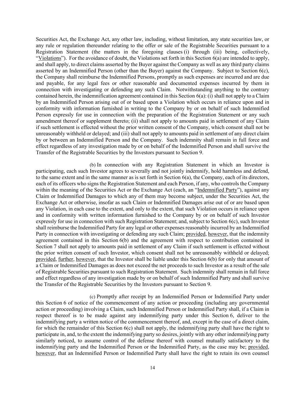 14 Securities Act, the Exchange Act, any other law, including, without limitation, any state securities law, or any rule or regulation thereunder relating to the offer or sale of the Registrable Securities pursuant to a Registration Statement (the matters in the foregoing clauses (i) through (iii) being, collectively, “Violations”). For the avoidance of doubt, the Violations set forth in this Section 6(a) are intended to apply, and shall apply, to direct claims asserted by the Buyer against the Company as well as any third party claims asserted by an Indemnified Person (other than the Buyer) against the Company. Subject to Section 6(c), the Company shall reimburse the Indemnified Persons, promptly as such expenses are incurred and are due and payable, for any legal fees or other reasonable and documented expenses incurred by them in connection with investigating or defending any such Claim. Notwithstanding anything to the contrary contained herein, the indemnification agreement contained in this Section 6(a): (i) shall not apply to a Claim by an Indemnified Person arising out of or based upon a Violation which occurs in reliance upon and in conformity with information furnished in writing to the Company by or on behalf of such Indemnified Person expressly for use in connection with the preparation of the Registration Statement or any such amendment thereof or supplement thereto; (ii) shall not apply to amounts paid in settlement of any Claim if such settlement is effected without the prior written consent of the Company, which consent shall not be unreasonably withheld or delayed; and (iii) shall not apply to amounts paid in settlement of any direct claim by or between an Indemnified Person and the Company. Such indemnity shall remain in full force and effect regardless of any investigation made by or on behalf of the Indemnified Person and shall survive the Transfer of the Registrable Securities by the Investors pursuant to Section 9. (b) In connection with any Registration Statement in which an Investor is participating, each such Investor agrees to severally and not jointly indemnify, hold harmless and defend, to the same extent and in the same manner as is set forth in Section 6(a), the Company, each of its directors, each of its officers who signs the Registration Statement and each Person, if any, who controls the Company within the meaning of the Securities Act or the Exchange Act (each, an “Indemnified Party”), against any Claim or Indemnified Damages to which any of them may become subject, under the Securities Act, the Exchange Act or otherwise, insofar as such Claim or Indemnified Damages arise out of or are based upon any Violation, in each case to the extent, and only to the extent, that such Violation occurs in reliance upon and in conformity with written information furnished to the Company by or on behalf of such Investor expressly for use in connection with such Registration Statement; and, subject to Section 6(c), such Investor shall reimburse the Indemnified Party for any legal or other expenses reasonably incurred by an Indemnified Party in connection with investigating or defending any such Claim; provided, however, that the indemnity agreement contained in this Section 6(b) and the agreement with respect to contribution contained in Section 7 shall not apply to amounts paid in settlement of any Claim if such settlement is effected without the prior written consent of such Investor, which consent shall not be unreasonably withheld or delayed; provided, further, however, that the Investor shall be liable under this Section 6(b) for only that amount of a Claim or Indemnified Damages as does not exceed the net proceeds to such Investor as a result of the sale of Registrable Securities pursuant to such Registration Statement. Such indemnity shall remain in full force and effect regardless of any investigation made by or on behalf of such Indemnified Party and shall survive the Transfer of the Registrable Securities by the Investors pursuant to Section 9. (c) Promptly after receipt by an Indemnified Person or Indemnified Party under this Section 6 of notice of the commencement of any action or proceeding (including any governmental action or proceeding) involving a Claim, such Indemnified Person or Indemnified Party shall, if a Claim in respect thereof is to be made against any indemnifying party under this Section 6, deliver to the indemnifying party a written notice of the commencement thereof, and, except in the case of a direct claim, for which the remainder of this Section 6(c) shall not apply, the indemnifying party shall have the right to participate in, and, to the extent the indemnifying party so desires, jointly with any other indemnifying party similarly noticed, to assume control of the defense thereof with counsel mutually satisfactory to the indemnifying party and the Indemnified Person or the Indemnified Party, as the case may be; provided, however, that an Indemnified Person or Indemnified Party shall have the right to retain its own counsel