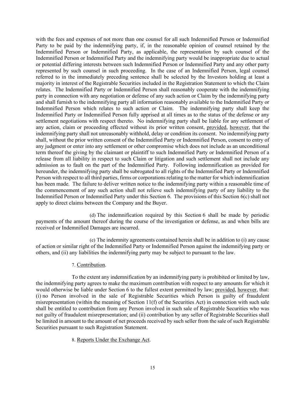 15 with the fees and expenses of not more than one counsel for all such Indemnified Person or Indemnified Party to be paid by the indemnifying party, if, in the reasonable opinion of counsel retained by the Indemnified Person or Indemnified Party, as applicable, the representation by such counsel of the Indemnified Person or Indemnified Party and the indemnifying party would be inappropriate due to actual or potential differing interests between such Indemnified Person or Indemnified Party and any other party represented by such counsel in such proceeding. In the case of an Indemnified Person, legal counsel referred to in the immediately preceding sentence shall be selected by the Investors holding at least a majority in interest of the Registrable Securities included in the Registration Statement to which the Claim relates. The Indemnified Party or Indemnified Person shall reasonably cooperate with the indemnifying party in connection with any negotiation or defense of any such action or Claim by the indemnifying party and shall furnish to the indemnifying party all information reasonably available to the Indemnified Party or Indemnified Person which relates to such action or Claim. The indemnifying party shall keep the Indemnified Party or Indemnified Person fully apprised at all times as to the status of the defense or any settlement negotiations with respect thereto. No indemnifying party shall be liable for any settlement of any action, claim or proceeding effected without its prior written consent, provided, however, that the indemnifying party shall not unreasonably withhold, delay or condition its consent. No indemnifying party shall, without the prior written consent of the Indemnified Party or Indemnified Person, consent to entry of any judgment or enter into any settlement or other compromise which does not include as an unconditional term thereof the giving by the claimant or plaintiff to such Indemnified Party or Indemnified Person of a release from all liability in respect to such Claim or litigation and such settlement shall not include any admission as to fault on the part of the Indemnified Party. Following indemnification as provided for hereunder, the indemnifying party shall be subrogated to all rights of the Indemnified Party or Indemnified Person with respect to all third parties, firms or corporations relating to the matter for which indemnification has been made. The failure to deliver written notice to the indemnifying party within a reasonable time of the commencement of any such action shall not relieve such indemnifying party of any liability to the Indemnified Person or Indemnified Party under this Section 6. The provisions of this Section 6(c) shall not apply to direct claims between the Company and the Buyer. (d) The indemnification required by this Section 6 shall be made by periodic payments of the amount thereof during the course of the investigation or defense, as and when bills are received or Indemnified Damages are incurred. (e) The indemnity agreements contained herein shall be in addition to (i) any cause of action or similar right of the Indemnified Party or Indemnified Person against the indemnifying party or others, and (ii) any liabilities the indemnifying party may be subject to pursuant to the law. 7. Contribution. To the extent any indemnification by an indemnifying party is prohibited or limited by law, the indemnifying party agrees to make the maximum contribution with respect to any amounts for which it would otherwise be liable under Section 6 to the fullest extent permitted by law; provided, however, that: (i) no Person involved in the sale of Registrable Securities which Person is guilty of fraudulent misrepresentation (within the meaning of Section 11(f) of the Securities Act) in connection with such sale shall be entitled to contribution from any Person involved in such sale of Registrable Securities who was not guilty of fraudulent misrepresentation; and (ii) contribution by any seller of Registrable Securities shall be limited in amount to the amount of net proceeds received by such seller from the sale of such Registrable Securities pursuant to such Registration Statement. 8. Reports Under the Exchange Act.