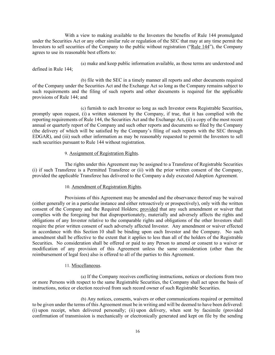 16 With a view to making available to the Investors the benefits of Rule 144 promulgated under the Securities Act or any other similar rule or regulation of the SEC that may at any time permit the Investors to sell securities of the Company to the public without registration (“Rule 144”), the Company agrees to use its reasonable best efforts to: (a) make and keep public information available, as those terms are understood and defined in Rule 144; (b) file with the SEC in a timely manner all reports and other documents required of the Company under the Securities Act and the Exchange Act so long as the Company remains subject to such requirements and the filing of such reports and other documents is required for the applicable provisions of Rule 144; and (c) furnish to each Investor so long as such Investor owns Registrable Securities, promptly upon request, (i) a written statement by the Company, if true, that it has complied with the reporting requirements of Rule 144, the Securities Act and the Exchange Act, (ii) a copy of the most recent annual or quarterly report of the Company and such other reports and documents so filed by the Company (the delivery of which will be satisfied by the Company’s filing of such reports with the SEC through EDGAR), and (iii) such other information as may be reasonably requested to permit the Investors to sell such securities pursuant to Rule 144 without registration. 9. Assignment of Registration Rights. The rights under this Agreement may be assigned to a Transferee of Registrable Securities (i) if such Transferee is a Permitted Transferee or (ii) with the prior written consent of the Company, provided the applicable Transferee has delivered to the Company a duly executed Adoption Agreement. 10. Amendment of Registration Rights. Provisions of this Agreement may be amended and the observance thereof may be waived (either generally or in a particular instance and either retroactively or prospectively), only with the written consent of the Company and the Required Holders; provided that any such amendment or waiver that complies with the foregoing but that disproportionately, materially and adversely affects the rights and obligations of any Investor relative to the comparable rights and obligations of the other Investors shall require the prior written consent of such adversely affected Investor. Any amendment or waiver effected in accordance with this Section 10 shall be binding upon each Investor and the Company. No such amendment shall be effective to the extent that it applies to less than all of the holders of the Registrable Securities. No consideration shall be offered or paid to any Person to amend or consent to a waiver or modification of any provision of this Agreement unless the same consideration (other than the reimbursement of legal fees) also is offered to all of the parties to this Agreement. 11. Miscellaneous. (a) If the Company receives conflicting instructions, notices or elections from two or more Persons with respect to the same Registrable Securities, the Company shall act upon the basis of instructions, notice or election received from such record owner of such Registrable Securities. (b) Any notices, consents, waivers or other communications required or permitted to be given under the terms of this Agreement must be in writing and will be deemed to have been delivered: (i) upon receipt, when delivered personally; (ii) upon delivery, when sent by facsimile (provided confirmation of transmission is mechanically or electronically generated and kept on file by the sending