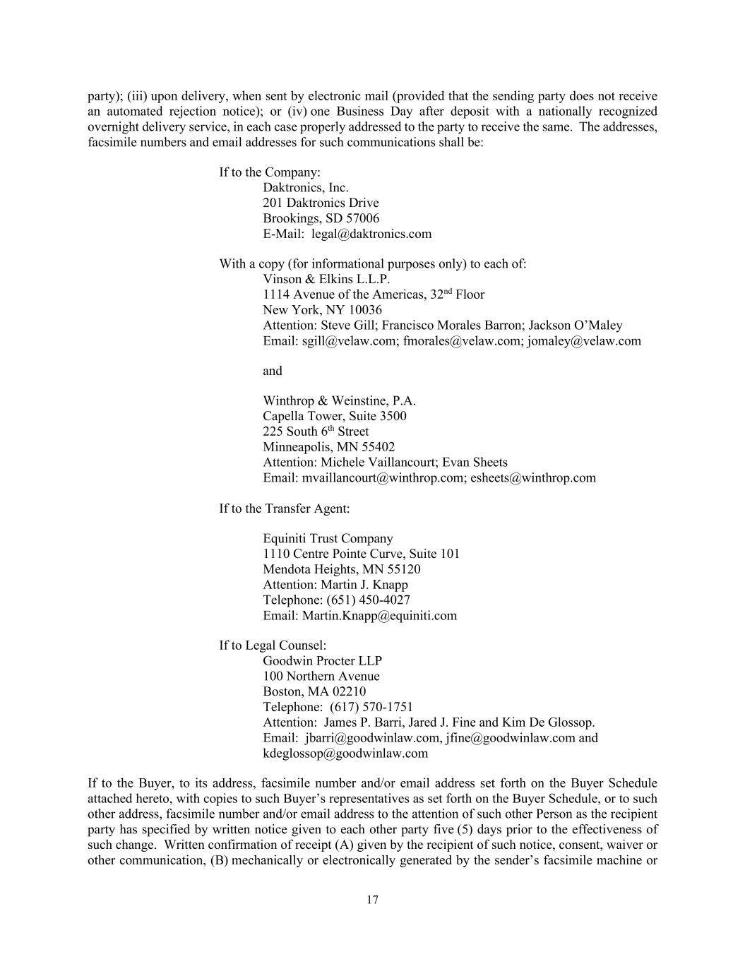 17 party); (iii) upon delivery, when sent by electronic mail (provided that the sending party does not receive an automated rejection notice); or (iv) one Business Day after deposit with a nationally recognized overnight delivery service, in each case properly addressed to the party to receive the same. The addresses, facsimile numbers and email addresses for such communications shall be: If to the Company: Daktronics, Inc. 201 Daktronics Drive Brookings, SD 57006 E-Mail: legal@daktronics.com With a copy (for informational purposes only) to each of: Vinson & Elkins L.L.P. 1114 Avenue of the Americas, 32nd Floor New York, NY 10036 Attention: Steve Gill; Francisco Morales Barron; Jackson O’Maley Email: sgill@velaw.com; fmorales@velaw.com; jomaley@velaw.com and Winthrop & Weinstine, P.A. Capella Tower, Suite 3500 225 South 6th Street Minneapolis, MN 55402 Attention: Michele Vaillancourt; Evan Sheets Email: mvaillancourt@winthrop.com; esheets@winthrop.com If to the Transfer Agent: Equiniti Trust Company 1110 Centre Pointe Curve, Suite 101 Mendota Heights, MN 55120 Attention: Martin J. Knapp Telephone: (651) 450-4027 Email: Martin.Knapp@equiniti.com If to Legal Counsel: Goodwin Procter LLP 100 Northern Avenue Boston, MA 02210 Telephone: (617) 570-1751 Attention: James P. Barri, Jared J. Fine and Kim De Glossop. Email: jbarri@goodwinlaw.com, jfine@goodwinlaw.com and kdeglossop@goodwinlaw.com If to the Buyer, to its address, facsimile number and/or email address set forth on the Buyer Schedule attached hereto, with copies to such Buyer’s representatives as set forth on the Buyer Schedule, or to such other address, facsimile number and/or email address to the attention of such other Person as the recipient party has specified by written notice given to each other party five (5) days prior to the effectiveness of such change. Written confirmation of receipt (A) given by the recipient of such notice, consent, waiver or other communication, (B) mechanically or electronically generated by the sender’s facsimile machine or