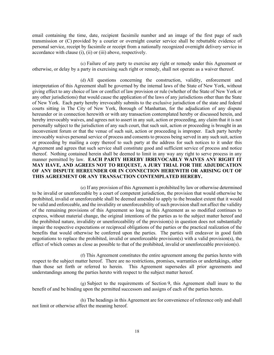 18 email containing the time, date, recipient facsimile number and an image of the first page of such transmission or (C) provided by a courier or overnight courier service shall be rebuttable evidence of personal service, receipt by facsimile or receipt from a nationally recognized overnight delivery service in accordance with clause (i), (ii) or (iii) above, respectively. (c) Failure of any party to exercise any right or remedy under this Agreement or otherwise, or delay by a party in exercising such right or remedy, shall not operate as a waiver thereof. (d) All questions concerning the construction, validity, enforcement and interpretation of this Agreement shall be governed by the internal laws of the State of New York, without giving effect to any choice of law or conflict of law provision or rule (whether of the State of New York or any other jurisdictions) that would cause the application of the laws of any jurisdictions other than the State of New York. Each party hereby irrevocably submits to the exclusive jurisdiction of the state and federal courts sitting in The City of New York, Borough of Manhattan, for the adjudication of any dispute hereunder or in connection herewith or with any transaction contemplated hereby or discussed herein, and hereby irrevocably waives, and agrees not to assert in any suit, action or proceeding, any claim that it is not personally subject to the jurisdiction of any such court, that such suit, action or proceeding is brought in an inconvenient forum or that the venue of such suit, action or proceeding is improper. Each party hereby irrevocably waives personal service of process and consents to process being served in any such suit, action or proceeding by mailing a copy thereof to such party at the address for such notices to it under this Agreement and agrees that such service shall constitute good and sufficient service of process and notice thereof. Nothing contained herein shall be deemed to limit in any way any right to serve process in any manner permitted by law. EACH PARTY HEREBY IRREVOCABLY WAIVES ANY RIGHT IT MAY HAVE, AND AGREES NOT TO REQUEST, A JURY TRIAL FOR THE ADJUDICATION OF ANY DISPUTE HEREUNDER OR IN CONNECTION HEREWITH OR ARISING OUT OF THIS AGREEMENT OR ANY TRANSACTION CONTEMPLATED HEREBY. (e) If any provision of this Agreement is prohibited by law or otherwise determined to be invalid or unenforceable by a court of competent jurisdiction, the provision that would otherwise be prohibited, invalid or unenforceable shall be deemed amended to apply to the broadest extent that it would be valid and enforceable, and the invalidity or unenforceability of such provision shall not affect the validity of the remaining provisions of this Agreement so long as this Agreement as so modified continues to express, without material change, the original intentions of the parties as to the subject matter hereof and the prohibited nature, invalidity or unenforceability of the provision(s) in question does not substantially impair the respective expectations or reciprocal obligations of the parties or the practical realization of the benefits that would otherwise be conferred upon the parties. The parties will endeavor in good faith negotiations to replace the prohibited, invalid or unenforceable provision(s) with a valid provision(s), the effect of which comes as close as possible to that of the prohibited, invalid or unenforceable provision(s). (f) This Agreement constitutes the entire agreement among the parties hereto with respect to the subject matter hereof. There are no restrictions, promises, warranties or undertakings, other than those set forth or referred to herein. This Agreement supersedes all prior agreements and understandings among the parties hereto with respect to the subject matter hereof. (g) Subject to the requirements of Section 9, this Agreement shall inure to the benefit of and be binding upon the permitted successors and assigns of each of the parties hereto. (h) The headings in this Agreement are for convenience of reference only and shall not limit or otherwise affect the meaning hereof.