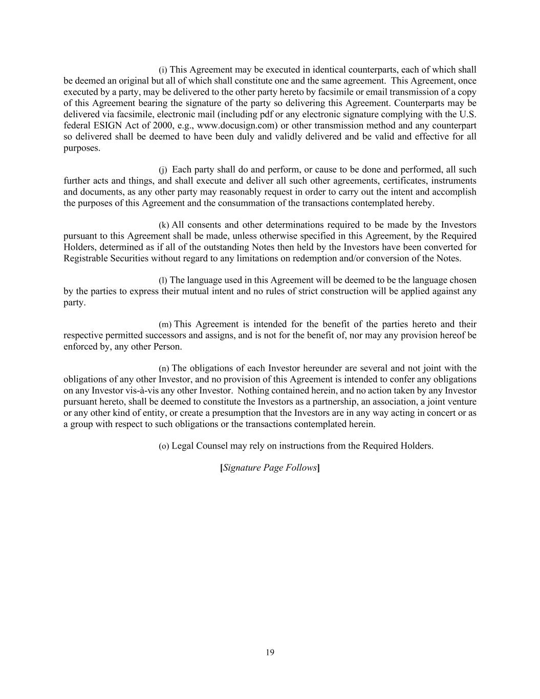 19 (i) This Agreement may be executed in identical counterparts, each of which shall be deemed an original but all of which shall constitute one and the same agreement. This Agreement, once executed by a party, may be delivered to the other party hereto by facsimile or email transmission of a copy of this Agreement bearing the signature of the party so delivering this Agreement. Counterparts may be delivered via facsimile, electronic mail (including pdf or any electronic signature complying with the U.S. federal ESIGN Act of 2000, e.g., www.docusign.com) or other transmission method and any counterpart so delivered shall be deemed to have been duly and validly delivered and be valid and effective for all purposes. (j) Each party shall do and perform, or cause to be done and performed, all such further acts and things, and shall execute and deliver all such other agreements, certificates, instruments and documents, as any other party may reasonably request in order to carry out the intent and accomplish the purposes of this Agreement and the consummation of the transactions contemplated hereby. (k) All consents and other determinations required to be made by the Investors pursuant to this Agreement shall be made, unless otherwise specified in this Agreement, by the Required Holders, determined as if all of the outstanding Notes then held by the Investors have been converted for Registrable Securities without regard to any limitations on redemption and/or conversion of the Notes. (l) The language used in this Agreement will be deemed to be the language chosen by the parties to express their mutual intent and no rules of strict construction will be applied against any party. (m) This Agreement is intended for the benefit of the parties hereto and their respective permitted successors and assigns, and is not for the benefit of, nor may any provision hereof be enforced by, any other Person. (n) The obligations of each Investor hereunder are several and not joint with the obligations of any other Investor, and no provision of this Agreement is intended to confer any obligations on any Investor vis-à-vis any other Investor. Nothing contained herein, and no action taken by any Investor pursuant hereto, shall be deemed to constitute the Investors as a partnership, an association, a joint venture or any other kind of entity, or create a presumption that the Investors are in any way acting in concert or as a group with respect to such obligations or the transactions contemplated herein. (o) Legal Counsel may rely on instructions from the Required Holders. [Signature Page Follows]