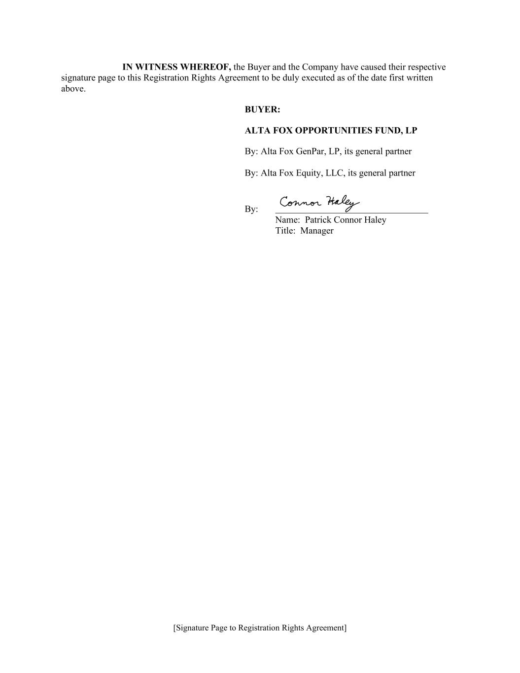 [Signature Page to Registration Rights Agreement] IN WITNESS WHEREOF, the Buyer and the Company have caused their respective signature page to this Registration Rights Agreement to be duly executed as of the date first written above. BUYER: ALTA FOX OPPORTUNITIES FUND, LP By: Alta Fox GenPar, LP, its general partner By: Alta Fox Equity, LLC, its general partner By: Name: Patrick Connor Haley Title: Manager