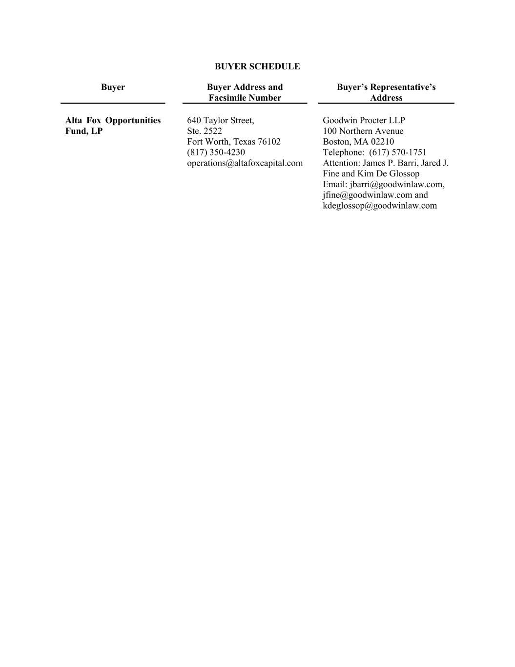 BUYER SCHEDULE Buyer Buyer Address and Facsimile Number Buyer’s Representative’s Address Alta Fox Opportunities Fund, LP 640 Taylor Street, Ste. 2522 Fort Worth, Texas 76102 (817) 350-4230 operations@altafoxcapital.com Goodwin Procter LLP 100 Northern Avenue Boston, MA 02210 Telephone: (617) 570-1751 Attention: James P. Barri, Jared J. Fine and Kim De Glossop Email: jbarri@goodwinlaw.com, jfine@goodwinlaw.com and kdeglossop@goodwinlaw.com