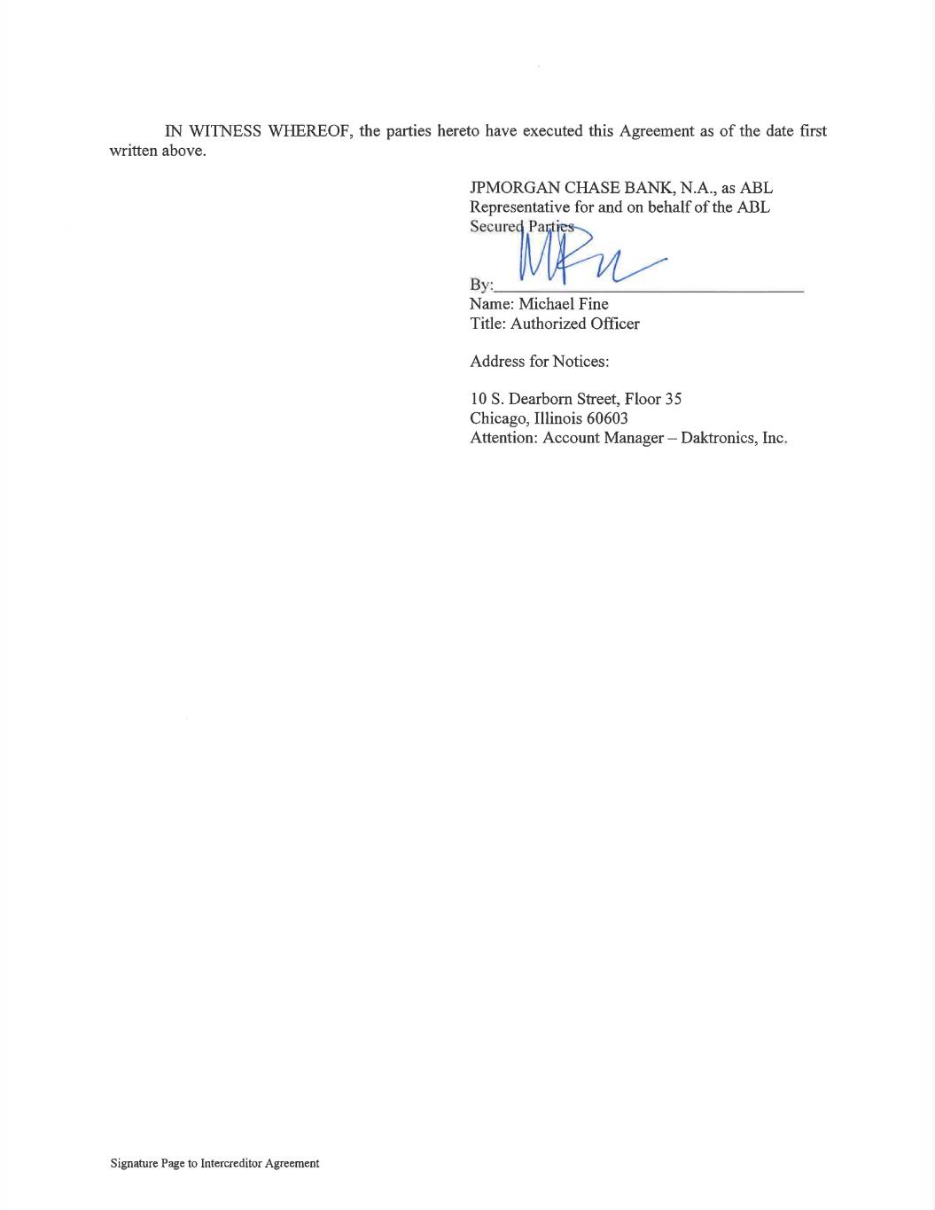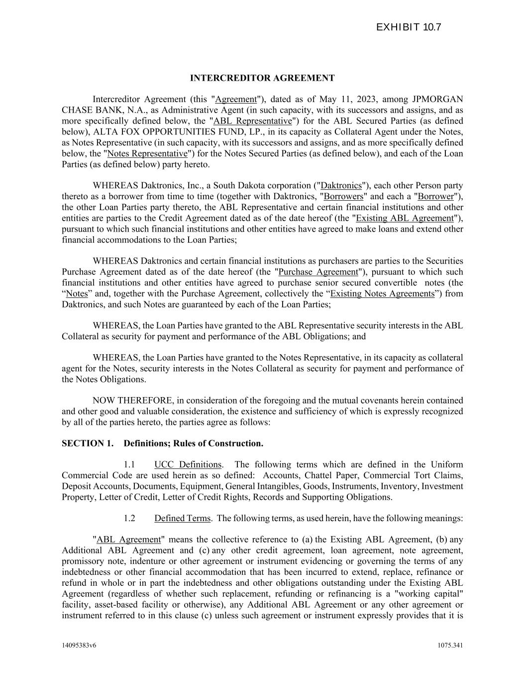 14095383v6 1075.341 INTERCREDITOR AGREEMENT Intercreditor Agreement (this "Agreement"), dated as of May 11, 2023, among JPMORGAN CHASE BANK, N.A., as Administrative Agent (in such capacity, with its successors and assigns, and as more specifically defined below, the "ABL Representative") for the ABL Secured Parties (as defined below), ALTA FOX OPPORTUNITIES FUND, LP., in its capacity as Collateral Agent under the Notes, as Notes Representative (in such capacity, with its successors and assigns, and as more specifically defined below, the "Notes Representative") for the Notes Secured Parties (as defined below), and each of the Loan Parties (as defined below) party hereto. WHEREAS Daktronics, Inc., a South Dakota corporation ("Daktronics"), each other Person party thereto as a borrower from time to time (together with Daktronics, "Borrowers" and each a "Borrower"), the other Loan Parties party thereto, the ABL Representative and certain financial institutions and other entities are parties to the Credit Agreement dated as of the date hereof (the "Existing ABL Agreement"), pursuant to which such financial institutions and other entities have agreed to make loans and extend other financial accommodations to the Loan Parties; WHEREAS Daktronics and certain financial institutions as purchasers are parties to the Securities Purchase Agreement dated as of the date hereof (the "Purchase Agreement"), pursuant to which such financial institutions and other entities have agreed to purchase senior secured convertible notes (the “Notes” and, together with the Purchase Agreement, collectively the “Existing Notes Agreements”) from Daktronics, and such Notes are guaranteed by each of the Loan Parties; WHEREAS, the Loan Parties have granted to the ABL Representative security interests in the ABL Collateral as security for payment and performance of the ABL Obligations; and WHEREAS, the Loan Parties have granted to the Notes Representative, in its capacity as collateral agent for the Notes, security interests in the Notes Collateral as security for payment and performance of the Notes Obligations. NOW THEREFORE, in consideration of the foregoing and the mutual covenants herein contained and other good and valuable consideration, the existence and sufficiency of which is expressly recognized by all of the parties hereto, the parties agree as follows: SECTION 1. Definitions; Rules of Construction. 1.1 UCC Definitions. The following terms which are defined in the Uniform Commercial Code are used herein as so defined: Accounts, Chattel Paper, Commercial Tort Claims, Deposit Accounts, Documents, Equipment, General Intangibles, Goods, Instruments, Inventory, Investment Property, Letter of Credit, Letter of Credit Rights, Records and Supporting Obligations. 1.2 Defined Terms. The following terms, as used herein, have the following meanings: "ABL Agreement" means the collective reference to (a) the Existing ABL Agreement, (b) any Additional ABL Agreement and (c) any other credit agreement, loan agreement, note agreement, promissory note, indenture or other agreement or instrument evidencing or governing the terms of any indebtedness or other financial accommodation that has been incurred to extend, replace, refinance or refund in whole or in part the indebtedness and other obligations outstanding under the Existing ABL Agreement (regardless of whether such replacement, refunding or refinancing is a "working capital" facility, asset-based facility or otherwise), any Additional ABL Agreement or any other agreement or instrument referred to in this clause (c) unless such agreement or instrument expressly provides that it is EXHIBIT 10.7