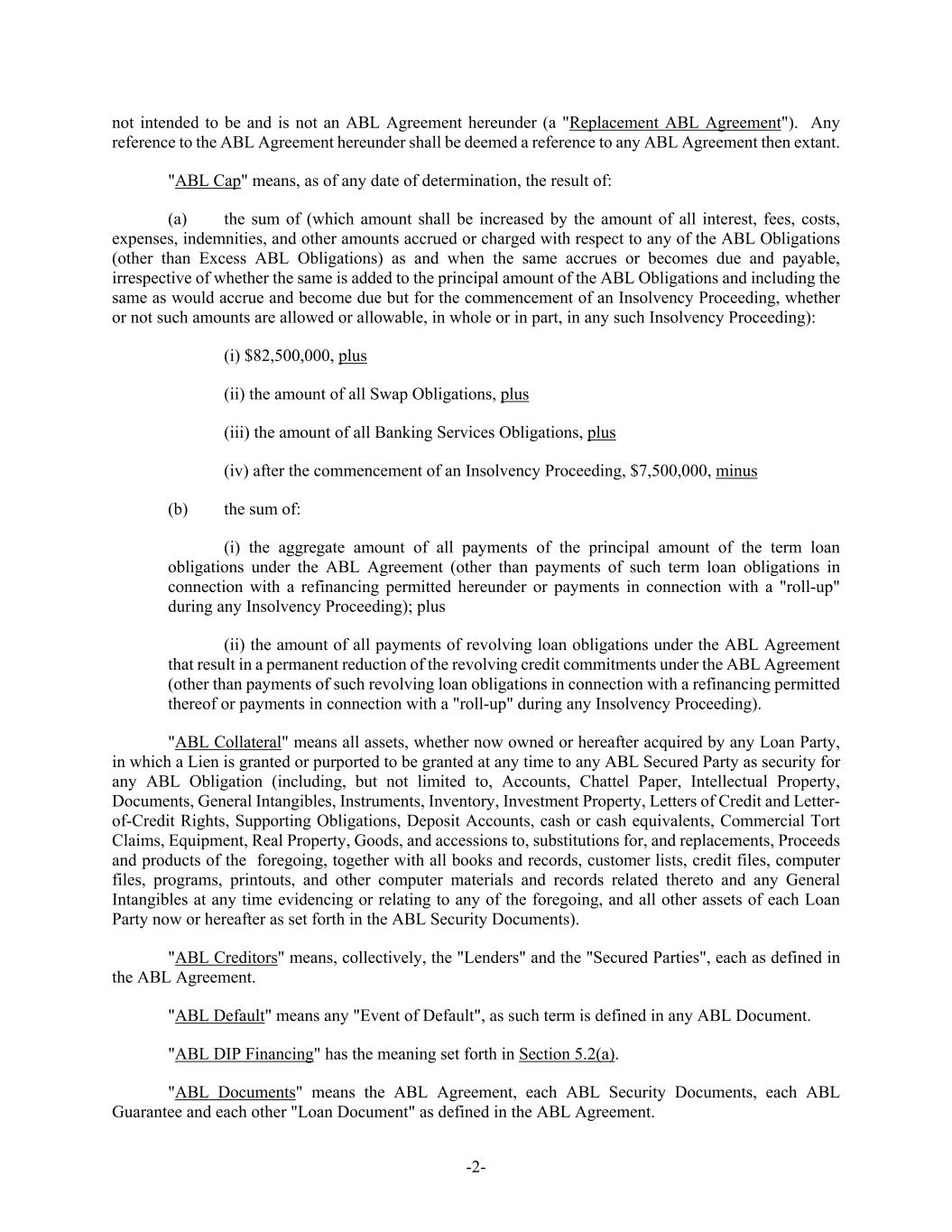 -2- not intended to be and is not an ABL Agreement hereunder (a "Replacement ABL Agreement"). Any reference to the ABL Agreement hereunder shall be deemed a reference to any ABL Agreement then extant. "ABL Cap" means, as of any date of determination, the result of: (a) the sum of (which amount shall be increased by the amount of all interest, fees, costs, expenses, indemnities, and other amounts accrued or charged with respect to any of the ABL Obligations (other than Excess ABL Obligations) as and when the same accrues or becomes due and payable, irrespective of whether the same is added to the principal amount of the ABL Obligations and including the same as would accrue and become due but for the commencement of an Insolvency Proceeding, whether or not such amounts are allowed or allowable, in whole or in part, in any such Insolvency Proceeding): (i) $82,500,000, plus (ii) the amount of all Swap Obligations, plus (iii) the amount of all Banking Services Obligations, plus (iv) after the commencement of an Insolvency Proceeding, $7,500,000, minus (b) the sum of: (i) the aggregate amount of all payments of the principal amount of the term loan obligations under the ABL Agreement (other than payments of such term loan obligations in connection with a refinancing permitted hereunder or payments in connection with a "roll-up" during any Insolvency Proceeding); plus (ii) the amount of all payments of revolving loan obligations under the ABL Agreement that result in a permanent reduction of the revolving credit commitments under the ABL Agreement (other than payments of such revolving loan obligations in connection with a refinancing permitted thereof or payments in connection with a "roll-up" during any Insolvency Proceeding). "ABL Collateral" means all assets, whether now owned or hereafter acquired by any Loan Party, in which a Lien is granted or purported to be granted at any time to any ABL Secured Party as security for any ABL Obligation (including, but not limited to, Accounts, Chattel Paper, Intellectual Property, Documents, General Intangibles, Instruments, Inventory, Investment Property, Letters of Credit and Letter- of-Credit Rights, Supporting Obligations, Deposit Accounts, cash or cash equivalents, Commercial Tort Claims, Equipment, Real Property, Goods, and accessions to, substitutions for, and replacements, Proceeds and products of the foregoing, together with all books and records, customer lists, credit files, computer files, programs, printouts, and other computer materials and records related thereto and any General Intangibles at any time evidencing or relating to any of the foregoing, and all other assets of each Loan Party now or hereafter as set forth in the ABL Security Documents). "ABL Creditors" means, collectively, the "Lenders" and the "Secured Parties", each as defined in the ABL Agreement. "ABL Default" means any "Event of Default", as such term is defined in any ABL Document. "ABL DIP Financing" has the meaning set forth in Section 5.2(a). "ABL Documents" means the ABL Agreement, each ABL Security Documents, each ABL Guarantee and each other "Loan Document" as defined in the ABL Agreement.