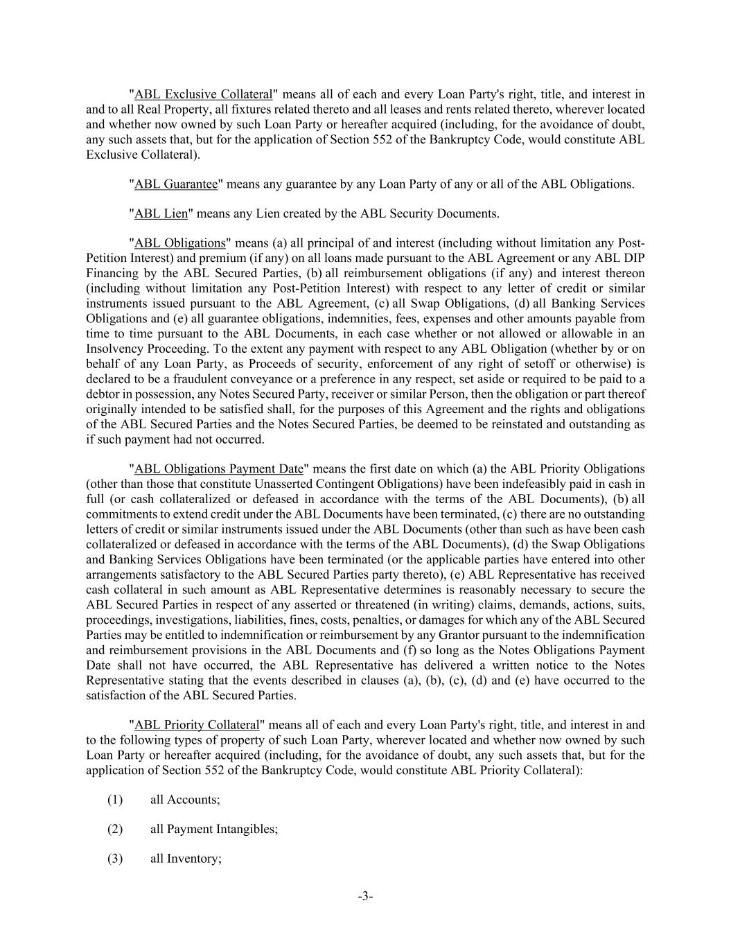 -3- "ABL Exclusive Collateral" means all of each and every Loan Party's right, title, and interest in and to all Real Property, all fixtures related thereto and all leases and rents related thereto, wherever located and whether now owned by such Loan Party or hereafter acquired (including, for the avoidance of doubt, any such assets that, but for the application of Section 552 of the Bankruptcy Code, would constitute ABL Exclusive Collateral). "ABL Guarantee" means any guarantee by any Loan Party of any or all of the ABL Obligations. "ABL Lien" means any Lien created by the ABL Security Documents. "ABL Obligations" means (a) all principal of and interest (including without limitation any Post- Petition Interest) and premium (if any) on all loans made pursuant to the ABL Agreement or any ABL DIP Financing by the ABL Secured Parties, (b) all reimbursement obligations (if any) and interest thereon (including without limitation any Post-Petition Interest) with respect to any letter of credit or similar instruments issued pursuant to the ABL Agreement, (c) all Swap Obligations, (d) all Banking Services Obligations and (e) all guarantee obligations, indemnities, fees, expenses and other amounts payable from time to time pursuant to the ABL Documents, in each case whether or not allowed or allowable in an Insolvency Proceeding. To the extent any payment with respect to any ABL Obligation (whether by or on behalf of any Loan Party, as Proceeds of security, enforcement of any right of setoff or otherwise) is declared to be a fraudulent conveyance or a preference in any respect, set aside or required to be paid to a debtor in possession, any Notes Secured Party, receiver or similar Person, then the obligation or part thereof originally intended to be satisfied shall, for the purposes of this Agreement and the rights and obligations of the ABL Secured Parties and the Notes Secured Parties, be deemed to be reinstated and outstanding as if such payment had not occurred. "ABL Obligations Payment Date" means the first date on which (a) the ABL Priority Obligations (other than those that constitute Unasserted Contingent Obligations) have been indefeasibly paid in cash in full (or cash collateralized or defeased in accordance with the terms of the ABL Documents), (b) all commitments to extend credit under the ABL Documents have been terminated, (c) there are no outstanding letters of credit or similar instruments issued under the ABL Documents (other than such as have been cash collateralized or defeased in accordance with the terms of the ABL Documents), (d) the Swap Obligations and Banking Services Obligations have been terminated (or the applicable parties have entered into other arrangements satisfactory to the ABL Secured Parties party thereto), (e) ABL Representative has received cash collateral in such amount as ABL Representative determines is reasonably necessary to secure the ABL Secured Parties in respect of any asserted or threatened (in writing) claims, demands, actions, suits, proceedings, investigations, liabilities, fines, costs, penalties, or damages for which any of the ABL Secured Parties may be entitled to indemnification or reimbursement by any Grantor pursuant to the indemnification and reimbursement provisions in the ABL Documents and (f) so long as the Notes Obligations Payment Date shall not have occurred, the ABL Representative has delivered a written notice to the Notes Representative stating that the events described in clauses (a), (b), (c), (d) and (e) have occurred to the satisfaction of the ABL Secured Parties. "ABL Priority Collateral" means all of each and every Loan Party's right, title, and interest in and to the following types of property of such Loan Party, wherever located and whether now owned by such Loan Party or hereafter acquired (including, for the avoidance of doubt, any such assets that, but for the application of Section 552 of the Bankruptcy Code, would constitute ABL Priority Collateral): (1) all Accounts; (2) all Payment Intangibles; (3) all Inventory;