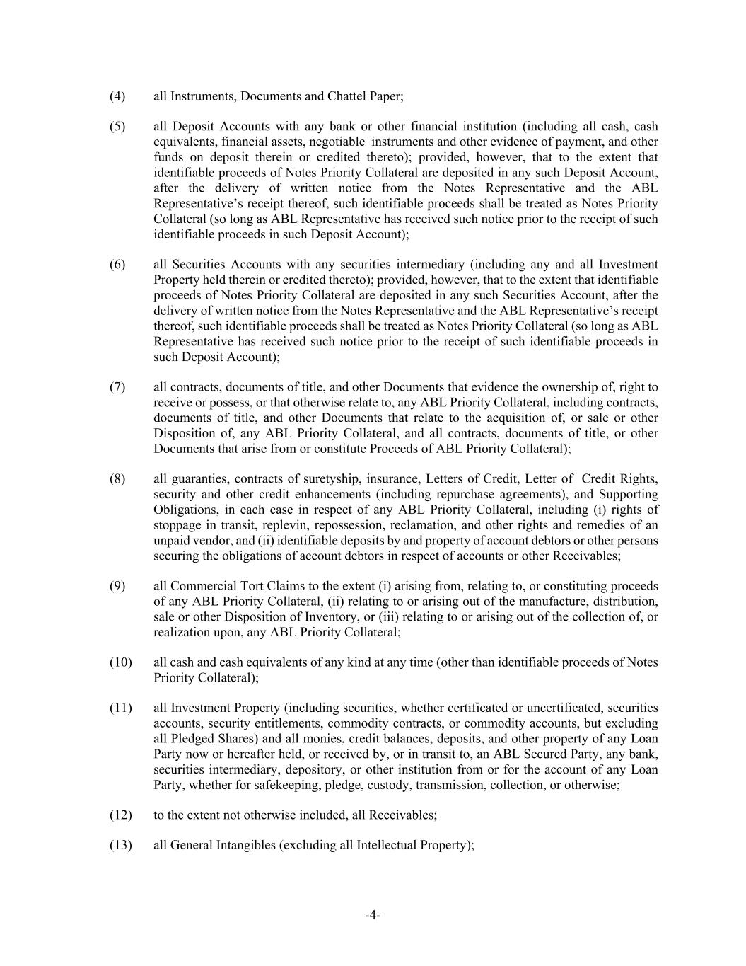 -4- (4) all Instruments, Documents and Chattel Paper; (5) all Deposit Accounts with any bank or other financial institution (including all cash, cash equivalents, financial assets, negotiable instruments and other evidence of payment, and other funds on deposit therein or credited thereto); provided, however, that to the extent that identifiable proceeds of Notes Priority Collateral are deposited in any such Deposit Account, after the delivery of written notice from the Notes Representative and the ABL Representative’s receipt thereof, such identifiable proceeds shall be treated as Notes Priority Collateral (so long as ABL Representative has received such notice prior to the receipt of such identifiable proceeds in such Deposit Account); (6) all Securities Accounts with any securities intermediary (including any and all Investment Property held therein or credited thereto); provided, however, that to the extent that identifiable proceeds of Notes Priority Collateral are deposited in any such Securities Account, after the delivery of written notice from the Notes Representative and the ABL Representative’s receipt thereof, such identifiable proceeds shall be treated as Notes Priority Collateral (so long as ABL Representative has received such notice prior to the receipt of such identifiable proceeds in such Deposit Account); (7) all contracts, documents of title, and other Documents that evidence the ownership of, right to receive or possess, or that otherwise relate to, any ABL Priority Collateral, including contracts, documents of title, and other Documents that relate to the acquisition of, or sale or other Disposition of, any ABL Priority Collateral, and all contracts, documents of title, or other Documents that arise from or constitute Proceeds of ABL Priority Collateral); (8) all guaranties, contracts of suretyship, insurance, Letters of Credit, Letter of Credit Rights, security and other credit enhancements (including repurchase agreements), and Supporting Obligations, in each case in respect of any ABL Priority Collateral, including (i) rights of stoppage in transit, replevin, repossession, reclamation, and other rights and remedies of an unpaid vendor, and (ii) identifiable deposits by and property of account debtors or other persons securing the obligations of account debtors in respect of accounts or other Receivables; (9) all Commercial Tort Claims to the extent (i) arising from, relating to, or constituting proceeds of any ABL Priority Collateral, (ii) relating to or arising out of the manufacture, distribution, sale or other Disposition of Inventory, or (iii) relating to or arising out of the collection of, or realization upon, any ABL Priority Collateral; (10) all cash and cash equivalents of any kind at any time (other than identifiable proceeds of Notes Priority Collateral); (11) all Investment Property (including securities, whether certificated or uncertificated, securities accounts, security entitlements, commodity contracts, or commodity accounts, but excluding all Pledged Shares) and all monies, credit balances, deposits, and other property of any Loan Party now or hereafter held, or received by, or in transit to, an ABL Secured Party, any bank, securities intermediary, depository, or other institution from or for the account of any Loan Party, whether for safekeeping, pledge, custody, transmission, collection, or otherwise; (12) to the extent not otherwise included, all Receivables; (13) all General Intangibles (excluding all Intellectual Property);