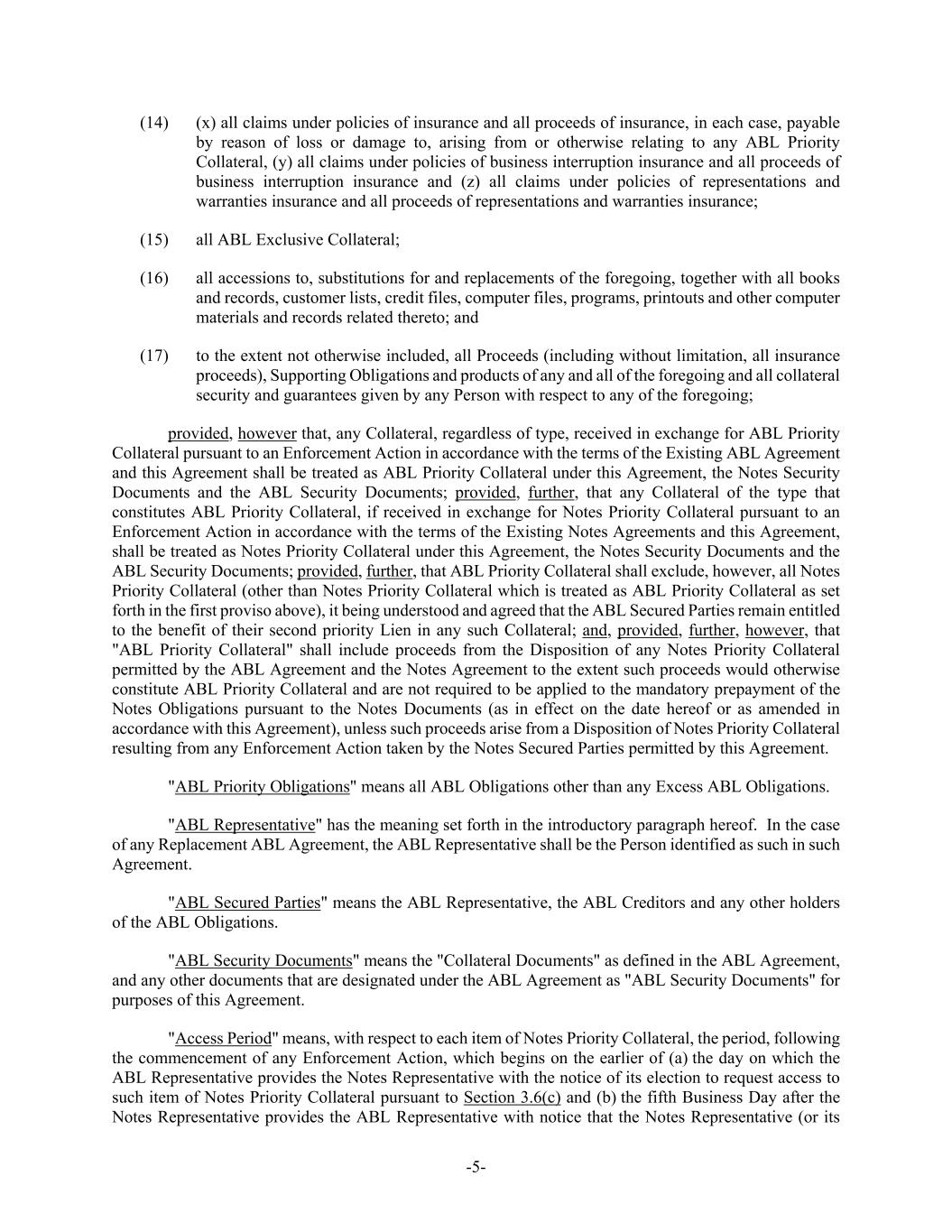 -5- (14) (x) all claims under policies of insurance and all proceeds of insurance, in each case, payable by reason of loss or damage to, arising from or otherwise relating to any ABL Priority Collateral, (y) all claims under policies of business interruption insurance and all proceeds of business interruption insurance and (z) all claims under policies of representations and warranties insurance and all proceeds of representations and warranties insurance; (15) all ABL Exclusive Collateral; (16) all accessions to, substitutions for and replacements of the foregoing, together with all books and records, customer lists, credit files, computer files, programs, printouts and other computer materials and records related thereto; and (17) to the extent not otherwise included, all Proceeds (including without limitation, all insurance proceeds), Supporting Obligations and products of any and all of the foregoing and all collateral security and guarantees given by any Person with respect to any of the foregoing; provided, however that, any Collateral, regardless of type, received in exchange for ABL Priority Collateral pursuant to an Enforcement Action in accordance with the terms of the Existing ABL Agreement and this Agreement shall be treated as ABL Priority Collateral under this Agreement, the Notes Security Documents and the ABL Security Documents; provided, further, that any Collateral of the type that constitutes ABL Priority Collateral, if received in exchange for Notes Priority Collateral pursuant to an Enforcement Action in accordance with the terms of the Existing Notes Agreements and this Agreement, shall be treated as Notes Priority Collateral under this Agreement, the Notes Security Documents and the ABL Security Documents; provided, further, that ABL Priority Collateral shall exclude, however, all Notes Priority Collateral (other than Notes Priority Collateral which is treated as ABL Priority Collateral as set forth in the first proviso above), it being understood and agreed that the ABL Secured Parties remain entitled to the benefit of their second priority Lien in any such Collateral; and, provided, further, however, that "ABL Priority Collateral" shall include proceeds from the Disposition of any Notes Priority Collateral permitted by the ABL Agreement and the Notes Agreement to the extent such proceeds would otherwise constitute ABL Priority Collateral and are not required to be applied to the mandatory prepayment of the Notes Obligations pursuant to the Notes Documents (as in effect on the date hereof or as amended in accordance with this Agreement), unless such proceeds arise from a Disposition of Notes Priority Collateral resulting from any Enforcement Action taken by the Notes Secured Parties permitted by this Agreement. "ABL Priority Obligations" means all ABL Obligations other than any Excess ABL Obligations. "ABL Representative" has the meaning set forth in the introductory paragraph hereof. In the case of any Replacement ABL Agreement, the ABL Representative shall be the Person identified as such in such Agreement. "ABL Secured Parties" means the ABL Representative, the ABL Creditors and any other holders of the ABL Obligations. "ABL Security Documents" means the "Collateral Documents" as defined in the ABL Agreement, and any other documents that are designated under the ABL Agreement as "ABL Security Documents" for purposes of this Agreement. "Access Period" means, with respect to each item of Notes Priority Collateral, the period, following the commencement of any Enforcement Action, which begins on the earlier of (a) the day on which the ABL Representative provides the Notes Representative with the notice of its election to request access to such item of Notes Priority Collateral pursuant to Section 3.6(c) and (b) the fifth Business Day after the Notes Representative provides the ABL Representative with notice that the Notes Representative (or its