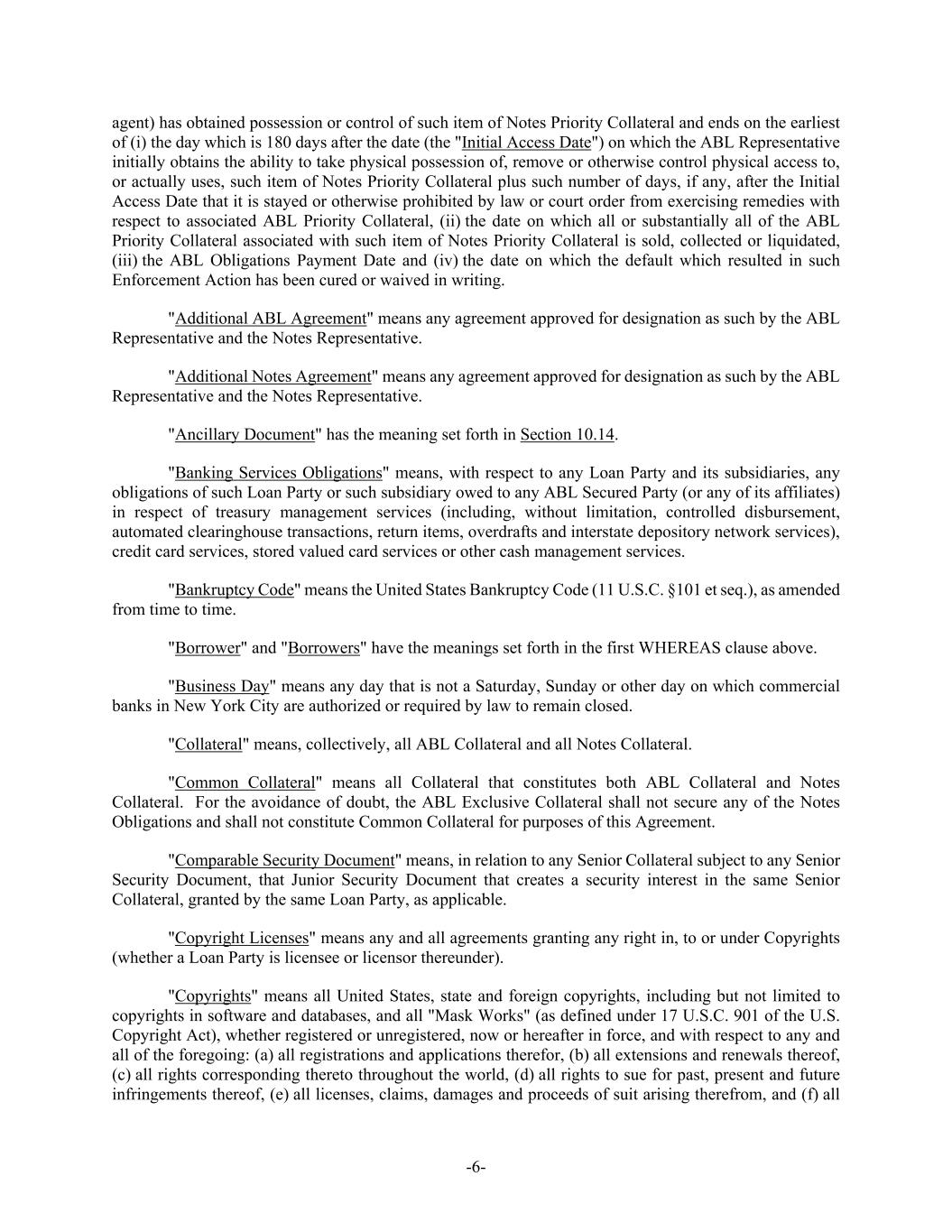 -6- agent) has obtained possession or control of such item of Notes Priority Collateral and ends on the earliest of (i) the day which is 180 days after the date (the "Initial Access Date") on which the ABL Representative initially obtains the ability to take physical possession of, remove or otherwise control physical access to, or actually uses, such item of Notes Priority Collateral plus such number of days, if any, after the Initial Access Date that it is stayed or otherwise prohibited by law or court order from exercising remedies with respect to associated ABL Priority Collateral, (ii) the date on which all or substantially all of the ABL Priority Collateral associated with such item of Notes Priority Collateral is sold, collected or liquidated, (iii) the ABL Obligations Payment Date and (iv) the date on which the default which resulted in such Enforcement Action has been cured or waived in writing. "Additional ABL Agreement" means any agreement approved for designation as such by the ABL Representative and the Notes Representative. "Additional Notes Agreement" means any agreement approved for designation as such by the ABL Representative and the Notes Representative. "Ancillary Document" has the meaning set forth in Section 10.14. "Banking Services Obligations" means, with respect to any Loan Party and its subsidiaries, any obligations of such Loan Party or such subsidiary owed to any ABL Secured Party (or any of its affiliates) in respect of treasury management services (including, without limitation, controlled disbursement, automated clearinghouse transactions, return items, overdrafts and interstate depository network services), credit card services, stored valued card services or other cash management services. "Bankruptcy Code" means the United States Bankruptcy Code (11 U.S.C. §101 et seq.), as amended from time to time. "Borrower" and "Borrowers" have the meanings set forth in the first WHEREAS clause above. "Business Day" means any day that is not a Saturday, Sunday or other day on which commercial banks in New York City are authorized or required by law to remain closed. "Collateral" means, collectively, all ABL Collateral and all Notes Collateral. "Common Collateral" means all Collateral that constitutes both ABL Collateral and Notes Collateral. For the avoidance of doubt, the ABL Exclusive Collateral shall not secure any of the Notes Obligations and shall not constitute Common Collateral for purposes of this Agreement. "Comparable Security Document" means, in relation to any Senior Collateral subject to any Senior Security Document, that Junior Security Document that creates a security interest in the same Senior Collateral, granted by the same Loan Party, as applicable. "Copyright Licenses" means any and all agreements granting any right in, to or under Copyrights (whether a Loan Party is licensee or licensor thereunder). "Copyrights" means all United States, state and foreign copyrights, including but not limited to copyrights in software and databases, and all "Mask Works" (as defined under 17 U.S.C. 901 of the U.S. Copyright Act), whether registered or unregistered, now or hereafter in force, and with respect to any and all of the foregoing: (a) all registrations and applications therefor, (b) all extensions and renewals thereof, (c) all rights corresponding thereto throughout the world, (d) all rights to sue for past, present and future infringements thereof, (e) all licenses, claims, damages and proceeds of suit arising therefrom, and (f) all