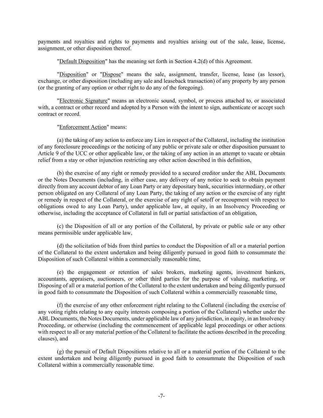 -7- payments and royalties and rights to payments and royalties arising out of the sale, lease, license, assignment, or other disposition thereof. "Default Disposition" has the meaning set forth in Section 4.2(d) of this Agreement. "Disposition" or "Dispose" means the sale, assignment, transfer, license, lease (as lessor), exchange, or other disposition (including any sale and leaseback transaction) of any property by any person (or the granting of any option or other right to do any of the foregoing). "Electronic Signature" means an electronic sound, symbol, or process attached to, or associated with, a contract or other record and adopted by a Person with the intent to sign, authenticate or accept such contract or record. "Enforcement Action" means: (a) the taking of any action to enforce any Lien in respect of the Collateral, including the institution of any foreclosure proceedings or the noticing of any public or private sale or other disposition pursuant to Article 9 of the UCC or other applicable law, or the taking of any action in an attempt to vacate or obtain relief from a stay or other injunction restricting any other action described in this definition, (b) the exercise of any right or remedy provided to a secured creditor under the ABL Documents or the Notes Documents (including, in either case, any delivery of any notice to seek to obtain payment directly from any account debtor of any Loan Party or any depositary bank, securities intermediary, or other person obligated on any Collateral of any Loan Party, the taking of any action or the exercise of any right or remedy in respect of the Collateral, or the exercise of any right of setoff or recoupment with respect to obligations owed to any Loan Party), under applicable law, at equity, in an Insolvency Proceeding or otherwise, including the acceptance of Collateral in full or partial satisfaction of an obligation, (c) the Disposition of all or any portion of the Collateral, by private or public sale or any other means permissible under applicable law, (d) the solicitation of bids from third parties to conduct the Disposition of all or a material portion of the Collateral to the extent undertaken and being diligently pursued in good faith to consummate the Disposition of such Collateral within a commercially reasonable time, (e) the engagement or retention of sales brokers, marketing agents, investment bankers, accountants, appraisers, auctioneers, or other third parties for the purpose of valuing, marketing, or Disposing of all or a material portion of the Collateral to the extent undertaken and being diligently pursued in good faith to consummate the Disposition of such Collateral within a commercially reasonable time, (f) the exercise of any other enforcement right relating to the Collateral (including the exercise of any voting rights relating to any equity interests composing a portion of the Collateral) whether under the ABL Documents, the Notes Documents, under applicable law of any jurisdiction, in equity, in an Insolvency Proceeding, or otherwise (including the commencement of applicable legal proceedings or other actions with respect to all or any material portion of the Collateral to facilitate the actions described in the preceding clauses), and (g) the pursuit of Default Dispositions relative to all or a material portion of the Collateral to the extent undertaken and being diligently pursued in good faith to consummate the Disposition of such Collateral within a commercially reasonable time.
