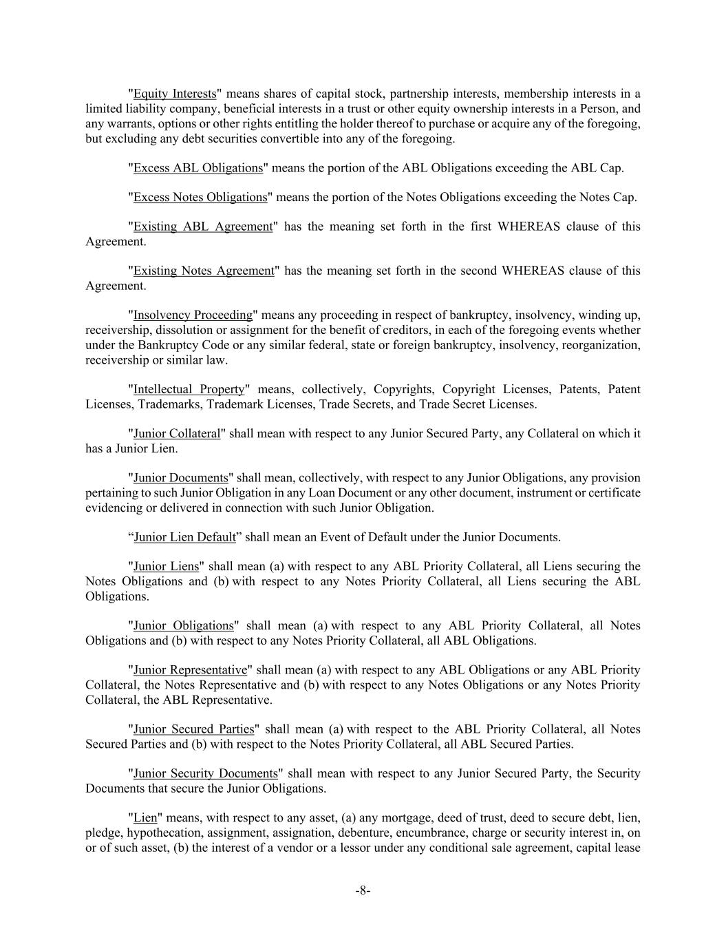 -8- "Equity Interests" means shares of capital stock, partnership interests, membership interests in a limited liability company, beneficial interests in a trust or other equity ownership interests in a Person, and any warrants, options or other rights entitling the holder thereof to purchase or acquire any of the foregoing, but excluding any debt securities convertible into any of the foregoing. "Excess ABL Obligations" means the portion of the ABL Obligations exceeding the ABL Cap. "Excess Notes Obligations" means the portion of the Notes Obligations exceeding the Notes Cap. "Existing ABL Agreement" has the meaning set forth in the first WHEREAS clause of this Agreement. "Existing Notes Agreement" has the meaning set forth in the second WHEREAS clause of this Agreement. "Insolvency Proceeding" means any proceeding in respect of bankruptcy, insolvency, winding up, receivership, dissolution or assignment for the benefit of creditors, in each of the foregoing events whether under the Bankruptcy Code or any similar federal, state or foreign bankruptcy, insolvency, reorganization, receivership or similar law. "Intellectual Property" means, collectively, Copyrights, Copyright Licenses, Patents, Patent Licenses, Trademarks, Trademark Licenses, Trade Secrets, and Trade Secret Licenses. "Junior Collateral" shall mean with respect to any Junior Secured Party, any Collateral on which it has a Junior Lien. "Junior Documents" shall mean, collectively, with respect to any Junior Obligations, any provision pertaining to such Junior Obligation in any Loan Document or any other document, instrument or certificate evidencing or delivered in connection with such Junior Obligation. “Junior Lien Default” shall mean an Event of Default under the Junior Documents. "Junior Liens" shall mean (a) with respect to any ABL Priority Collateral, all Liens securing the Notes Obligations and (b) with respect to any Notes Priority Collateral, all Liens securing the ABL Obligations. "Junior Obligations" shall mean (a) with respect to any ABL Priority Collateral, all Notes Obligations and (b) with respect to any Notes Priority Collateral, all ABL Obligations. "Junior Representative" shall mean (a) with respect to any ABL Obligations or any ABL Priority Collateral, the Notes Representative and (b) with respect to any Notes Obligations or any Notes Priority Collateral, the ABL Representative. "Junior Secured Parties" shall mean (a) with respect to the ABL Priority Collateral, all Notes Secured Parties and (b) with respect to the Notes Priority Collateral, all ABL Secured Parties. "Junior Security Documents" shall mean with respect to any Junior Secured Party, the Security Documents that secure the Junior Obligations. "Lien" means, with respect to any asset, (a) any mortgage, deed of trust, deed to secure debt, lien, pledge, hypothecation, assignment, assignation, debenture, encumbrance, charge or security interest in, on or of such asset, (b) the interest of a vendor or a lessor under any conditional sale agreement, capital lease