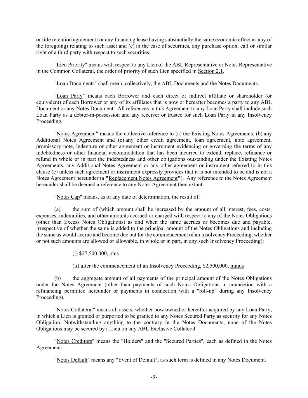 -9- or title retention agreement (or any financing lease having substantially the same economic effect as any of the foregoing) relating to such asset and (c) in the case of securities, any purchase option, call or similar right of a third party with respect to such securities. "Lien Priority" means with respect to any Lien of the ABL Representative or Notes Representative in the Common Collateral, the order of priority of such Lien specified in Section 2.1. "Loan Documents" shall mean, collectively, the ABL Documents and the Notes Documents. "Loan Party" means each Borrower and each direct or indirect affiliate or shareholder (or equivalent) of each Borrower or any of its affiliates that is now or hereafter becomes a party to any ABL Document or any Notes Document. All references in this Agreement to any Loan Party shall include such Loan Party as a debtor-in-possession and any receiver or trustee for such Loan Party in any Insolvency Proceeding. "Notes Agreement" means the collective reference to (a) the Existing Notes Agreements, (b) any Additional Notes Agreement and (c) any other credit agreement, loan agreement, note agreement, promissory note, indenture or other agreement or instrument evidencing or governing the terms of any indebtedness or other financial accommodation that has been incurred to extend, replace, refinance or refund in whole or in part the indebtedness and other obligations outstanding under the Existing Notes Agreements, any Additional Notes Agreement or any other agreement or instrument referred to in this clause (c) unless such agreement or instrument expressly provides that it is not intended to be and is not a Notes Agreement hereunder (a "Replacement Notes Agreement"). Any reference to the Notes Agreement hereunder shall be deemed a reference to any Notes Agreement then extant. "Notes Cap" means, as of any date of determination, the result of: (a) the sum of (which amount shall be increased by the amount of all interest, fees, costs, expenses, indemnities, and other amounts accrued or charged with respect to any of the Notes Obligations (other than Excess Notes Obligations) as and when the same accrues or becomes due and payable, irrespective of whether the same is added to the principal amount of the Notes Obligations and including the same as would accrue and become due but for the commencement of an Insolvency Proceeding, whether or not such amounts are allowed or allowable, in whole or in part, in any such Insolvency Proceeding): (i) $27,500,000, plus (ii) after the commencement of an Insolvency Proceeding, $2,500,000, minus (b) the aggregate amount of all payments of the principal amount of the Notes Obligations under the Notes Agreement (other than payments of such Notes Obligations in connection with a refinancing permitted hereunder or payments in connection with a "roll-up" during any Insolvency Proceeding). "Notes Collateral" means all assets, whether now owned or hereafter acquired by any Loan Party, in which a Lien is granted or purported to be granted to any Notes Secured Party as security for any Notes Obligation. Notwithstanding anything to the contrary in the Notes Documents, none of the Notes Obligations may be secured by a Lien on any ABL Exclusive Collateral "Notes Creditors" means the "Holders" and the "Secured Parties", each as defined in the Notes Agreement. "Notes Default" means any "Event of Default", as such term is defined in any Notes Document.