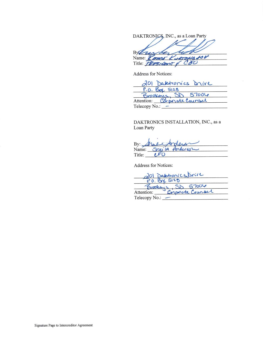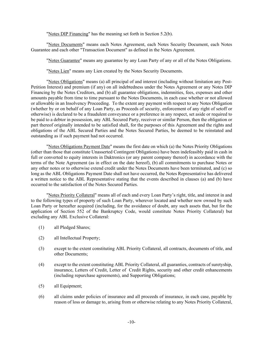 -10- "Notes DIP Financing" has the meaning set forth in Section 5.2(b). "Notes Documents" means each Notes Agreement, each Notes Security Document, each Notes Guarantee and each other "Transaction Document" as defined in the Notes Agreement. "Notes Guarantee" means any guarantee by any Loan Party of any or all of the Notes Obligations. "Notes Lien" means any Lien created by the Notes Security Documents. "Notes Obligations" means (a) all principal of and interest (including without limitation any Post- Petition Interest) and premium (if any) on all indebtedness under the Notes Agreement or any Notes DIP Financing by the Notes Creditors, and (b) all guarantee obligations, indemnities, fees, expenses and other amounts payable from time to time pursuant to the Notes Documents, in each case whether or not allowed or allowable in an Insolvency Proceeding. To the extent any payment with respect to any Notes Obligation (whether by or on behalf of any Loan Party, as Proceeds of security, enforcement of any right of setoff or otherwise) is declared to be a fraudulent conveyance or a preference in any respect, set aside or required to be paid to a debtor in possession, any ABL Secured Party, receiver or similar Person, then the obligation or part thereof originally intended to be satisfied shall, for the purposes of this Agreement and the rights and obligations of the ABL Secured Parties and the Notes Secured Parties, be deemed to be reinstated and outstanding as if such payment had not occurred. "Notes Obligations Payment Date" means the first date on which (a) the Notes Priority Obligations (other than those that constitute Unasserted Contingent Obligations) have been indefeasibly paid in cash in full or converted to equity interests in Daktronics (or any parent company thereof) in accordance with the terms of the Note Agreement (as in effect on the date hereof), (b) all commitments to purchase Notes or any other notes or to otherwise extend credit under the Notes Documents have been terminated, and (c) so long as the ABL Obligations Payment Date shall not have occurred, the Notes Representative has delivered a written notice to the ABL Representative stating that the events described in clauses (a) and (b) have occurred to the satisfaction of the Notes Secured Parties. "Notes Priority Collateral" means all of each and every Loan Party’s right, title, and interest in and to the following types of property of such Loan Party, wherever located and whether now owned by such Loan Party or hereafter acquired (including, for the avoidance of doubt, any such assets that, but for the application of Section 552 of the Bankruptcy Code, would constitute Notes Priority Collateral) but excluding any ABL Exclusive Collateral: (1) all Pledged Shares; (2) all Intellectual Property; (3) except to the extent constituting ABL Priority Collateral, all contracts, documents of title, and other Documents; (4) except to the extent constituting ABL Priority Collateral, all guaranties, contracts of suretyship, insurance, Letters of Credit, Letter of Credit Rights, security and other credit enhancements (including repurchase agreements), and Supporting Obligations; (5) all Equipment; (6) all claims under policies of insurance and all proceeds of insurance, in each case, payable by reason of loss or damage to, arising from or otherwise relating to any Notes Priority Collateral,