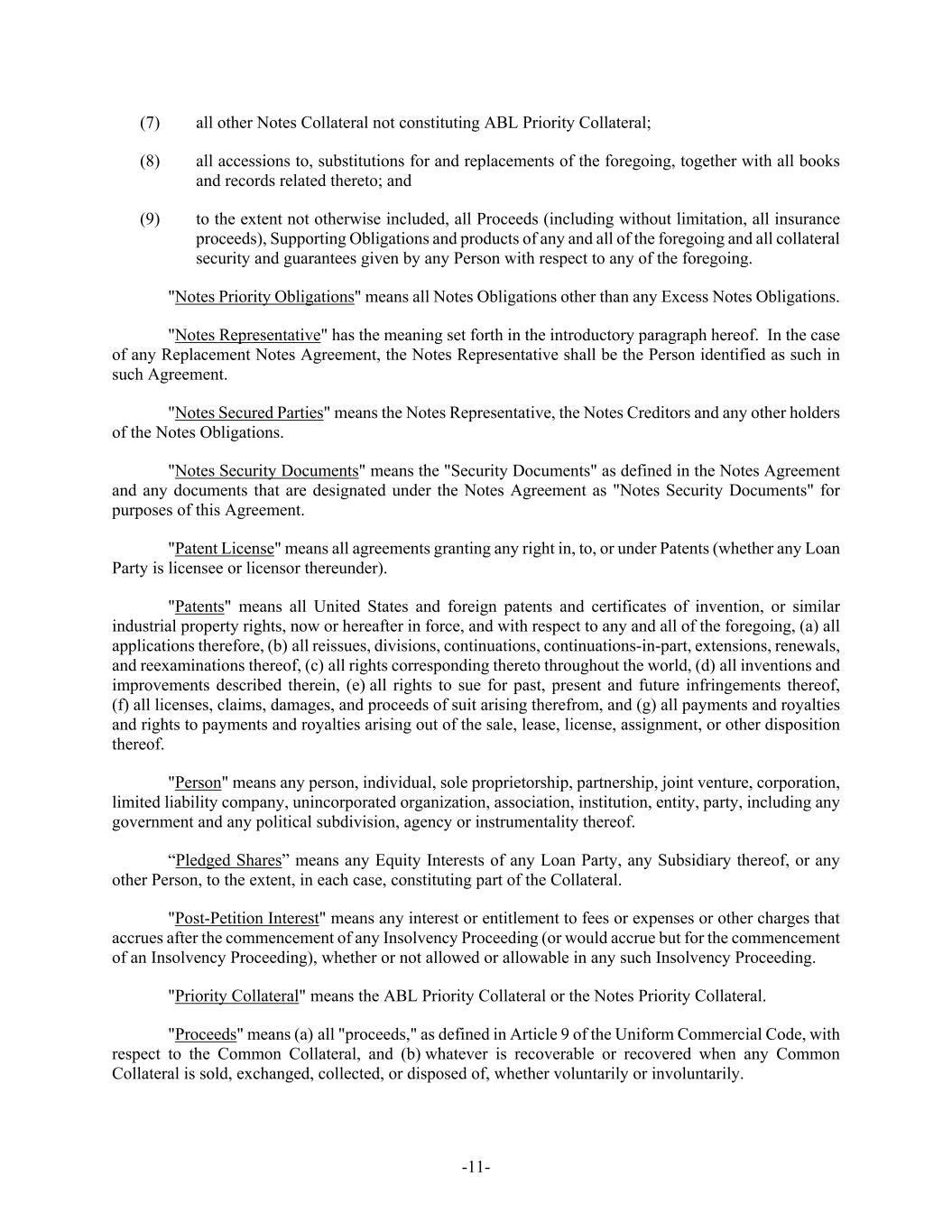 -11- (7) all other Notes Collateral not constituting ABL Priority Collateral; (8) all accessions to, substitutions for and replacements of the foregoing, together with all books and records related thereto; and (9) to the extent not otherwise included, all Proceeds (including without limitation, all insurance proceeds), Supporting Obligations and products of any and all of the foregoing and all collateral security and guarantees given by any Person with respect to any of the foregoing. "Notes Priority Obligations" means all Notes Obligations other than any Excess Notes Obligations. "Notes Representative" has the meaning set forth in the introductory paragraph hereof. In the case of any Replacement Notes Agreement, the Notes Representative shall be the Person identified as such in such Agreement. "Notes Secured Parties" means the Notes Representative, the Notes Creditors and any other holders of the Notes Obligations. "Notes Security Documents" means the "Security Documents" as defined in the Notes Agreement and any documents that are designated under the Notes Agreement as "Notes Security Documents" for purposes of this Agreement. "Patent License" means all agreements granting any right in, to, or under Patents (whether any Loan Party is licensee or licensor thereunder). "Patents" means all United States and foreign patents and certificates of invention, or similar industrial property rights, now or hereafter in force, and with respect to any and all of the foregoing, (a) all applications therefore, (b) all reissues, divisions, continuations, continuations-in-part, extensions, renewals, and reexaminations thereof, (c) all rights corresponding thereto throughout the world, (d) all inventions and improvements described therein, (e) all rights to sue for past, present and future infringements thereof, (f) all licenses, claims, damages, and proceeds of suit arising therefrom, and (g) all payments and royalties and rights to payments and royalties arising out of the sale, lease, license, assignment, or other disposition thereof. "Person" means any person, individual, sole proprietorship, partnership, joint venture, corporation, limited liability company, unincorporated organization, association, institution, entity, party, including any government and any political subdivision, agency or instrumentality thereof. “Pledged Shares” means any Equity Interests of any Loan Party, any Subsidiary thereof, or any other Person, to the extent, in each case, constituting part of the Collateral. "Post-Petition Interest" means any interest or entitlement to fees or expenses or other charges that accrues after the commencement of any Insolvency Proceeding (or would accrue but for the commencement of an Insolvency Proceeding), whether or not allowed or allowable in any such Insolvency Proceeding. "Priority Collateral" means the ABL Priority Collateral or the Notes Priority Collateral. "Proceeds" means (a) all "proceeds," as defined in Article 9 of the Uniform Commercial Code, with respect to the Common Collateral, and (b) whatever is recoverable or recovered when any Common Collateral is sold, exchanged, collected, or disposed of, whether voluntarily or involuntarily.