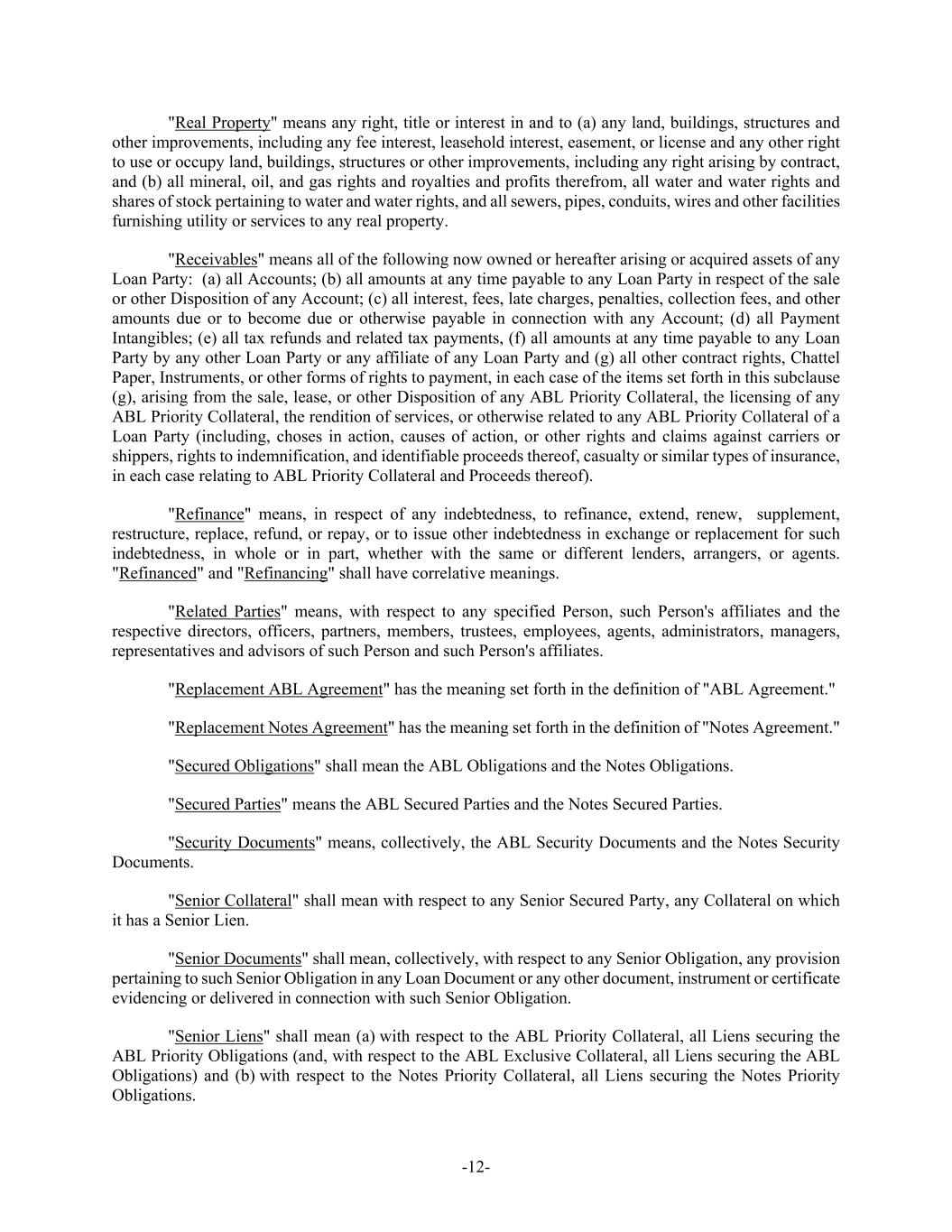 -12- "Real Property" means any right, title or interest in and to (a) any land, buildings, structures and other improvements, including any fee interest, leasehold interest, easement, or license and any other right to use or occupy land, buildings, structures or other improvements, including any right arising by contract, and (b) all mineral, oil, and gas rights and royalties and profits therefrom, all water and water rights and shares of stock pertaining to water and water rights, and all sewers, pipes, conduits, wires and other facilities furnishing utility or services to any real property. "Receivables" means all of the following now owned or hereafter arising or acquired assets of any Loan Party: (a) all Accounts; (b) all amounts at any time payable to any Loan Party in respect of the sale or other Disposition of any Account; (c) all interest, fees, late charges, penalties, collection fees, and other amounts due or to become due or otherwise payable in connection with any Account; (d) all Payment Intangibles; (e) all tax refunds and related tax payments, (f) all amounts at any time payable to any Loan Party by any other Loan Party or any affiliate of any Loan Party and (g) all other contract rights, Chattel Paper, Instruments, or other forms of rights to payment, in each case of the items set forth in this subclause (g), arising from the sale, lease, or other Disposition of any ABL Priority Collateral, the licensing of any ABL Priority Collateral, the rendition of services, or otherwise related to any ABL Priority Collateral of a Loan Party (including, choses in action, causes of action, or other rights and claims against carriers or shippers, rights to indemnification, and identifiable proceeds thereof, casualty or similar types of insurance, in each case relating to ABL Priority Collateral and Proceeds thereof). "Refinance" means, in respect of any indebtedness, to refinance, extend, renew, supplement, restructure, replace, refund, or repay, or to issue other indebtedness in exchange or replacement for such indebtedness, in whole or in part, whether with the same or different lenders, arrangers, or agents. "Refinanced" and "Refinancing" shall have correlative meanings. "Related Parties" means, with respect to any specified Person, such Person's affiliates and the respective directors, officers, partners, members, trustees, employees, agents, administrators, managers, representatives and advisors of such Person and such Person's affiliates. "Replacement ABL Agreement" has the meaning set forth in the definition of "ABL Agreement." "Replacement Notes Agreement" has the meaning set forth in the definition of "Notes Agreement." "Secured Obligations" shall mean the ABL Obligations and the Notes Obligations. "Secured Parties" means the ABL Secured Parties and the Notes Secured Parties. "Security Documents" means, collectively, the ABL Security Documents and the Notes Security Documents. "Senior Collateral" shall mean with respect to any Senior Secured Party, any Collateral on which it has a Senior Lien. "Senior Documents" shall mean, collectively, with respect to any Senior Obligation, any provision pertaining to such Senior Obligation in any Loan Document or any other document, instrument or certificate evidencing or delivered in connection with such Senior Obligation. "Senior Liens" shall mean (a) with respect to the ABL Priority Collateral, all Liens securing the ABL Priority Obligations (and, with respect to the ABL Exclusive Collateral, all Liens securing the ABL Obligations) and (b) with respect to the Notes Priority Collateral, all Liens securing the Notes Priority Obligations.
