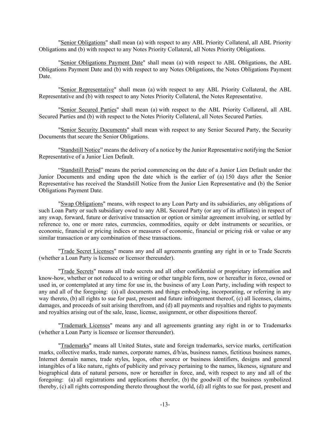 -13- "Senior Obligations" shall mean (a) with respect to any ABL Priority Collateral, all ABL Priority Obligations and (b) with respect to any Notes Priority Collateral, all Notes Priority Obligations. "Senior Obligations Payment Date" shall mean (a) with respect to ABL Obligations, the ABL Obligations Payment Date and (b) with respect to any Notes Obligations, the Notes Obligations Payment Date. "Senior Representative" shall mean (a) with respect to any ABL Priority Collateral, the ABL Representative and (b) with respect to any Notes Priority Collateral, the Notes Representative. "Senior Secured Parties" shall mean (a) with respect to the ABL Priority Collateral, all ABL Secured Parties and (b) with respect to the Notes Priority Collateral, all Notes Secured Parties. "Senior Security Documents" shall mean with respect to any Senior Secured Party, the Security Documents that secure the Senior Obligations. "Standstill Notice” means the delivery of a notice by the Junior Representative notifying the Senior Representative of a Junior Lien Default. “Standstill Period” means the period commencing on the date of a Junior Lien Default under the Junior Documents and ending upon the date which is the earlier of (a) 150 days after the Senior Representative has received the Standstill Notice from the Junior Lien Representative and (b) the Senior Obligations Payment Date. "Swap Obligations" means, with respect to any Loan Party and its subsidiaries, any obligations of such Loan Party or such subsidiary owed to any ABL Secured Party (or any of its affiliates) in respect of any swap, forward, future or derivative transaction or option or similar agreement involving, or settled by reference to, one or more rates, currencies, commodities, equity or debt instruments or securities, or economic, financial or pricing indices or measures of economic, financial or pricing risk or value or any similar transaction or any combination of these transactions. "Trade Secret Licenses" means any and all agreements granting any right in or to Trade Secrets (whether a Loan Party is licensee or licensor thereunder). "Trade Secrets" means all trade secrets and all other confidential or proprietary information and know-how, whether or not reduced to a writing or other tangible form, now or hereafter in force, owned or used in, or contemplated at any time for use in, the business of any Loan Party, including with respect to any and all of the foregoing: (a) all documents and things embodying, incorporating, or referring in any way thereto, (b) all rights to sue for past, present and future infringement thereof, (c) all licenses, claims, damages, and proceeds of suit arising therefrom, and (d) all payments and royalties and rights to payments and royalties arising out of the sale, lease, license, assignment, or other dispositions thereof. "Trademark Licenses" means any and all agreements granting any right in or to Trademarks (whether a Loan Party is licensee or licensor thereunder). "Trademarks" means all United States, state and foreign trademarks, service marks, certification marks, collective marks, trade names, corporate names, d/b/as, business names, fictitious business names, Internet domain names, trade styles, logos, other source or business identifiers, designs and general intangibles of a like nature, rights of publicity and privacy pertaining to the names, likeness, signature and biographical data of natural persons, now or hereafter in force, and, with respect to any and all of the foregoing: (a) all registrations and applications therefor, (b) the goodwill of the business symbolized thereby, (c) all rights corresponding thereto throughout the world, (d) all rights to sue for past, present and
