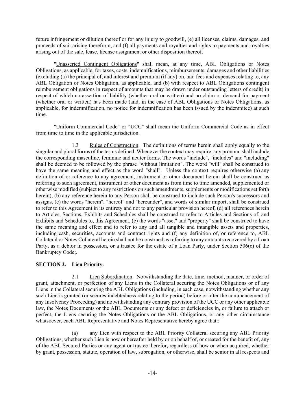 -14- future infringement or dilution thereof or for any injury to goodwill, (e) all licenses, claims, damages, and proceeds of suit arising therefrom, and (f) all payments and royalties and rights to payments and royalties arising out of the sale, lease, license assignment or other disposition thereof. "Unasserted Contingent Obligations" shall mean, at any time, ABL Obligations or Notes Obligations, as applicable, for taxes, costs, indemnifications, reimbursements, damages and other liabilities (excluding (a) the principal of, and interest and premium (if any) on, and fees and expenses relating to, any ABL Obligation or Notes Obligation, as applicable, and (b) with respect to ABL Obligations contingent reimbursement obligations in respect of amounts that may be drawn under outstanding letters of credit) in respect of which no assertion of liability (whether oral or written) and no claim or demand for payment (whether oral or written) has been made (and, in the case of ABL Obligations or Notes Obligations, as applicable, for indemnification, no notice for indemnification has been issued by the indemnitee) at such time. "Uniform Commercial Code" or "UCC" shall mean the Uniform Commercial Code as in effect from time to time in the applicable jurisdiction. 1.3 Rules of Construction. The definitions of terms herein shall apply equally to the singular and plural forms of the terms defined. Whenever the context may require, any pronoun shall include the corresponding masculine, feminine and neuter forms. The words "include", "includes" and "including" shall be deemed to be followed by the phrase "without limitation". The word "will" shall be construed to have the same meaning and effect as the word "shall". Unless the context requires otherwise (a) any definition of or reference to any agreement, instrument or other document herein shall be construed as referring to such agreement, instrument or other document as from time to time amended, supplemented or otherwise modified (subject to any restrictions on such amendments, supplements or modifications set forth herein), (b) any reference herein to any Person shall be construed to include such Person's successors and assigns, (c) the words "herein", "hereof" and "hereunder", and words of similar import, shall be construed to refer to this Agreement in its entirety and not to any particular provision hereof, (d) all references herein to Articles, Sections, Exhibits and Schedules shall be construed to refer to Articles and Sections of, and Exhibits and Schedules to, this Agreement, (e) the words "asset" and "property" shall be construed to have the same meaning and effect and to refer to any and all tangible and intangible assets and properties, including cash, securities, accounts and contract rights and (f) any definition of, or reference to, ABL Collateral or Notes Collateral herein shall not be construed as referring to any amounts recovered by a Loan Party, as a debtor in possession, or a trustee for the estate of a Loan Party, under Section 506(c) of the Bankruptcy Code;. SECTION 2. Lien Priority. 2.1 Lien Subordination. Notwithstanding the date, time, method, manner, or order of grant, attachment, or perfection of any Liens in the Collateral securing the Notes Obligations or of any Liens in the Collateral securing the ABL Obligations (including, in each case, notwithstanding whether any such Lien is granted (or secures indebtedness relating to the period) before or after the commencement of any Insolvency Proceeding) and notwithstanding any contrary provision of the UCC or any other applicable law, the Notes Documents or the ABL Documents or any defect or deficiencies in, or failure to attach or perfect, the Liens securing the Notes Obligations or the ABL Obligations, or any other circumstance whatsoever, each ABL Representative and Notes Representative hereby agree that:: (a) any Lien with respect to the ABL Priority Collateral securing any ABL Priority Obligations, whether such Lien is now or hereafter held by or on behalf of, or created for the benefit of, any of the ABL Secured Parties or any agent or trustee therefor, regardless of how or when acquired, whether by grant, possession, statute, operation of law, subrogation, or otherwise, shall be senior in all respects and