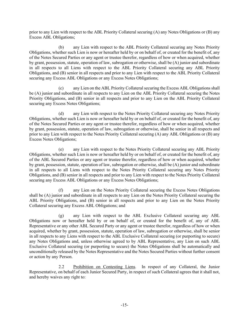-15- prior to any Lien with respect to the ABL Priority Collateral securing (A) any Notes Obligations or (B) any Excess ABL Obligations; (b) any Lien with respect to the ABL Priority Collateral securing any Notes Priority Obligations, whether such Lien is now or hereafter held by or on behalf of, or created for the benefit of, any of the Notes Secured Parties or any agent or trustee therefor, regardless of how or when acquired, whether by grant, possession, statute, operation of law, subrogation or otherwise, shall be (A) junior and subordinate in all respects to all Liens with respect to the ABL Priority Collateral securing any ABL Priority Obligations, and (B) senior in all respects and prior to any Lien with respect to the ABL Priority Collateral securing any Excess ABL Obligations or any Excess Notes Obligations; (c) any Lien on the ABL Priority Collateral securing the Excess ABL Obligations shall be (A) junior and subordinate in all respects to any Lien on the ABL Priority Collateral securing the Notes Priority Obligations, and (B) senior in all respects and prior to any Lien on the ABL Priority Collateral securing any Excess Notes Obligations; (d) any Lien with respect to the Notes Priority Collateral securing any Notes Priority Obligations, whether such Lien is now or hereafter held by or on behalf of, or created for the benefit of, any of the Notes Secured Parties or any agent or trustee therefor, regardless of how or when acquired, whether by grant, possession, statute, operation of law, subrogation or otherwise, shall be senior in all respects and prior to any Lien with respect to the Notes Priority Collateral securing (A) any ABL Obligations or (B) any Excess Notes Obligations; (e) any Lien with respect to the Notes Priority Collateral securing any ABL Priority Obligations, whether such Lien is now or hereafter held by or on behalf of, or created for the benefit of, any of the ABL Secured Parties or any agent or trustee therefor, regardless of how or when acquired, whether by grant, possession, statute, operation of law, subrogation or otherwise, shall be (A) junior and subordinate in all respects to all Liens with respect to the Notes Priority Collateral securing any Notes Priority Obligations, and (B) senior in all respects and prior to any Lien with respect to the Notes Priority Collateral securing any Excess ABL Obligations or any Excess Notes Obligations; (f) any Lien on the Notes Priority Collateral securing the Excess Notes Obligations shall be (A) junior and subordinate in all respects to any Lien on the Notes Priority Collateral securing the ABL Priority Obligations, and (B) senior in all respects and prior to any Lien on the Notes Priority Collateral securing any Excess ABL Obligations; and (g) any Lien with respect to the ABL Exclusive Collateral securing any ABL Obligations now or hereafter held by or on behalf of, or created for the benefit of, any of ABL Representative or any other ABL Secured Party or any agent or trustee therefor, regardless of how or when acquired, whether by grant, possession, statute, operation of law, subrogation or otherwise, shall be senior in all respects to any Liens with respect to the ABL Exclusive Collateral securing (or purporting to secure) any Notes Obligations and, unless otherwise agreed to by ABL Representative, any Lien on such ABL Exclusive Collateral securing (or purporting to secure) the Notes Obligations shall be automatically and unconditionally released by the Notes Representative and the Notes Secured Parties without further consent or action by any Person. 2.2 Prohibition on Contesting Liens. In respect of any Collateral, the Junior Representative, on behalf of each Junior Secured Party, in respect of such Collateral agrees that it shall not, and hereby waives any right to: