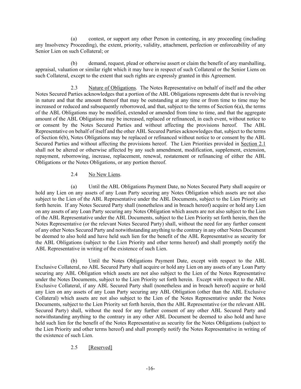 -16- (a) contest, or support any other Person in contesting, in any proceeding (including any Insolvency Proceeding), the extent, priority, validity, attachment, perfection or enforceability of any Senior Lien on such Collateral; or (b) demand, request, plead or otherwise assert or claim the benefit of any marshalling, appraisal, valuation or similar right which it may have in respect of such Collateral or the Senior Liens on such Collateral, except to the extent that such rights are expressly granted in this Agreement. 2.3 Nature of Obligations. The Notes Representative on behalf of itself and the other Notes Secured Parties acknowledges that a portion of the ABL Obligations represents debt that is revolving in nature and that the amount thereof that may be outstanding at any time or from time to time may be increased or reduced and subsequently reborrowed, and that, subject to the terms of Section 6(a), the terms of the ABL Obligations may be modified, extended or amended from time to time, and that the aggregate amount of the ABL Obligations may be increased, replaced or refinanced, in each event, without notice to or consent by the Notes Secured Parties and without affecting the provisions hereof. The ABL Representative on behalf of itself and the other ABL Secured Parties acknowledges that, subject to the terms of Section 6(b), Notes Obligations may be replaced or refinanced without notice to or consent by the ABL Secured Parties and without affecting the provisions hereof. The Lien Priorities provided in Section 2.1 shall not be altered or otherwise affected by any such amendment, modification, supplement, extension, repayment, reborrowing, increase, replacement, renewal, restatement or refinancing of either the ABL Obligations or the Notes Obligations, or any portion thereof. 2.4 No New Liens. (a) Until the ABL Obligations Payment Date, no Notes Secured Party shall acquire or hold any Lien on any assets of any Loan Party securing any Notes Obligation which assets are not also subject to the Lien of the ABL Representative under the ABL Documents, subject to the Lien Priority set forth herein. If any Notes Secured Party shall (nonetheless and in breach hereof) acquire or hold any Lien on any assets of any Loan Party securing any Notes Obligation which assets are not also subject to the Lien of the ABL Representative under the ABL Documents, subject to the Lien Priority set forth herein, then the Notes Representative (or the relevant Notes Secured Party) shall, without the need for any further consent of any other Notes Secured Party and notwithstanding anything to the contrary in any other Notes Document be deemed to also hold and have held such lien for the benefit of the ABL Representative as security for the ABL Obligations (subject to the Lien Priority and other terms hereof) and shall promptly notify the ABL Representative in writing of the existence of such Lien. (b) Until the Notes Obligations Payment Date, except with respect to the ABL Exclusive Collateral, no ABL Secured Party shall acquire or hold any Lien on any assets of any Loan Party securing any ABL Obligation which assets are not also subject to the Lien of the Notes Representative under the Notes Documents, subject to the Lien Priority set forth herein. Except with respect to the ABL Exclusive Collateral, if any ABL Secured Party shall (nonetheless and in breach hereof) acquire or hold any Lien on any assets of any Loan Party securing any ABL Obligation (other than the ABL Exclusive Collateral) which assets are not also subject to the Lien of the Notes Representative under the Notes Documents, subject to the Lien Priority set forth herein, then the ABL Representative (or the relevant ABL Secured Party) shall, without the need for any further consent of any other ABL Secured Party and notwithstanding anything to the contrary in any other ABL Document be deemed to also hold and have held such lien for the benefit of the Notes Representative as security for the Notes Obligations (subject to the Lien Priority and other terms hereof) and shall promptly notify the Notes Representative in writing of the existence of such Lien. 2.5 [Reserved]