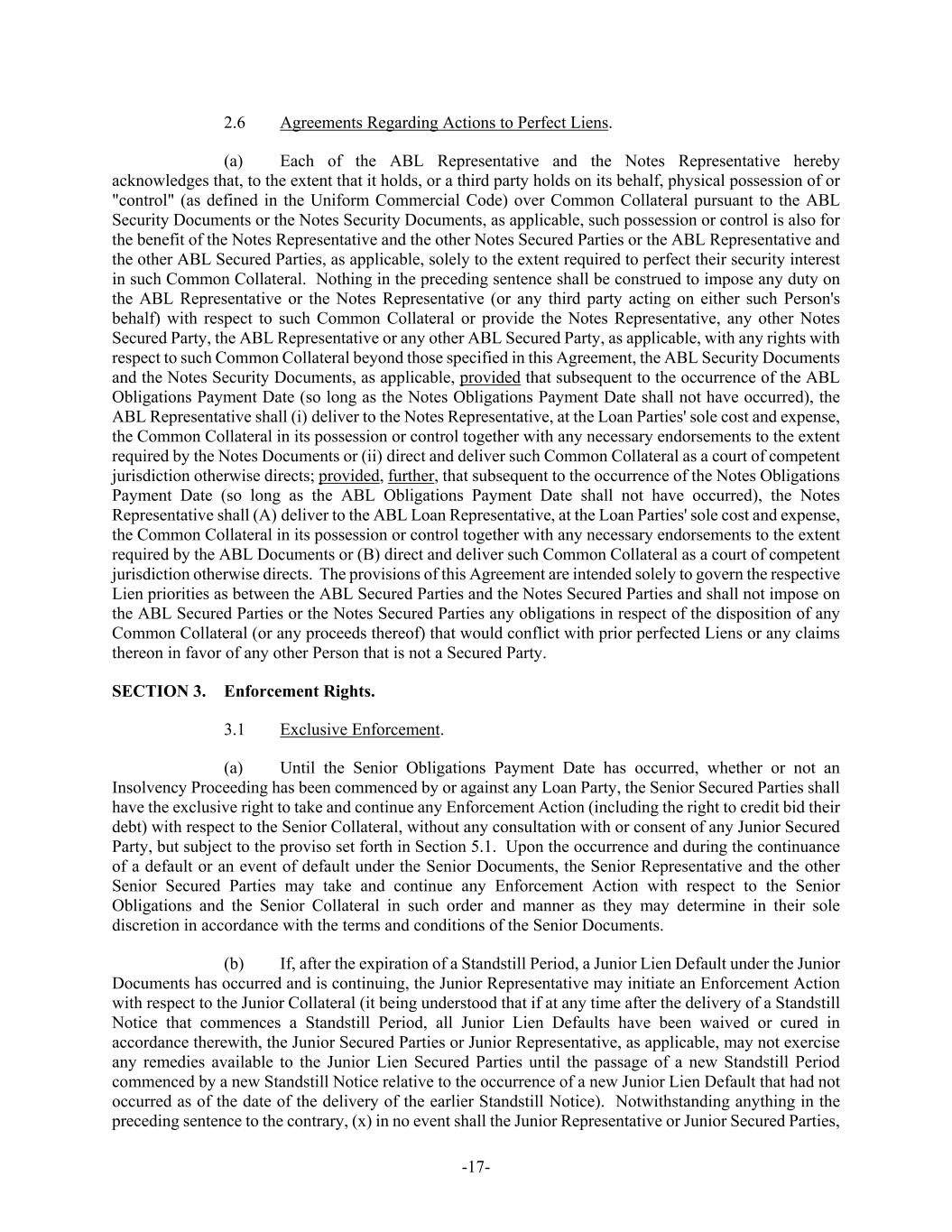 -17- 2.6 Agreements Regarding Actions to Perfect Liens. (a) Each of the ABL Representative and the Notes Representative hereby acknowledges that, to the extent that it holds, or a third party holds on its behalf, physical possession of or "control" (as defined in the Uniform Commercial Code) over Common Collateral pursuant to the ABL Security Documents or the Notes Security Documents, as applicable, such possession or control is also for the benefit of the Notes Representative and the other Notes Secured Parties or the ABL Representative and the other ABL Secured Parties, as applicable, solely to the extent required to perfect their security interest in such Common Collateral. Nothing in the preceding sentence shall be construed to impose any duty on the ABL Representative or the Notes Representative (or any third party acting on either such Person's behalf) with respect to such Common Collateral or provide the Notes Representative, any other Notes Secured Party, the ABL Representative or any other ABL Secured Party, as applicable, with any rights with respect to such Common Collateral beyond those specified in this Agreement, the ABL Security Documents and the Notes Security Documents, as applicable, provided that subsequent to the occurrence of the ABL Obligations Payment Date (so long as the Notes Obligations Payment Date shall not have occurred), the ABL Representative shall (i) deliver to the Notes Representative, at the Loan Parties' sole cost and expense, the Common Collateral in its possession or control together with any necessary endorsements to the extent required by the Notes Documents or (ii) direct and deliver such Common Collateral as a court of competent jurisdiction otherwise directs; provided, further, that subsequent to the occurrence of the Notes Obligations Payment Date (so long as the ABL Obligations Payment Date shall not have occurred), the Notes Representative shall (A) deliver to the ABL Loan Representative, at the Loan Parties' sole cost and expense, the Common Collateral in its possession or control together with any necessary endorsements to the extent required by the ABL Documents or (B) direct and deliver such Common Collateral as a court of competent jurisdiction otherwise directs. The provisions of this Agreement are intended solely to govern the respective Lien priorities as between the ABL Secured Parties and the Notes Secured Parties and shall not impose on the ABL Secured Parties or the Notes Secured Parties any obligations in respect of the disposition of any Common Collateral (or any proceeds thereof) that would conflict with prior perfected Liens or any claims thereon in favor of any other Person that is not a Secured Party. SECTION 3. Enforcement Rights. 3.1 Exclusive Enforcement. (a) Until the Senior Obligations Payment Date has occurred, whether or not an Insolvency Proceeding has been commenced by or against any Loan Party, the Senior Secured Parties shall have the exclusive right to take and continue any Enforcement Action (including the right to credit bid their debt) with respect to the Senior Collateral, without any consultation with or consent of any Junior Secured Party, but subject to the proviso set forth in Section 5.1. Upon the occurrence and during the continuance of a default or an event of default under the Senior Documents, the Senior Representative and the other Senior Secured Parties may take and continue any Enforcement Action with respect to the Senior Obligations and the Senior Collateral in such order and manner as they may determine in their sole discretion in accordance with the terms and conditions of the Senior Documents. (b) If, after the expiration of a Standstill Period, a Junior Lien Default under the Junior Documents has occurred and is continuing, the Junior Representative may initiate an Enforcement Action with respect to the Junior Collateral (it being understood that if at any time after the delivery of a Standstill Notice that commences a Standstill Period, all Junior Lien Defaults have been waived or cured in accordance therewith, the Junior Secured Parties or Junior Representative, as applicable, may not exercise any remedies available to the Junior Lien Secured Parties until the passage of a new Standstill Period commenced by a new Standstill Notice relative to the occurrence of a new Junior Lien Default that had not occurred as of the date of the delivery of the earlier Standstill Notice). Notwithstanding anything in the preceding sentence to the contrary, (x) in no event shall the Junior Representative or Junior Secured Parties,