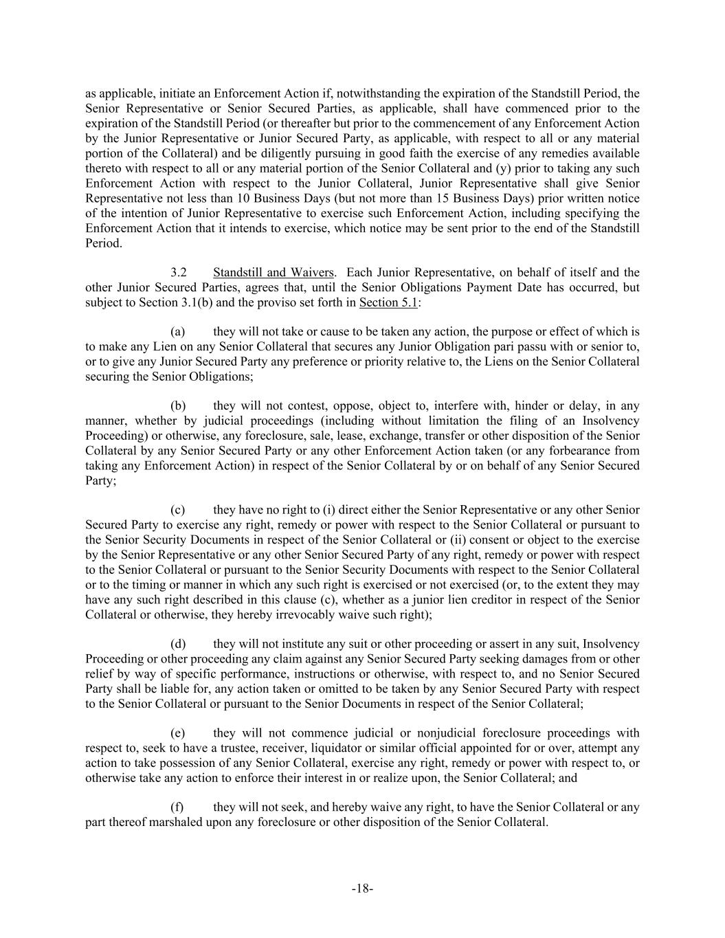 -18- as applicable, initiate an Enforcement Action if, notwithstanding the expiration of the Standstill Period, the Senior Representative or Senior Secured Parties, as applicable, shall have commenced prior to the expiration of the Standstill Period (or thereafter but prior to the commencement of any Enforcement Action by the Junior Representative or Junior Secured Party, as applicable, with respect to all or any material portion of the Collateral) and be diligently pursuing in good faith the exercise of any remedies available thereto with respect to all or any material portion of the Senior Collateral and (y) prior to taking any such Enforcement Action with respect to the Junior Collateral, Junior Representative shall give Senior Representative not less than 10 Business Days (but not more than 15 Business Days) prior written notice of the intention of Junior Representative to exercise such Enforcement Action, including specifying the Enforcement Action that it intends to exercise, which notice may be sent prior to the end of the Standstill Period. 3.2 Standstill and Waivers. Each Junior Representative, on behalf of itself and the other Junior Secured Parties, agrees that, until the Senior Obligations Payment Date has occurred, but subject to Section 3.1(b) and the proviso set forth in Section 5.1: (a) they will not take or cause to be taken any action, the purpose or effect of which is to make any Lien on any Senior Collateral that secures any Junior Obligation pari passu with or senior to, or to give any Junior Secured Party any preference or priority relative to, the Liens on the Senior Collateral securing the Senior Obligations; (b) they will not contest, oppose, object to, interfere with, hinder or delay, in any manner, whether by judicial proceedings (including without limitation the filing of an Insolvency Proceeding) or otherwise, any foreclosure, sale, lease, exchange, transfer or other disposition of the Senior Collateral by any Senior Secured Party or any other Enforcement Action taken (or any forbearance from taking any Enforcement Action) in respect of the Senior Collateral by or on behalf of any Senior Secured Party; (c) they have no right to (i) direct either the Senior Representative or any other Senior Secured Party to exercise any right, remedy or power with respect to the Senior Collateral or pursuant to the Senior Security Documents in respect of the Senior Collateral or (ii) consent or object to the exercise by the Senior Representative or any other Senior Secured Party of any right, remedy or power with respect to the Senior Collateral or pursuant to the Senior Security Documents with respect to the Senior Collateral or to the timing or manner in which any such right is exercised or not exercised (or, to the extent they may have any such right described in this clause (c), whether as a junior lien creditor in respect of the Senior Collateral or otherwise, they hereby irrevocably waive such right); (d) they will not institute any suit or other proceeding or assert in any suit, Insolvency Proceeding or other proceeding any claim against any Senior Secured Party seeking damages from or other relief by way of specific performance, instructions or otherwise, with respect to, and no Senior Secured Party shall be liable for, any action taken or omitted to be taken by any Senior Secured Party with respect to the Senior Collateral or pursuant to the Senior Documents in respect of the Senior Collateral; (e) they will not commence judicial or nonjudicial foreclosure proceedings with respect to, seek to have a trustee, receiver, liquidator or similar official appointed for or over, attempt any action to take possession of any Senior Collateral, exercise any right, remedy or power with respect to, or otherwise take any action to enforce their interest in or realize upon, the Senior Collateral; and (f) they will not seek, and hereby waive any right, to have the Senior Collateral or any part thereof marshaled upon any foreclosure or other disposition of the Senior Collateral.