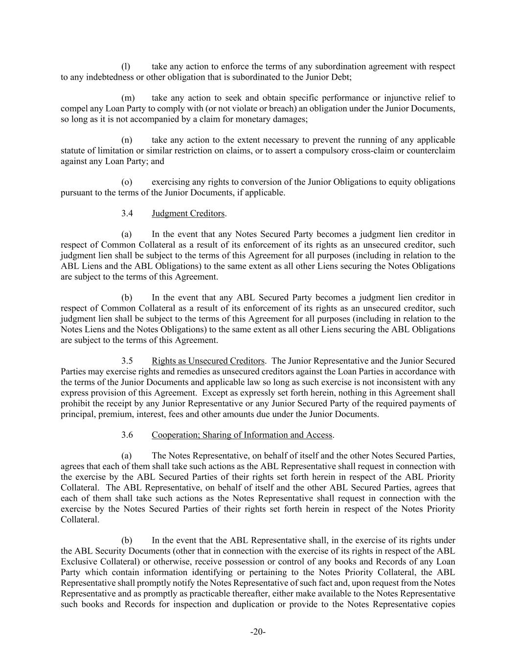 -20- (l) take any action to enforce the terms of any subordination agreement with respect to any indebtedness or other obligation that is subordinated to the Junior Debt; (m) take any action to seek and obtain specific performance or injunctive relief to compel any Loan Party to comply with (or not violate or breach) an obligation under the Junior Documents, so long as it is not accompanied by a claim for monetary damages; (n) take any action to the extent necessary to prevent the running of any applicable statute of limitation or similar restriction on claims, or to assert a compulsory cross-claim or counterclaim against any Loan Party; and (o) exercising any rights to conversion of the Junior Obligations to equity obligations pursuant to the terms of the Junior Documents, if applicable. 3.4 Judgment Creditors. (a) In the event that any Notes Secured Party becomes a judgment lien creditor in respect of Common Collateral as a result of its enforcement of its rights as an unsecured creditor, such judgment lien shall be subject to the terms of this Agreement for all purposes (including in relation to the ABL Liens and the ABL Obligations) to the same extent as all other Liens securing the Notes Obligations are subject to the terms of this Agreement. (b) In the event that any ABL Secured Party becomes a judgment lien creditor in respect of Common Collateral as a result of its enforcement of its rights as an unsecured creditor, such judgment lien shall be subject to the terms of this Agreement for all purposes (including in relation to the Notes Liens and the Notes Obligations) to the same extent as all other Liens securing the ABL Obligations are subject to the terms of this Agreement. 3.5 Rights as Unsecured Creditors. The Junior Representative and the Junior Secured Parties may exercise rights and remedies as unsecured creditors against the Loan Parties in accordance with the terms of the Junior Documents and applicable law so long as such exercise is not inconsistent with any express provision of this Agreement. Except as expressly set forth herein, nothing in this Agreement shall prohibit the receipt by any Junior Representative or any Junior Secured Party of the required payments of principal, premium, interest, fees and other amounts due under the Junior Documents. 3.6 Cooperation; Sharing of Information and Access. (a) The Notes Representative, on behalf of itself and the other Notes Secured Parties, agrees that each of them shall take such actions as the ABL Representative shall request in connection with the exercise by the ABL Secured Parties of their rights set forth herein in respect of the ABL Priority Collateral. The ABL Representative, on behalf of itself and the other ABL Secured Parties, agrees that each of them shall take such actions as the Notes Representative shall request in connection with the exercise by the Notes Secured Parties of their rights set forth herein in respect of the Notes Priority Collateral. (b) In the event that the ABL Representative shall, in the exercise of its rights under the ABL Security Documents (other that in connection with the exercise of its rights in respect of the ABL Exclusive Collateral) or otherwise, receive possession or control of any books and Records of any Loan Party which contain information identifying or pertaining to the Notes Priority Collateral, the ABL Representative shall promptly notify the Notes Representative of such fact and, upon request from the Notes Representative and as promptly as practicable thereafter, either make available to the Notes Representative such books and Records for inspection and duplication or provide to the Notes Representative copies