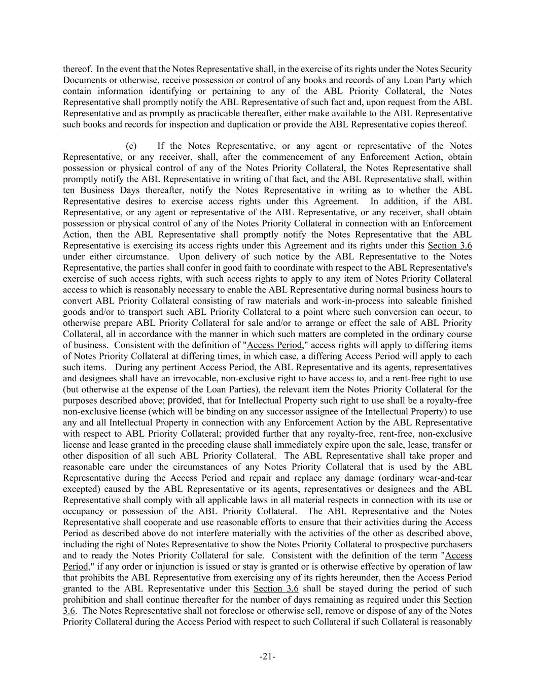 -21- thereof. In the event that the Notes Representative shall, in the exercise of its rights under the Notes Security Documents or otherwise, receive possession or control of any books and records of any Loan Party which contain information identifying or pertaining to any of the ABL Priority Collateral, the Notes Representative shall promptly notify the ABL Representative of such fact and, upon request from the ABL Representative and as promptly as practicable thereafter, either make available to the ABL Representative such books and records for inspection and duplication or provide the ABL Representative copies thereof. (c) If the Notes Representative, or any agent or representative of the Notes Representative, or any receiver, shall, after the commencement of any Enforcement Action, obtain possession or physical control of any of the Notes Priority Collateral, the Notes Representative shall promptly notify the ABL Representative in writing of that fact, and the ABL Representative shall, within ten Business Days thereafter, notify the Notes Representative in writing as to whether the ABL Representative desires to exercise access rights under this Agreement. In addition, if the ABL Representative, or any agent or representative of the ABL Representative, or any receiver, shall obtain possession or physical control of any of the Notes Priority Collateral in connection with an Enforcement Action, then the ABL Representative shall promptly notify the Notes Representative that the ABL Representative is exercising its access rights under this Agreement and its rights under this Section 3.6 under either circumstance. Upon delivery of such notice by the ABL Representative to the Notes Representative, the parties shall confer in good faith to coordinate with respect to the ABL Representative's exercise of such access rights, with such access rights to apply to any item of Notes Priority Collateral access to which is reasonably necessary to enable the ABL Representative during normal business hours to convert ABL Priority Collateral consisting of raw materials and work-in-process into saleable finished goods and/or to transport such ABL Priority Collateral to a point where such conversion can occur, to otherwise prepare ABL Priority Collateral for sale and/or to arrange or effect the sale of ABL Priority Collateral, all in accordance with the manner in which such matters are completed in the ordinary course of business. Consistent with the definition of "Access Period," access rights will apply to differing items of Notes Priority Collateral at differing times, in which case, a differing Access Period will apply to each such items. During any pertinent Access Period, the ABL Representative and its agents, representatives and designees shall have an irrevocable, non-exclusive right to have access to, and a rent-free right to use (but otherwise at the expense of the Loan Parties), the relevant item the Notes Priority Collateral for the purposes described above; provided, that for Intellectual Property such right to use shall be a royalty-free non-exclusive license (which will be binding on any successor assignee of the Intellectual Property) to use any and all Intellectual Property in connection with any Enforcement Action by the ABL Representative with respect to ABL Priority Collateral; provided further that any royalty-free, rent-free, non-exclusive license and lease granted in the preceding clause shall immediately expire upon the sale, lease, transfer or other disposition of all such ABL Priority Collateral. The ABL Representative shall take proper and reasonable care under the circumstances of any Notes Priority Collateral that is used by the ABL Representative during the Access Period and repair and replace any damage (ordinary wear-and-tear excepted) caused by the ABL Representative or its agents, representatives or designees and the ABL Representative shall comply with all applicable laws in all material respects in connection with its use or occupancy or possession of the ABL Priority Collateral. The ABL Representative and the Notes Representative shall cooperate and use reasonable efforts to ensure that their activities during the Access Period as described above do not interfere materially with the activities of the other as described above, including the right of Notes Representative to show the Notes Priority Collateral to prospective purchasers and to ready the Notes Priority Collateral for sale. Consistent with the definition of the term "Access Period," if any order or injunction is issued or stay is granted or is otherwise effective by operation of law that prohibits the ABL Representative from exercising any of its rights hereunder, then the Access Period granted to the ABL Representative under this Section 3.6 shall be stayed during the period of such prohibition and shall continue thereafter for the number of days remaining as required under this Section 3.6. The Notes Representative shall not foreclose or otherwise sell, remove or dispose of any of the Notes Priority Collateral during the Access Period with respect to such Collateral if such Collateral is reasonably