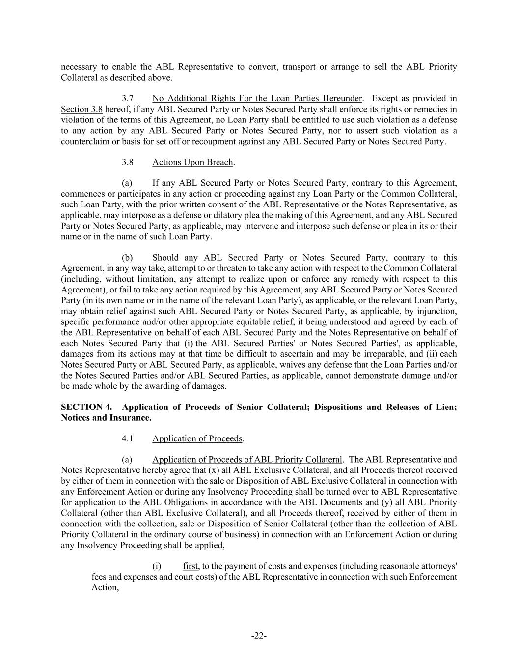 -22- necessary to enable the ABL Representative to convert, transport or arrange to sell the ABL Priority Collateral as described above. 3.7 No Additional Rights For the Loan Parties Hereunder. Except as provided in Section 3.8 hereof, if any ABL Secured Party or Notes Secured Party shall enforce its rights or remedies in violation of the terms of this Agreement, no Loan Party shall be entitled to use such violation as a defense to any action by any ABL Secured Party or Notes Secured Party, nor to assert such violation as a counterclaim or basis for set off or recoupment against any ABL Secured Party or Notes Secured Party. 3.8 Actions Upon Breach. (a) If any ABL Secured Party or Notes Secured Party, contrary to this Agreement, commences or participates in any action or proceeding against any Loan Party or the Common Collateral, such Loan Party, with the prior written consent of the ABL Representative or the Notes Representative, as applicable, may interpose as a defense or dilatory plea the making of this Agreement, and any ABL Secured Party or Notes Secured Party, as applicable, may intervene and interpose such defense or plea in its or their name or in the name of such Loan Party. (b) Should any ABL Secured Party or Notes Secured Party, contrary to this Agreement, in any way take, attempt to or threaten to take any action with respect to the Common Collateral (including, without limitation, any attempt to realize upon or enforce any remedy with respect to this Agreement), or fail to take any action required by this Agreement, any ABL Secured Party or Notes Secured Party (in its own name or in the name of the relevant Loan Party), as applicable, or the relevant Loan Party, may obtain relief against such ABL Secured Party or Notes Secured Party, as applicable, by injunction, specific performance and/or other appropriate equitable relief, it being understood and agreed by each of the ABL Representative on behalf of each ABL Secured Party and the Notes Representative on behalf of each Notes Secured Party that (i) the ABL Secured Parties' or Notes Secured Parties', as applicable, damages from its actions may at that time be difficult to ascertain and may be irreparable, and (ii) each Notes Secured Party or ABL Secured Party, as applicable, waives any defense that the Loan Parties and/or the Notes Secured Parties and/or ABL Secured Parties, as applicable, cannot demonstrate damage and/or be made whole by the awarding of damages. SECTION 4. Application of Proceeds of Senior Collateral; Dispositions and Releases of Lien; Notices and Insurance. 4.1 Application of Proceeds. (a) Application of Proceeds of ABL Priority Collateral. The ABL Representative and Notes Representative hereby agree that (x) all ABL Exclusive Collateral, and all Proceeds thereof received by either of them in connection with the sale or Disposition of ABL Exclusive Collateral in connection with any Enforcement Action or during any Insolvency Proceeding shall be turned over to ABL Representative for application to the ABL Obligations in accordance with the ABL Documents and (y) all ABL Priority Collateral (other than ABL Exclusive Collateral), and all Proceeds thereof, received by either of them in connection with the collection, sale or Disposition of Senior Collateral (other than the collection of ABL Priority Collateral in the ordinary course of business) in connection with an Enforcement Action or during any Insolvency Proceeding shall be applied, (i) first, to the payment of costs and expenses (including reasonable attorneys' fees and expenses and court costs) of the ABL Representative in connection with such Enforcement Action,