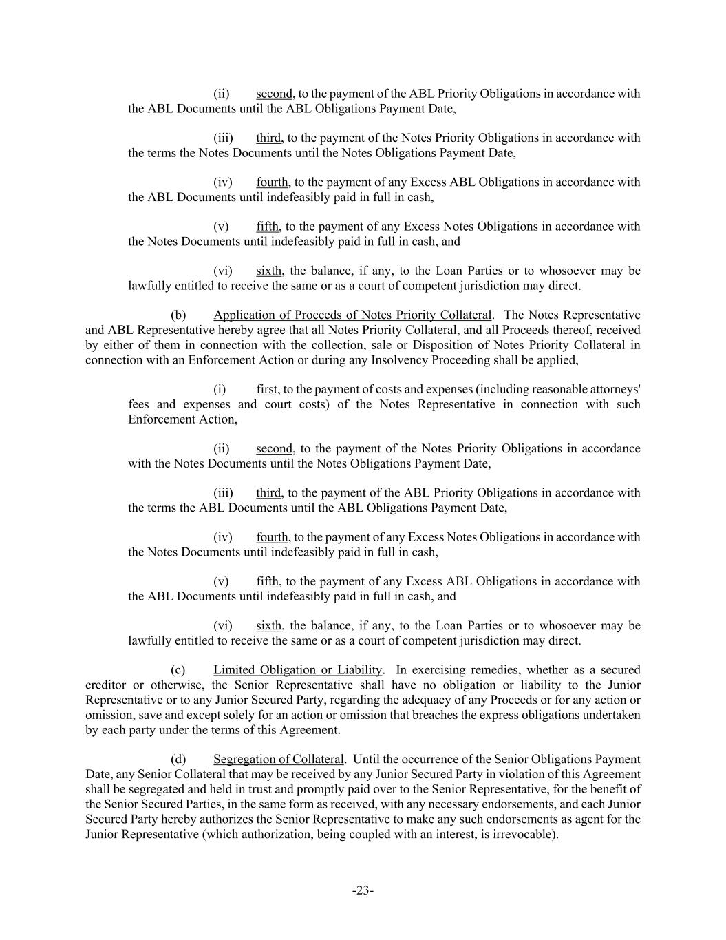 -23- (ii) second, to the payment of the ABL Priority Obligations in accordance with the ABL Documents until the ABL Obligations Payment Date, (iii) third, to the payment of the Notes Priority Obligations in accordance with the terms the Notes Documents until the Notes Obligations Payment Date, (iv) fourth, to the payment of any Excess ABL Obligations in accordance with the ABL Documents until indefeasibly paid in full in cash, (v) fifth, to the payment of any Excess Notes Obligations in accordance with the Notes Documents until indefeasibly paid in full in cash, and (vi) sixth, the balance, if any, to the Loan Parties or to whosoever may be lawfully entitled to receive the same or as a court of competent jurisdiction may direct. (b) Application of Proceeds of Notes Priority Collateral. The Notes Representative and ABL Representative hereby agree that all Notes Priority Collateral, and all Proceeds thereof, received by either of them in connection with the collection, sale or Disposition of Notes Priority Collateral in connection with an Enforcement Action or during any Insolvency Proceeding shall be applied, (i) first, to the payment of costs and expenses (including reasonable attorneys' fees and expenses and court costs) of the Notes Representative in connection with such Enforcement Action, (ii) second, to the payment of the Notes Priority Obligations in accordance with the Notes Documents until the Notes Obligations Payment Date, (iii) third, to the payment of the ABL Priority Obligations in accordance with the terms the ABL Documents until the ABL Obligations Payment Date, (iv) fourth, to the payment of any Excess Notes Obligations in accordance with the Notes Documents until indefeasibly paid in full in cash, (v) fifth, to the payment of any Excess ABL Obligations in accordance with the ABL Documents until indefeasibly paid in full in cash, and (vi) sixth, the balance, if any, to the Loan Parties or to whosoever may be lawfully entitled to receive the same or as a court of competent jurisdiction may direct. (c) Limited Obligation or Liability. In exercising remedies, whether as a secured creditor or otherwise, the Senior Representative shall have no obligation or liability to the Junior Representative or to any Junior Secured Party, regarding the adequacy of any Proceeds or for any action or omission, save and except solely for an action or omission that breaches the express obligations undertaken by each party under the terms of this Agreement. (d) Segregation of Collateral. Until the occurrence of the Senior Obligations Payment Date, any Senior Collateral that may be received by any Junior Secured Party in violation of this Agreement shall be segregated and held in trust and promptly paid over to the Senior Representative, for the benefit of the Senior Secured Parties, in the same form as received, with any necessary endorsements, and each Junior Secured Party hereby authorizes the Senior Representative to make any such endorsements as agent for the Junior Representative (which authorization, being coupled with an interest, is irrevocable).